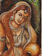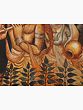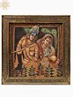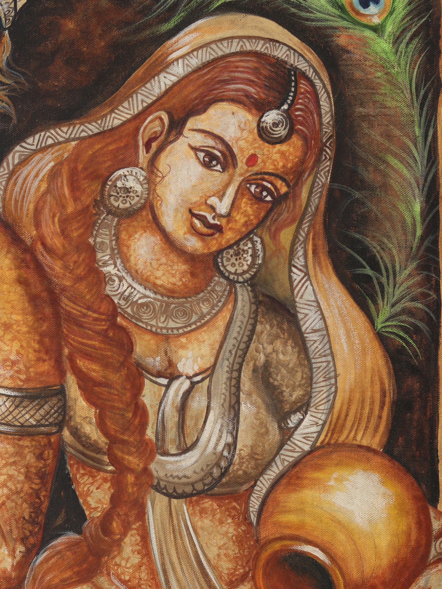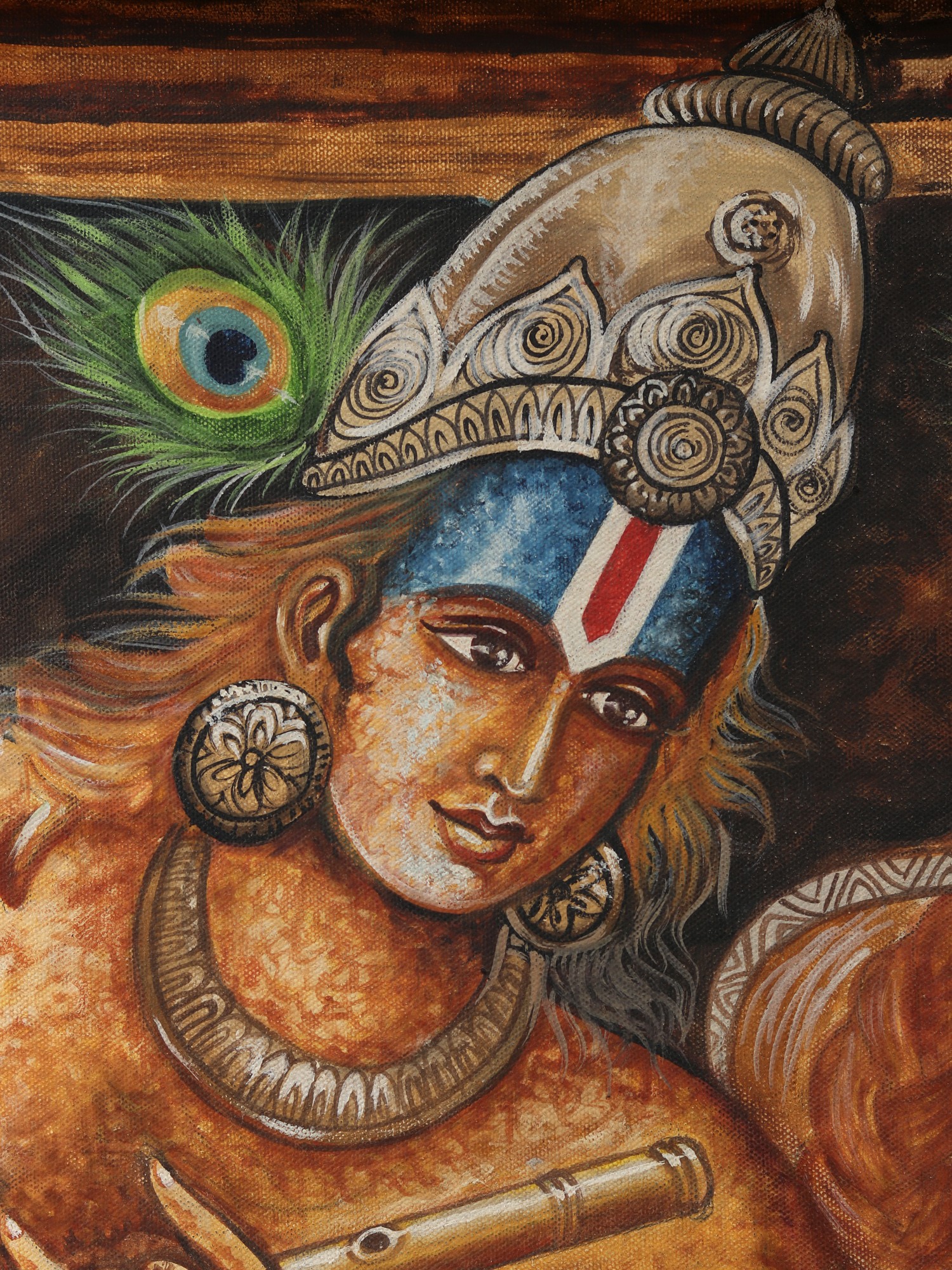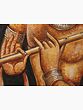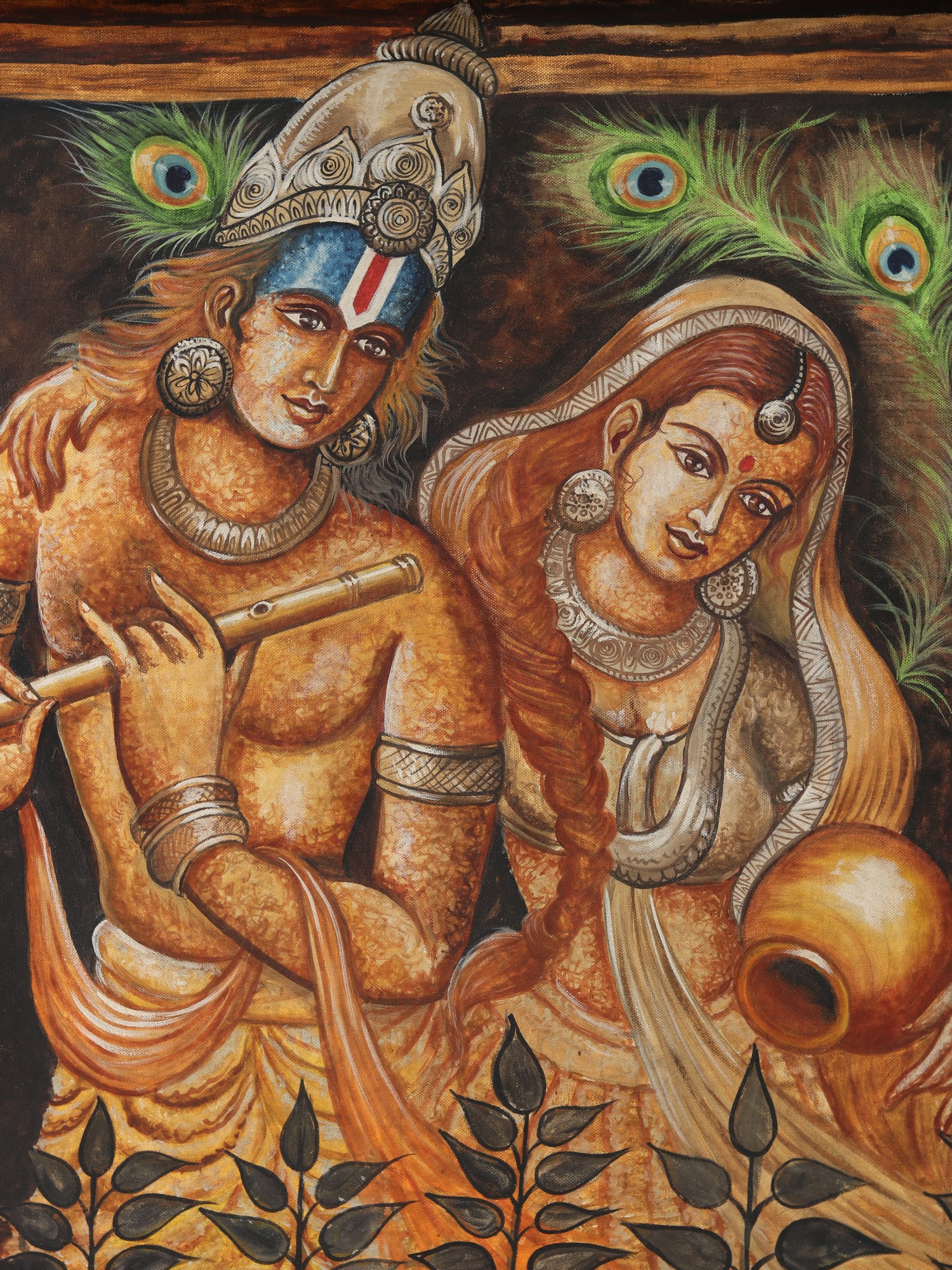 This stunning oil painting on canvas of Fluting Krishna with Radha with a carefully carved flower frame is a portal to the realm of heavenly love and spiritual magic. Krishna and Radha, rendered in deeper tones, exude a timeless atmosphere of devotion and mysticism. The silver-colored embellishments on the holy couple lend beauty and transcendence to the artwork. The hypnotic representation of peacock feathers represents grace, beauty, and eternity. This lovely painting is a portal to witnessing the divine-mortal relationship, an embodiment of divine love and eternal devotion.