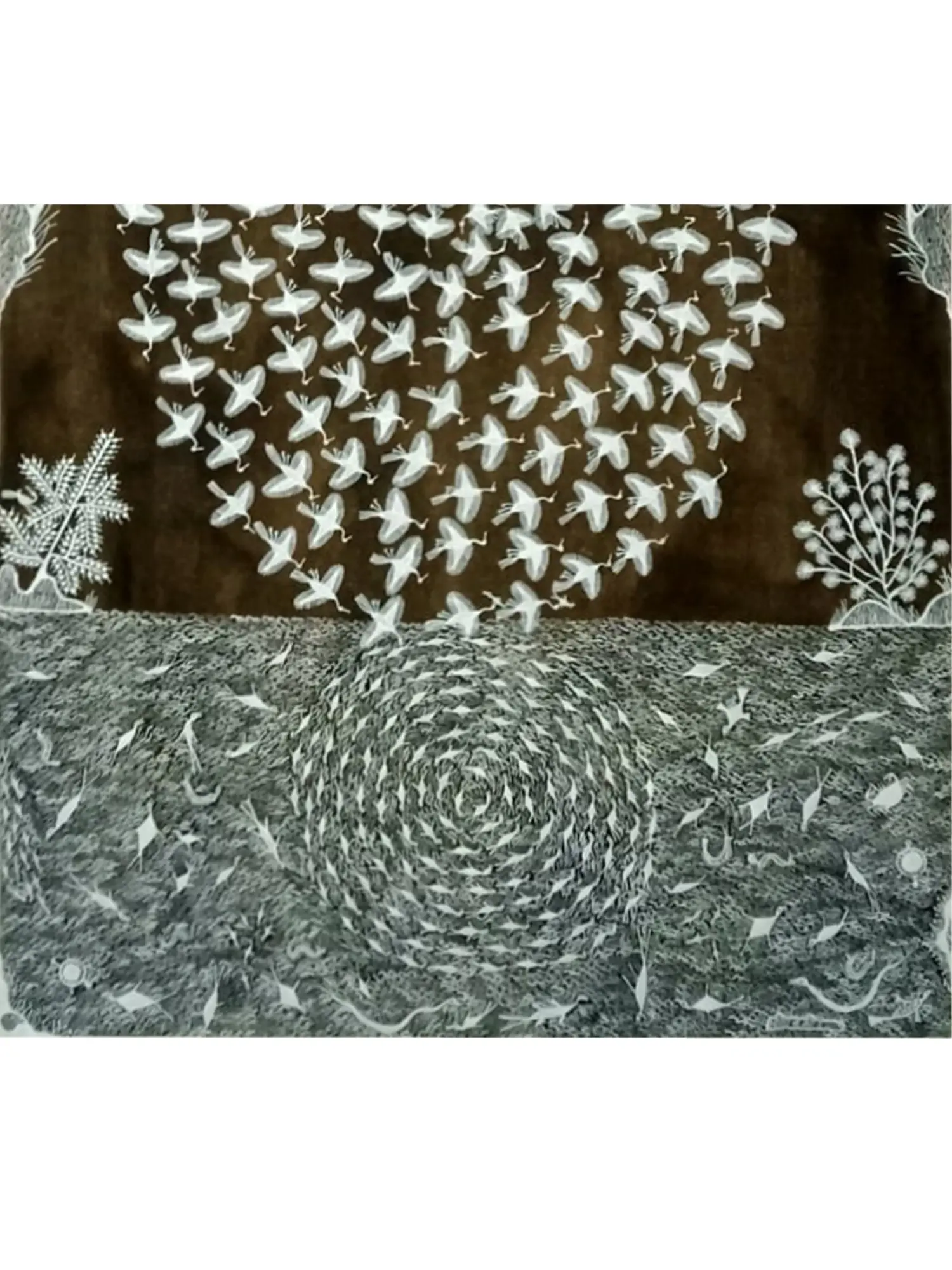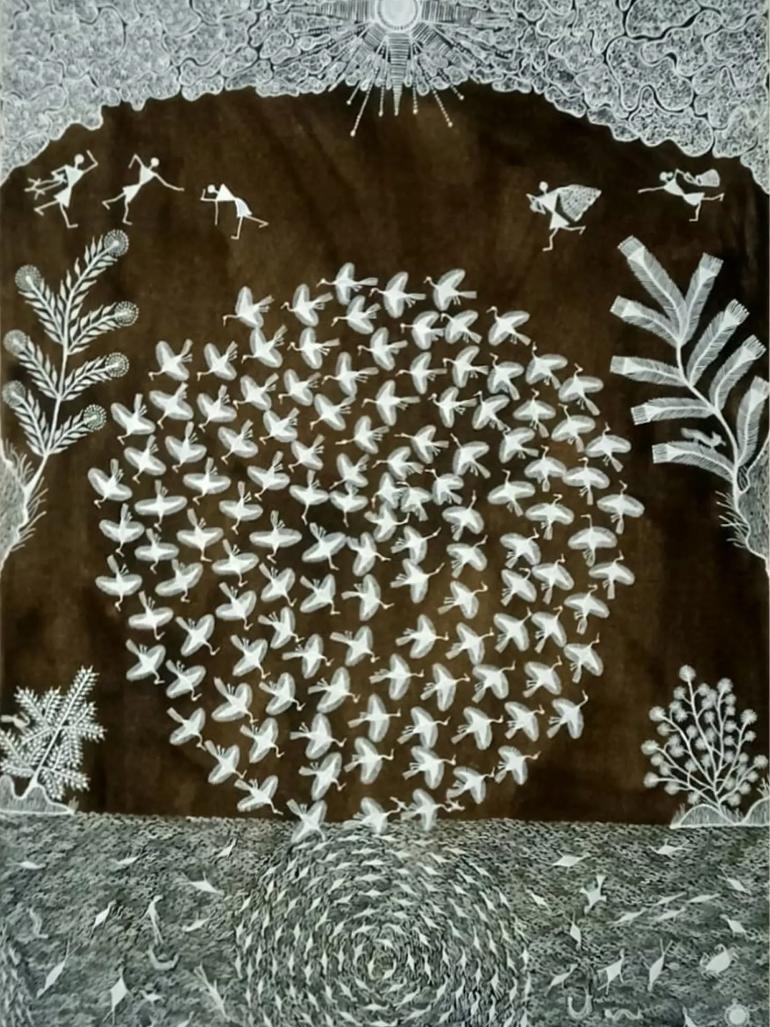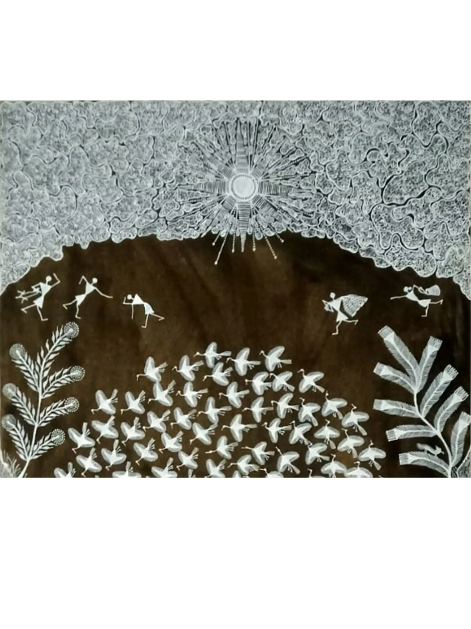 Nature’s Life - Warli Art by Pravin Mhase | Cow Dung and Acrylic on Manjarpat Cloth