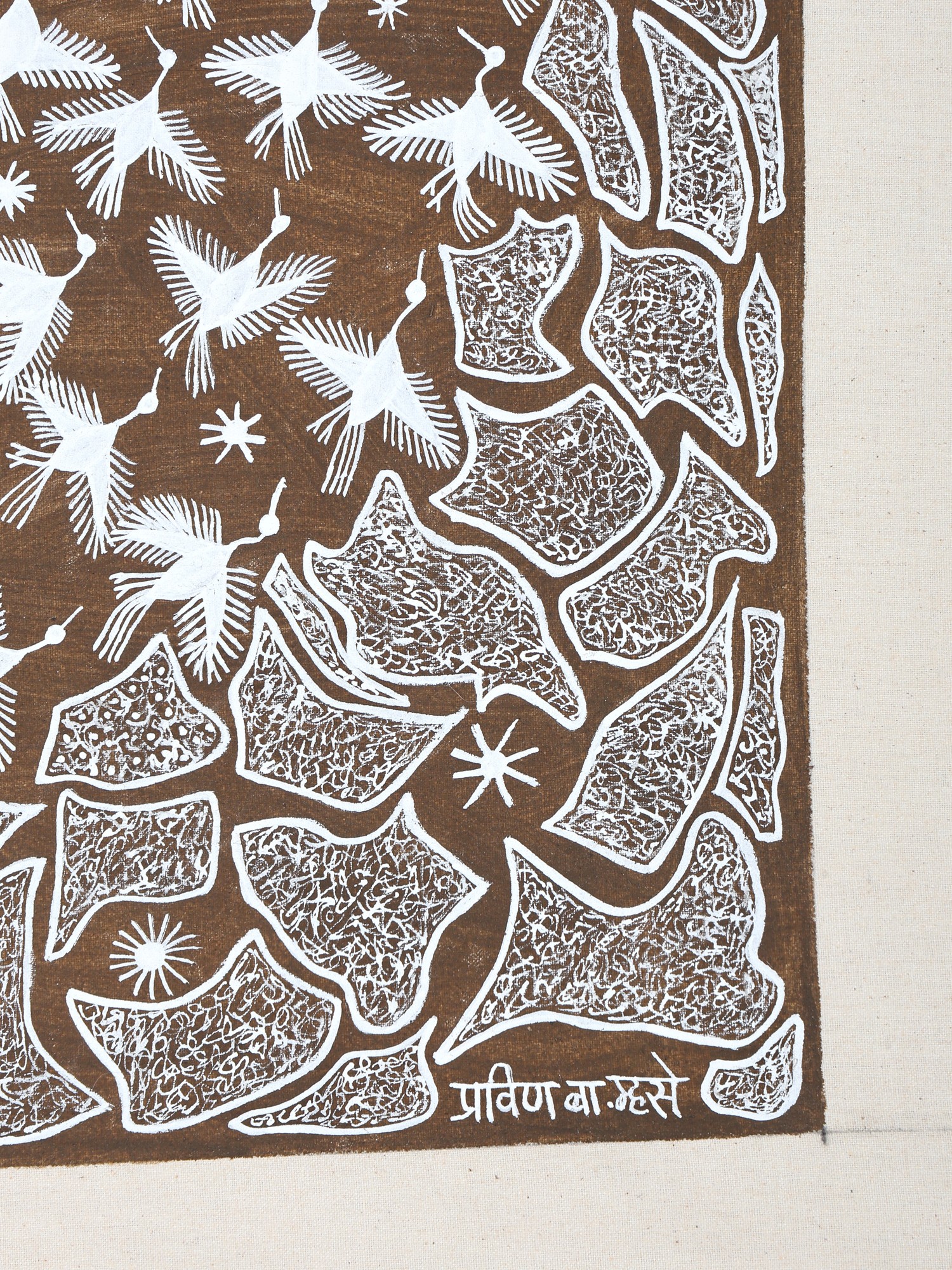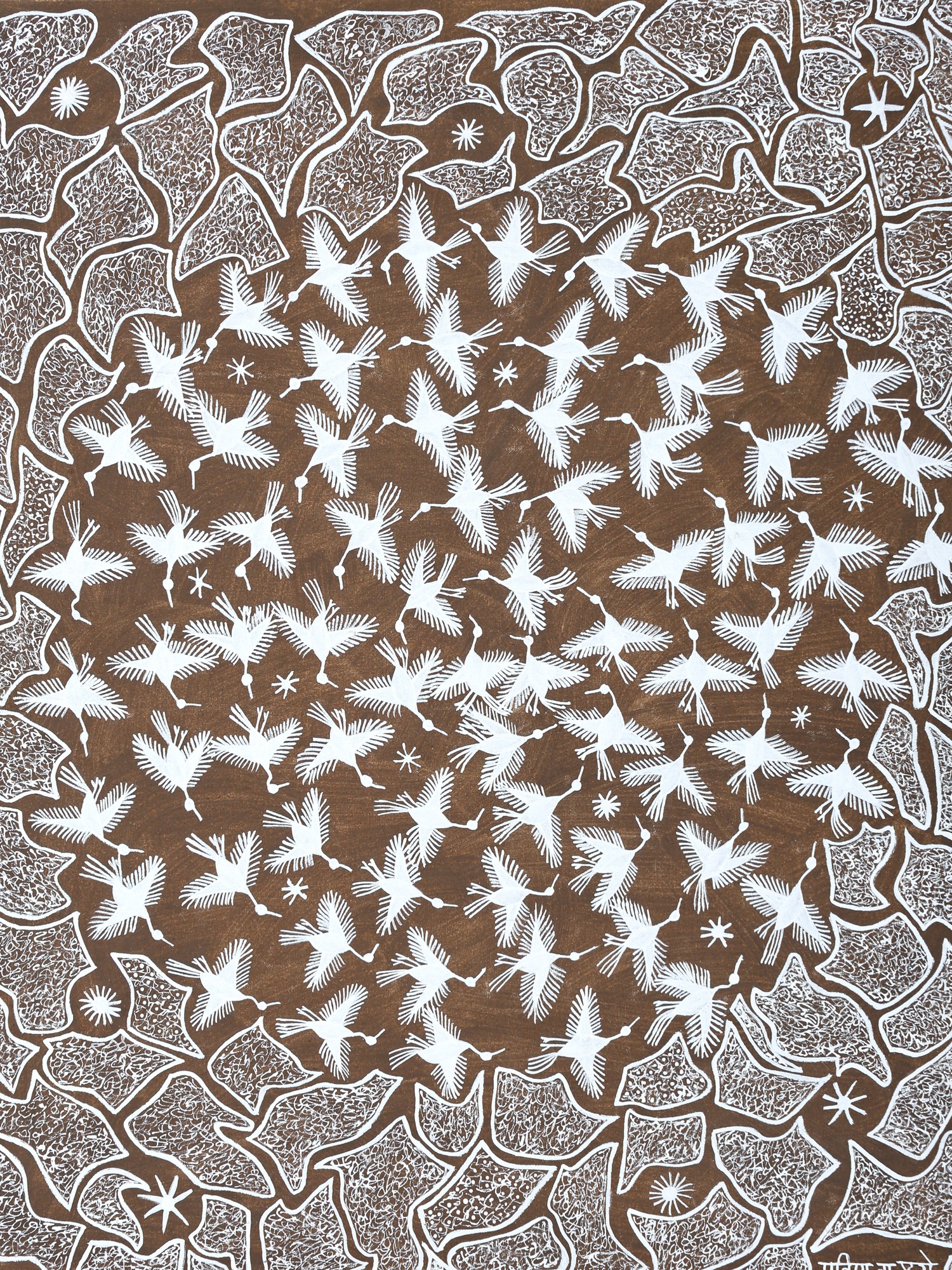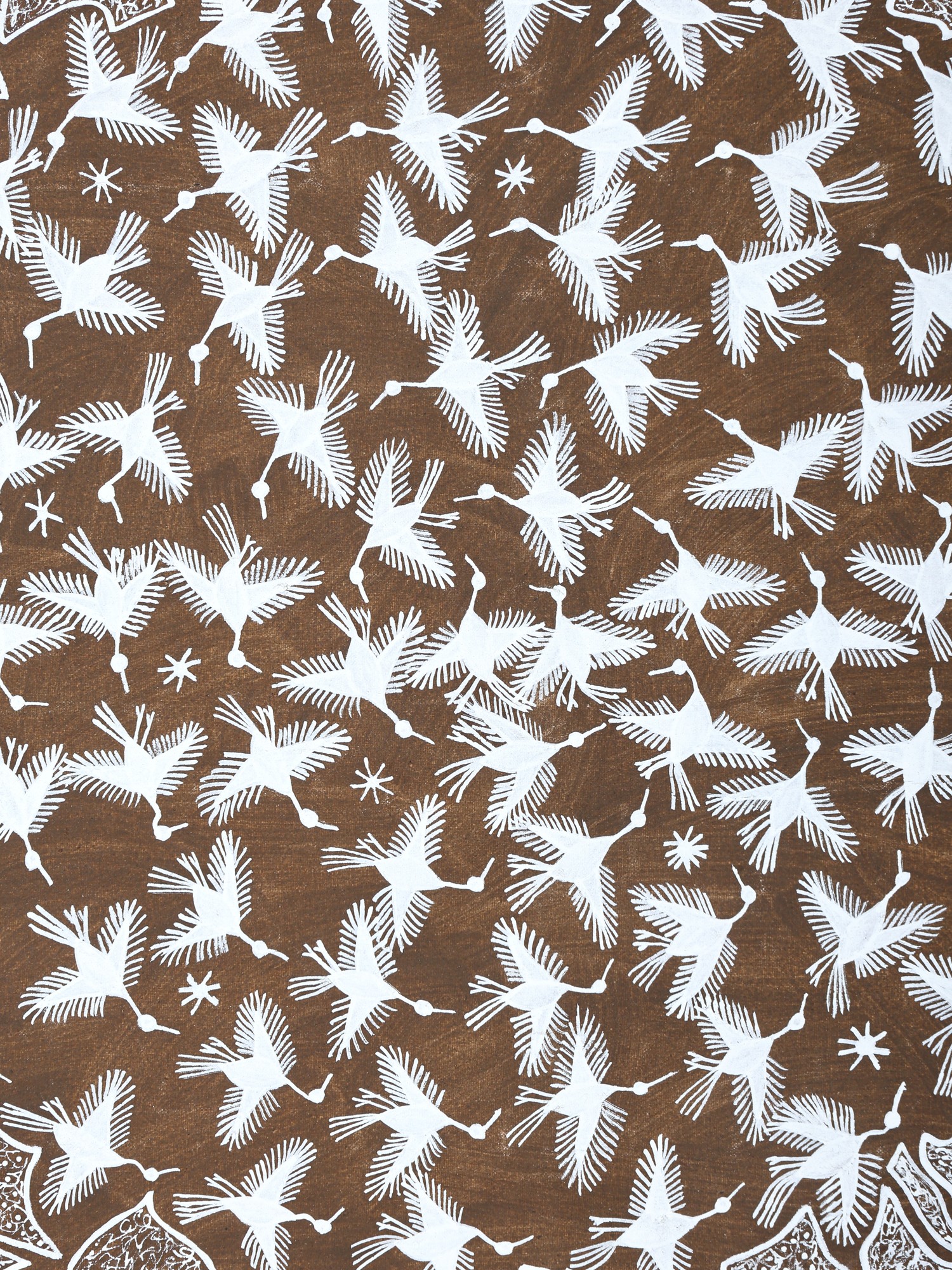 Flying Birds In Group - Warli Art | Cow Dung And Acrylic On Manjarpat Cloth | By Pravin Mhase