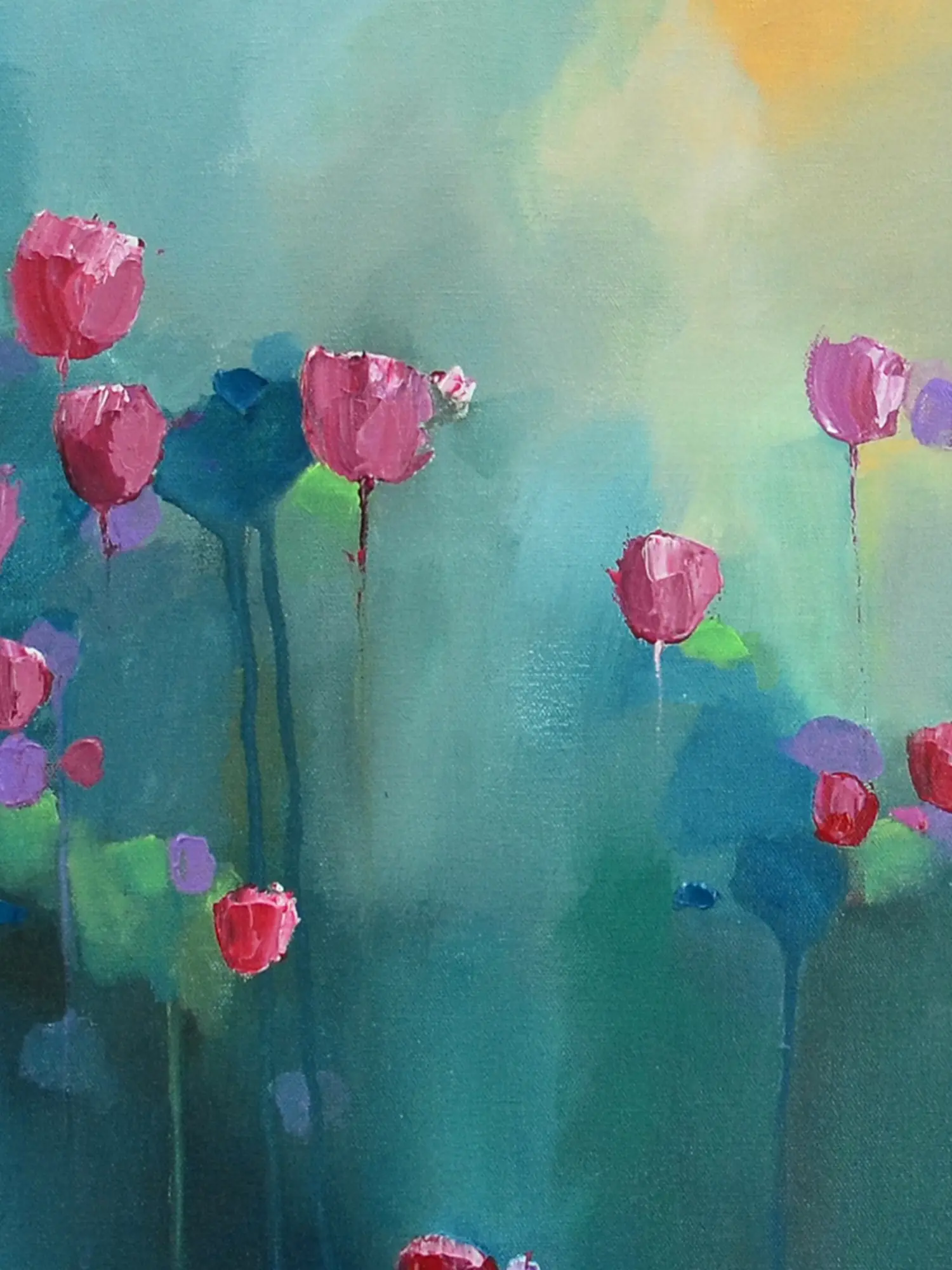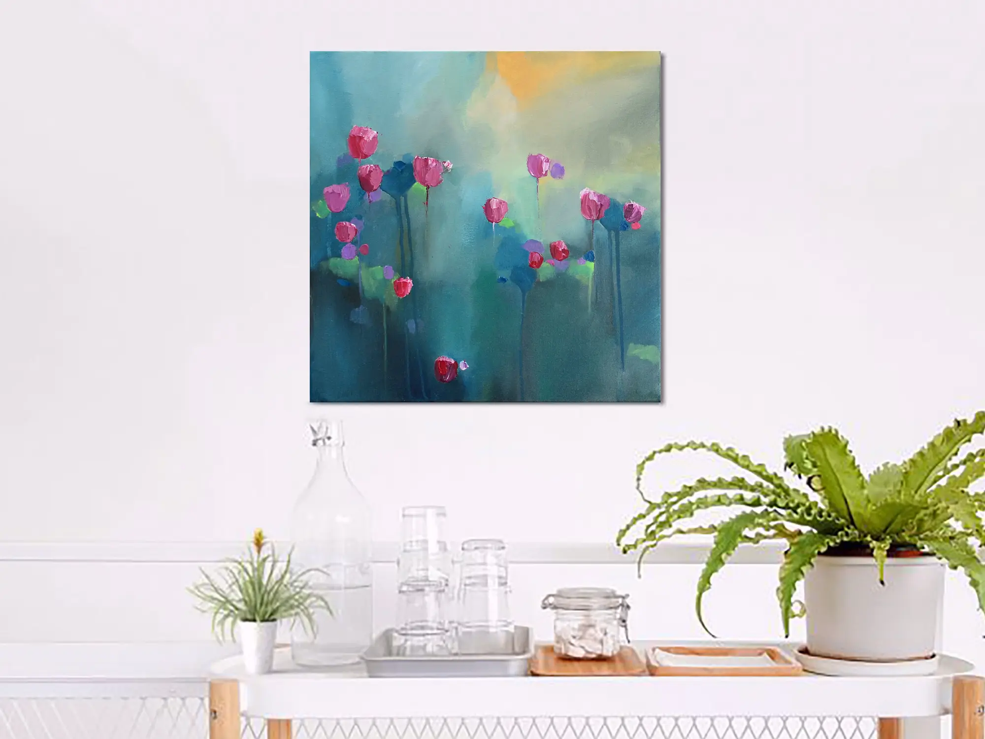 The 18x18 inch canvas is perfectly sized to make a statement without overpowering your decor. Its square format lends a sense of balance and intimacy, drawing viewers into its enchanting world. The interplay of deep teals, soft greens, and pops of vibrant pink creates a dynamic visual symphony, while the subtle hints of golden light evoke a sense of optimism and warmth.