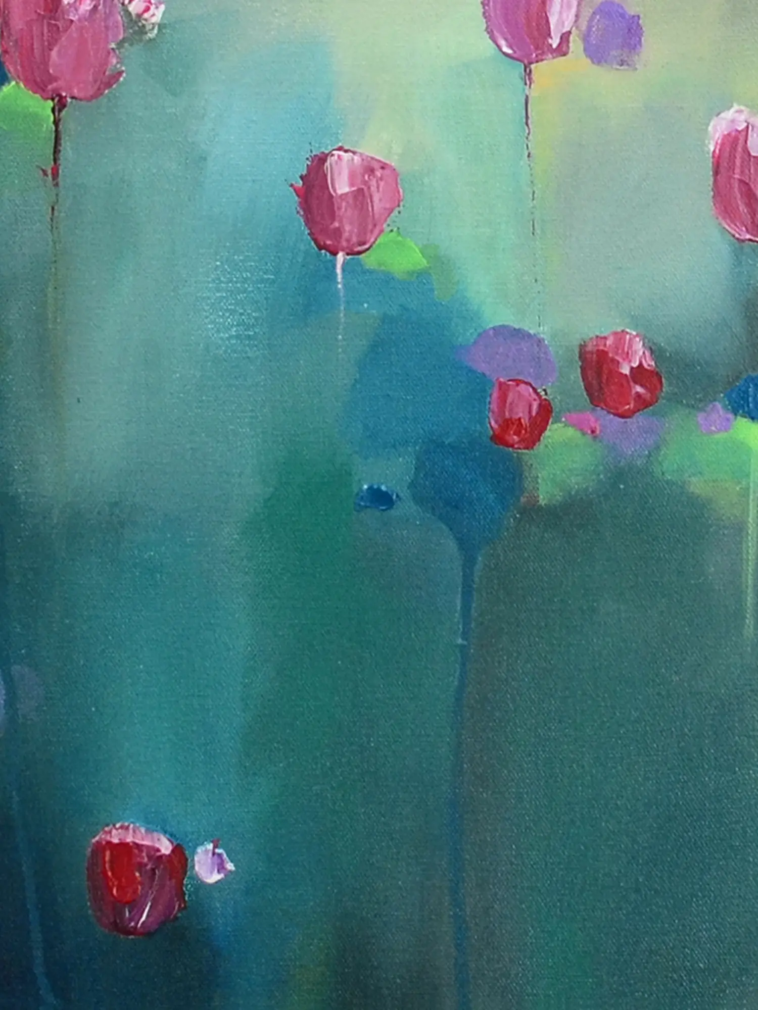 Immerse your senses in a tranquil garden oasis, where delicate blossoms emerge from a sea of verdant hues. This captivating artwork brings a breath of fresh, artistic air into your space, offering a moment of serene contemplation. Its graceful composition and vibrant yet soft palette invite you to pause and appreciate the subtle beauty of nature's fleeting moments.