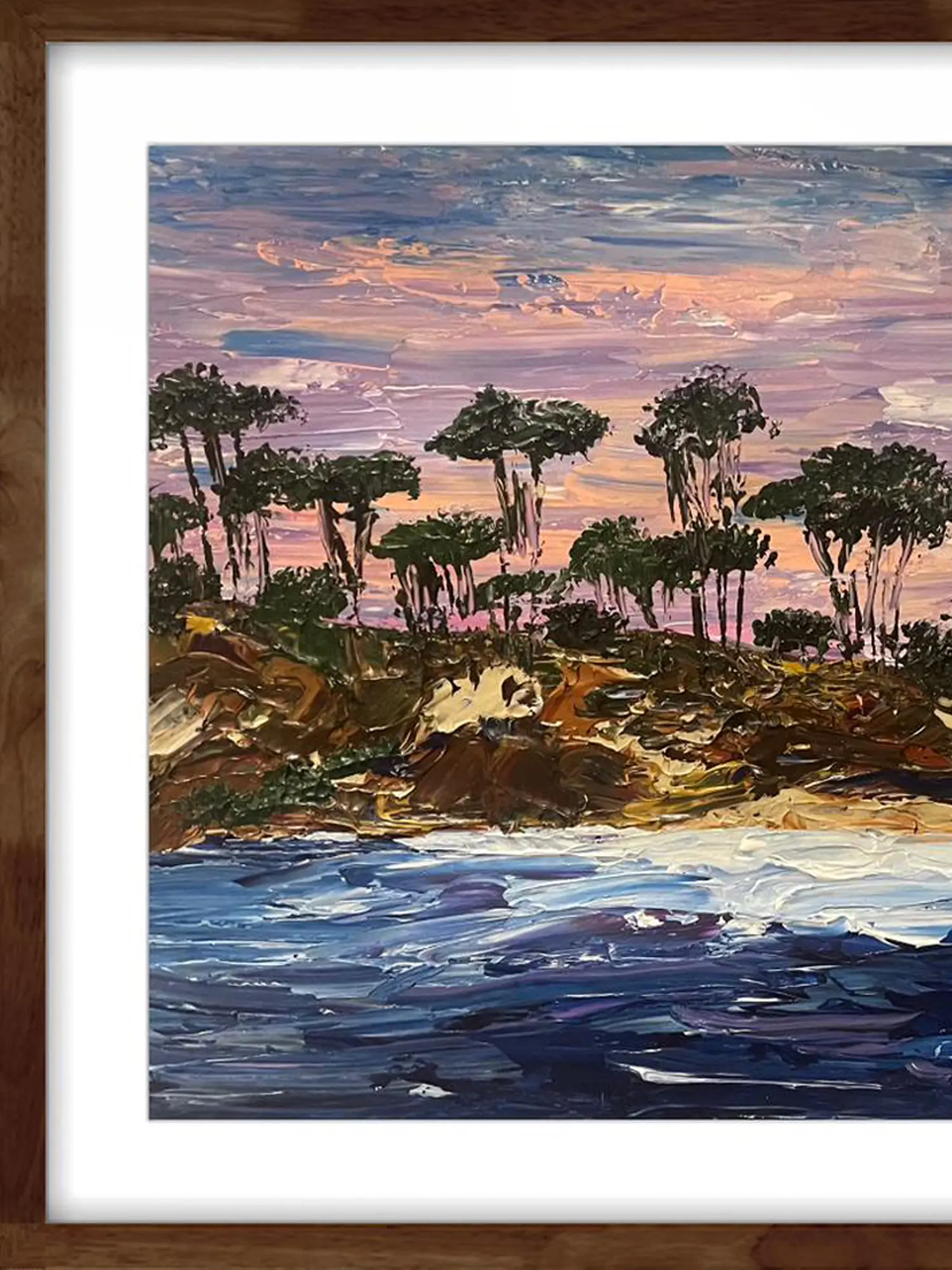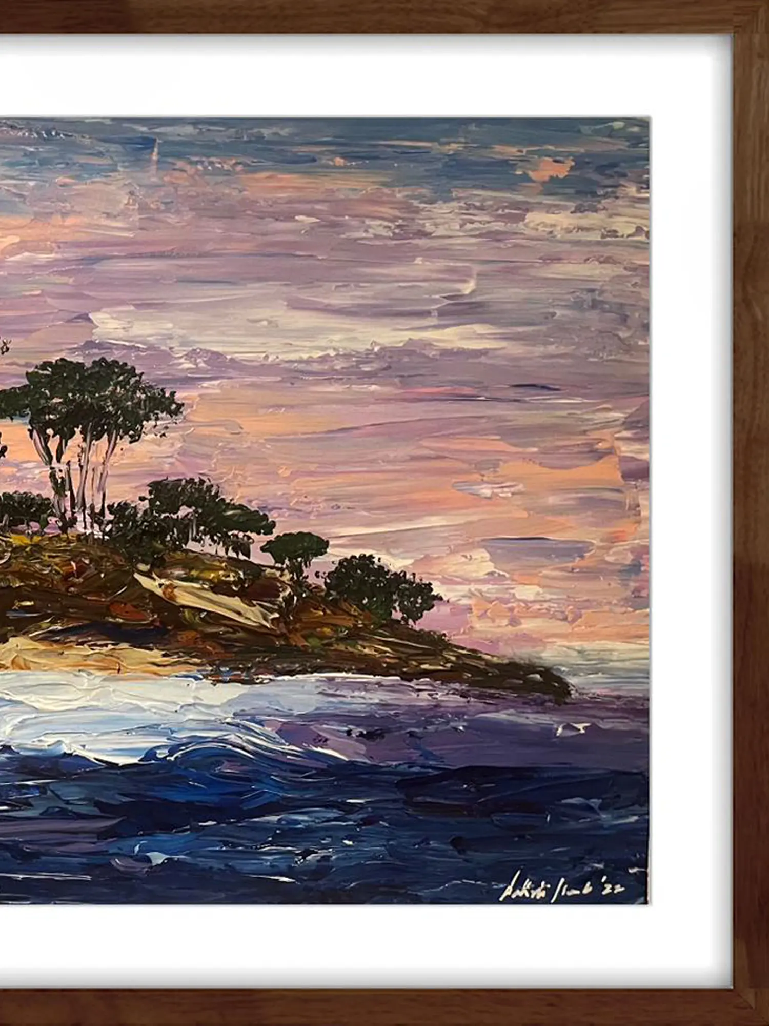 This exquisite painting captures a serene coastal vista, a haven of tranquil beauty where land meets sea under a boundless sky. The artist’s bold brushstrokes create a dynamic interplay of texture and color, breathing life into the canvas. The island, crowned with a silhouette of trees, stands as a testament to nature's enduring strength. The sky, a mesmerizing blend of pinks, blues, and purples, evokes the magic of twilight, a time of day when the world seems to hold its breath in anticipation of the night. The water, rendered in deep blues and shimmering whites, hints at the mysteries that lie beneath the surface. The painting is presented within a complementary frame, enhancing its aesthetic appeal and preparing it for immediate display.