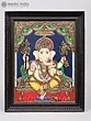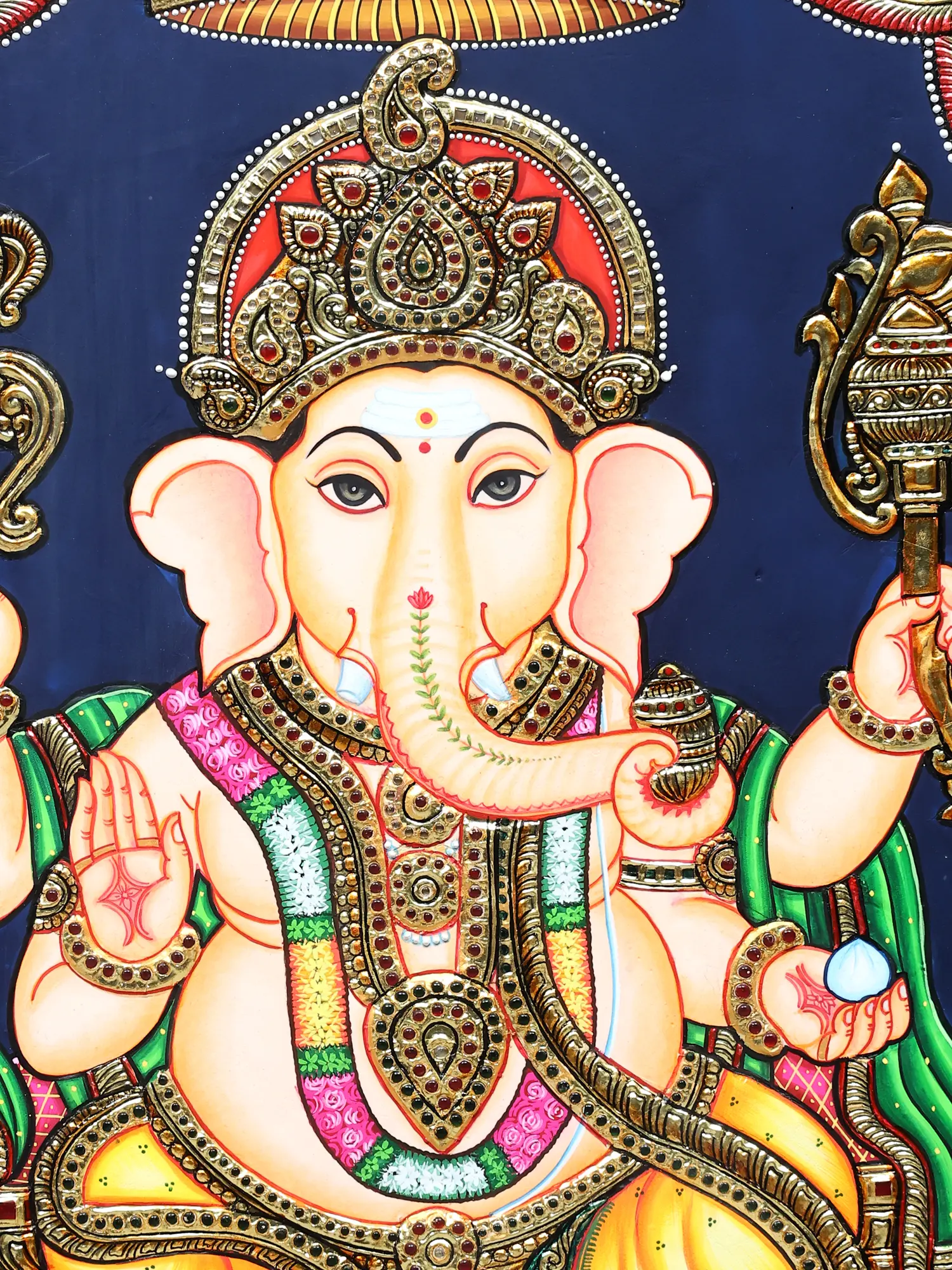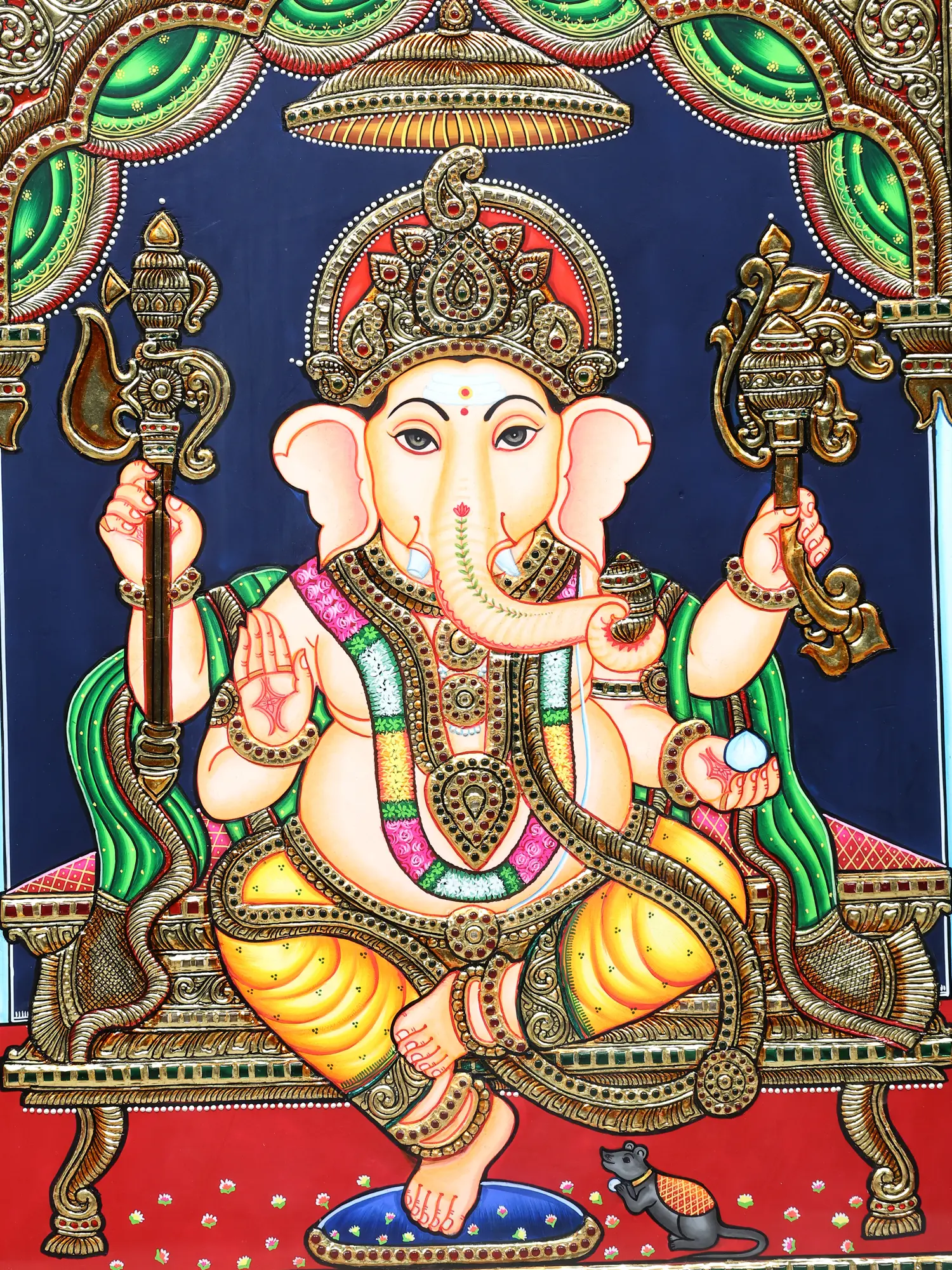 Lord Ganesha Seated on Throne | 24 Karat Gold Work | Framed Tanjore Painting