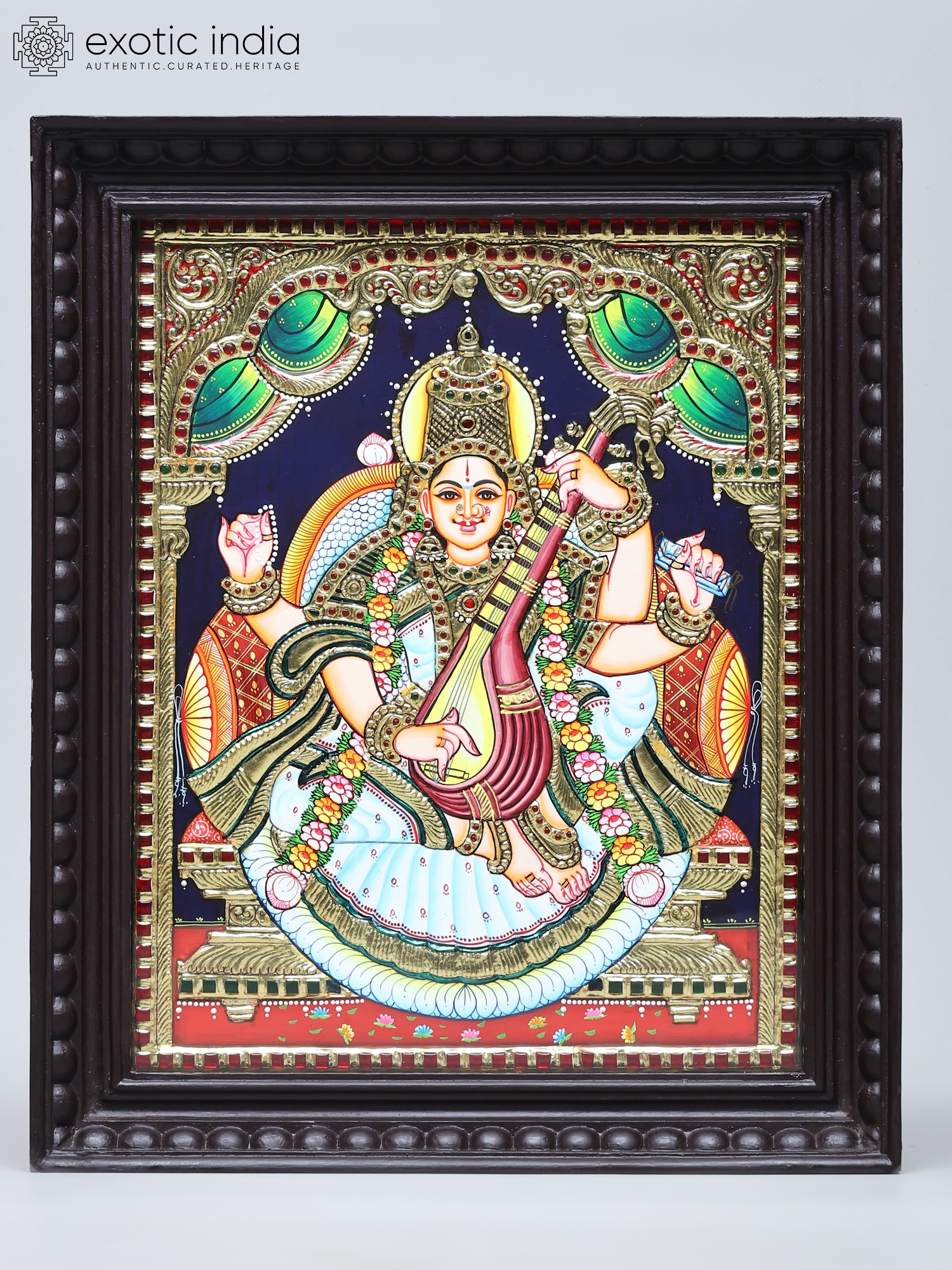 Devi Saraswati Tanjore Painting | Traditional Colors With 24K Gold | Teakwood Frame | Handmade