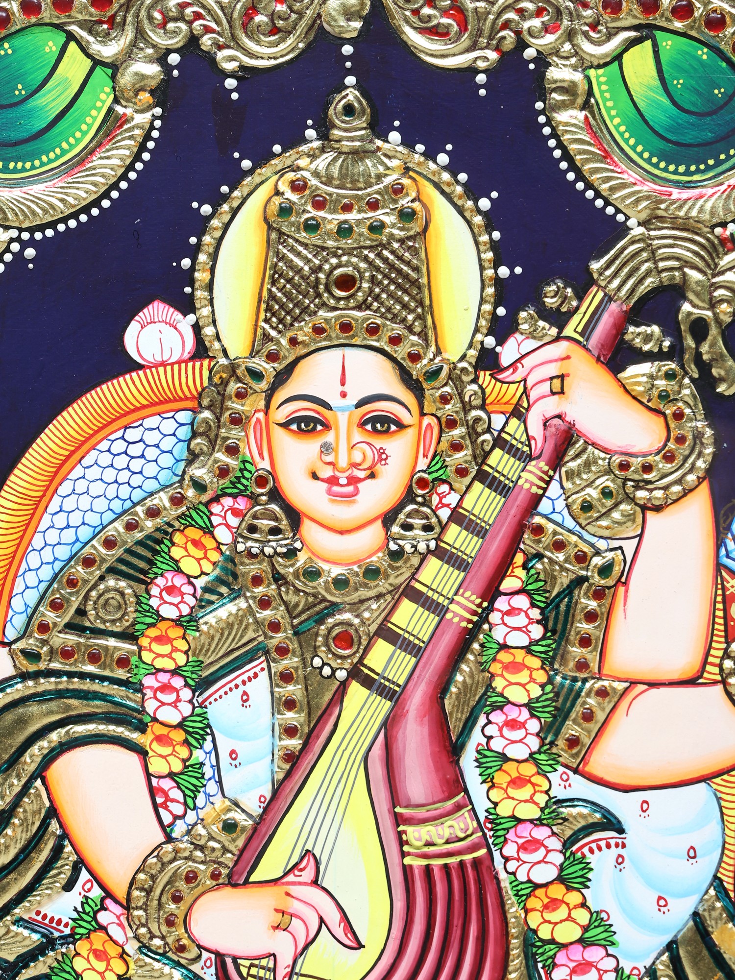 Devi Saraswati Seated on Shwet Kamal | 24 Karat Gold Work | Tanjore Painting