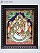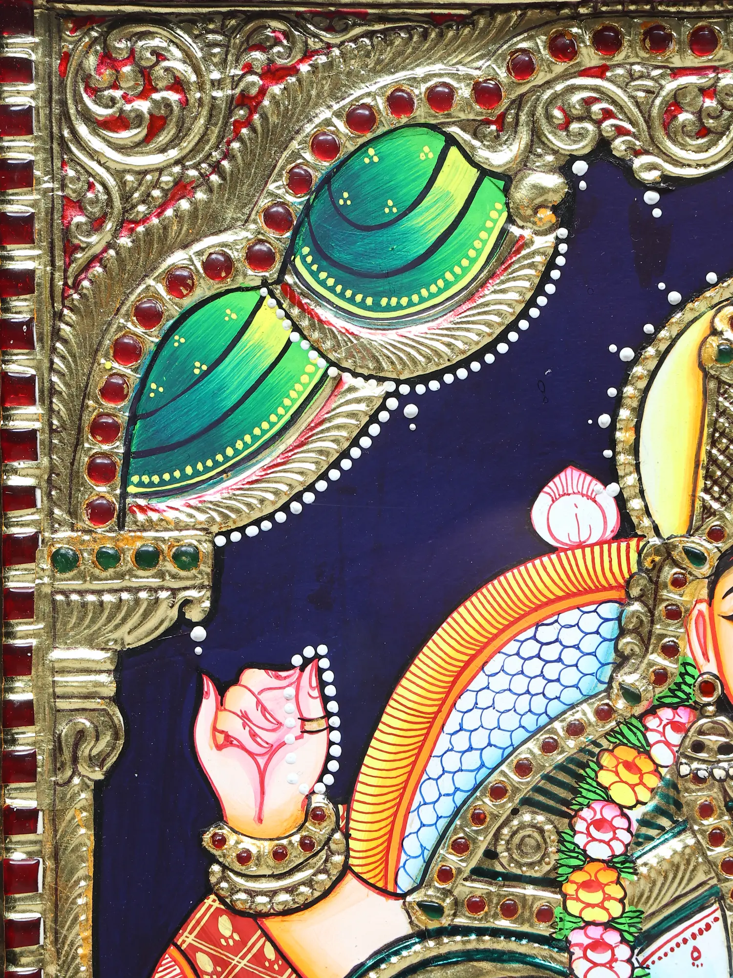 This exquisite Tanjore painting captures the essence of Goddess Saraswati, the Hindu deity of knowledge, music, art, wisdom, and learning. Depicted with her characteristic four arms, she is shown gracefully playing the Veena, a stringed instrument that symbolizes the harmonious vibrations of the universe and the eloquence of speech. The painting is rendered in the traditional Tanjore style, renowned for its rich colors, intricate details, and the liberal use of 24-karat gold leaf, which imbues the artwork with a divine luminescence and a sense of opulence. The four arms of Saraswati are significant, representing her dominion over various aspects of human existence. Two arms hold the Veena, signifying her mastery over music and the arts, while the other two are often depicted in abhaya mudra (gesture of fearlessness) and holding a manuscript or mala (rosary), symbolizing protection, spiritual knowledge, and divine grace. Her serene expression, adorned with traditional Indian jewelry, conveys a profound sense of peace and wisdom. The vibrant colors used in her attire and the surrounding adornments are characteristic of the Tanjore school, meticulously applied to create a visually stunning and spiritually uplifting composition.