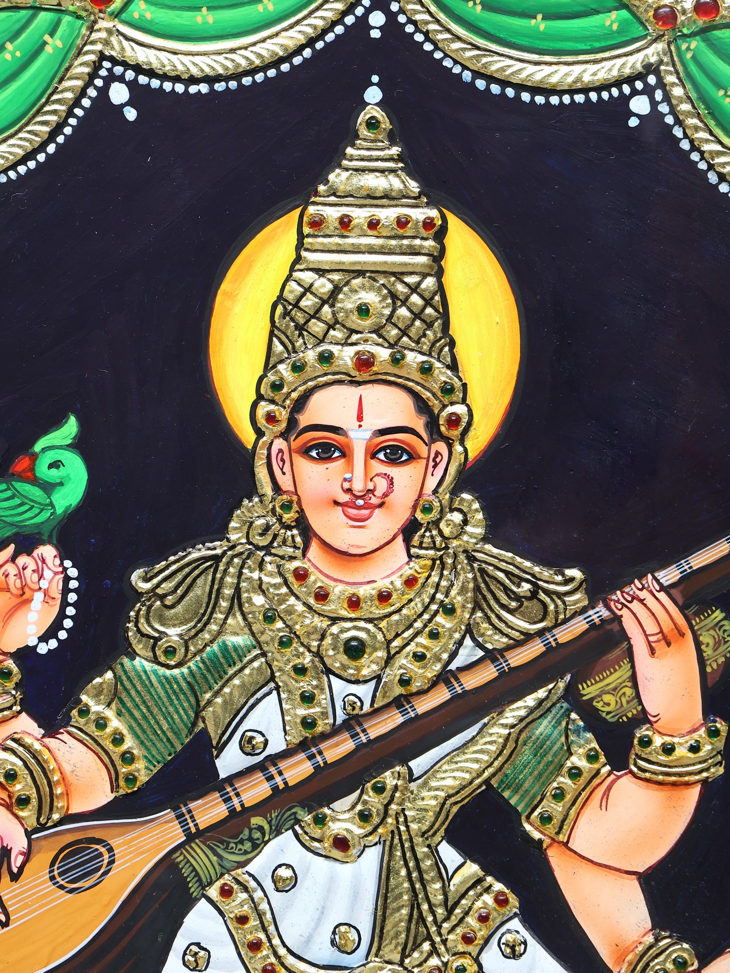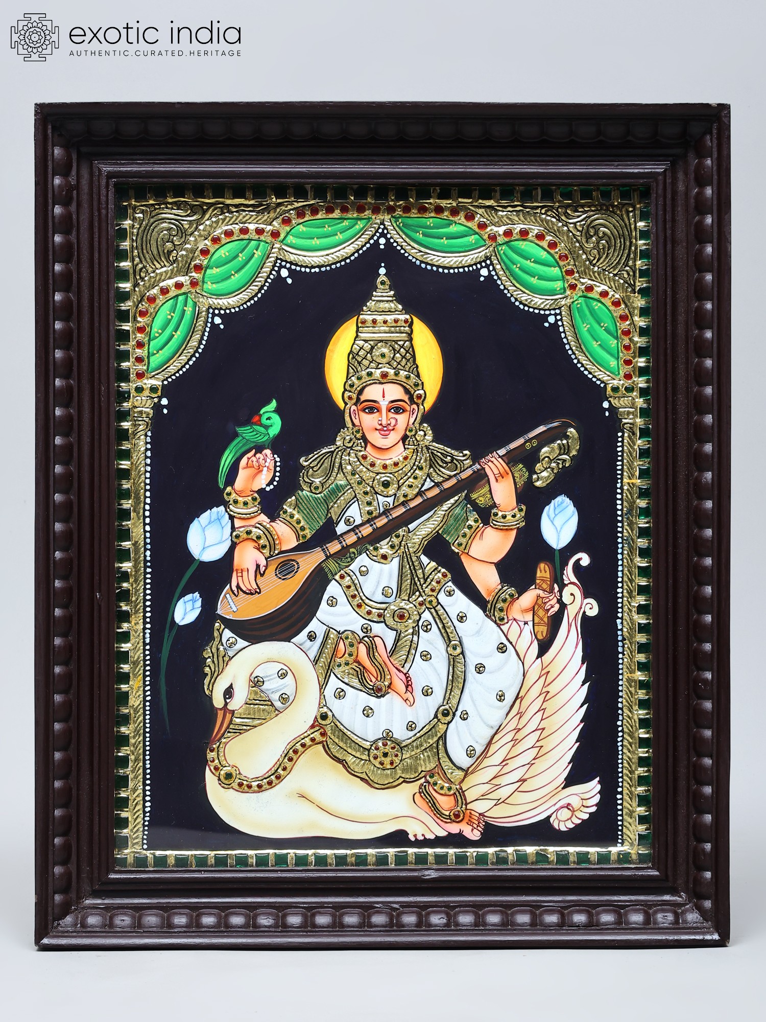 Goddess Saraswati Tanjore Painting | Traditional Colors With 24K Gold | Teakwood Frame