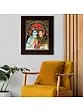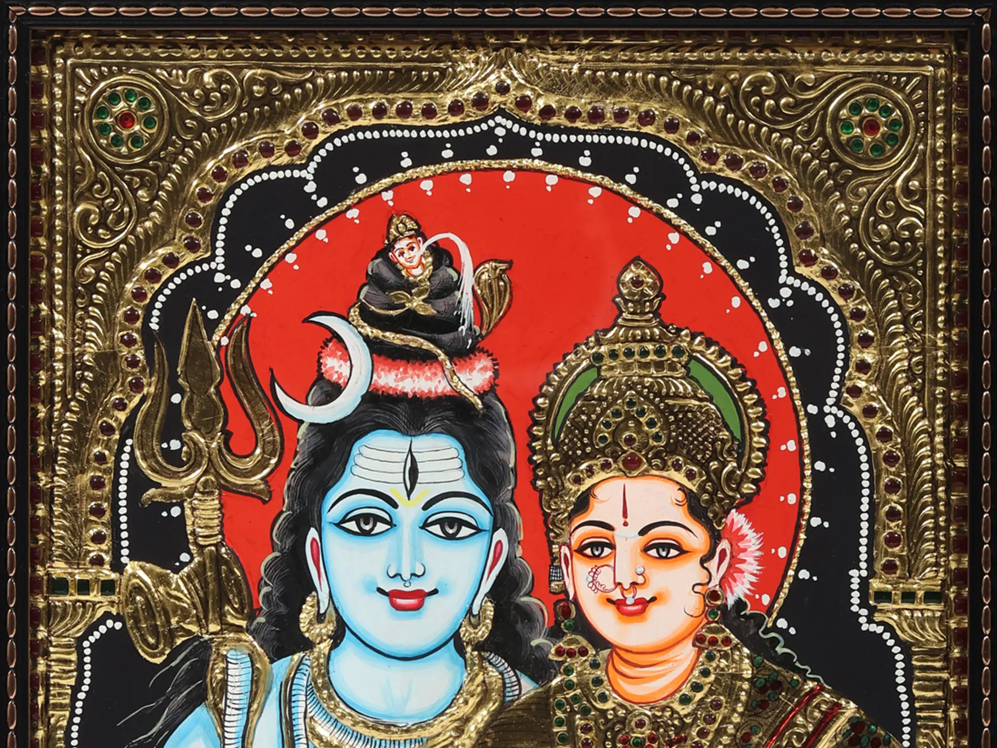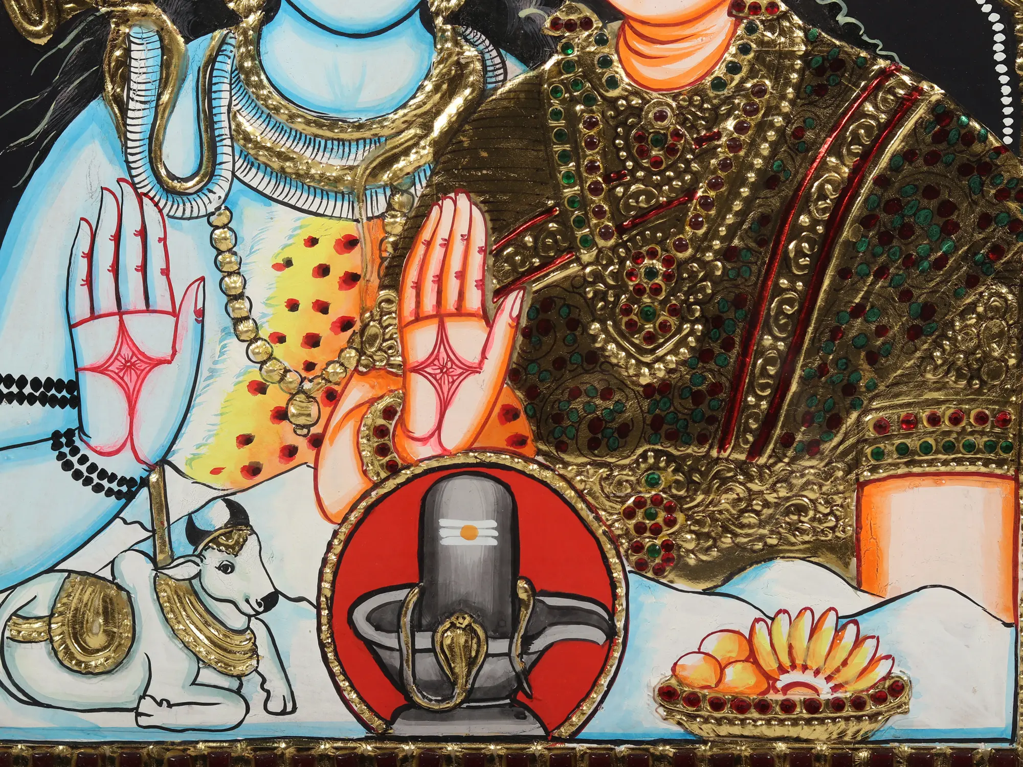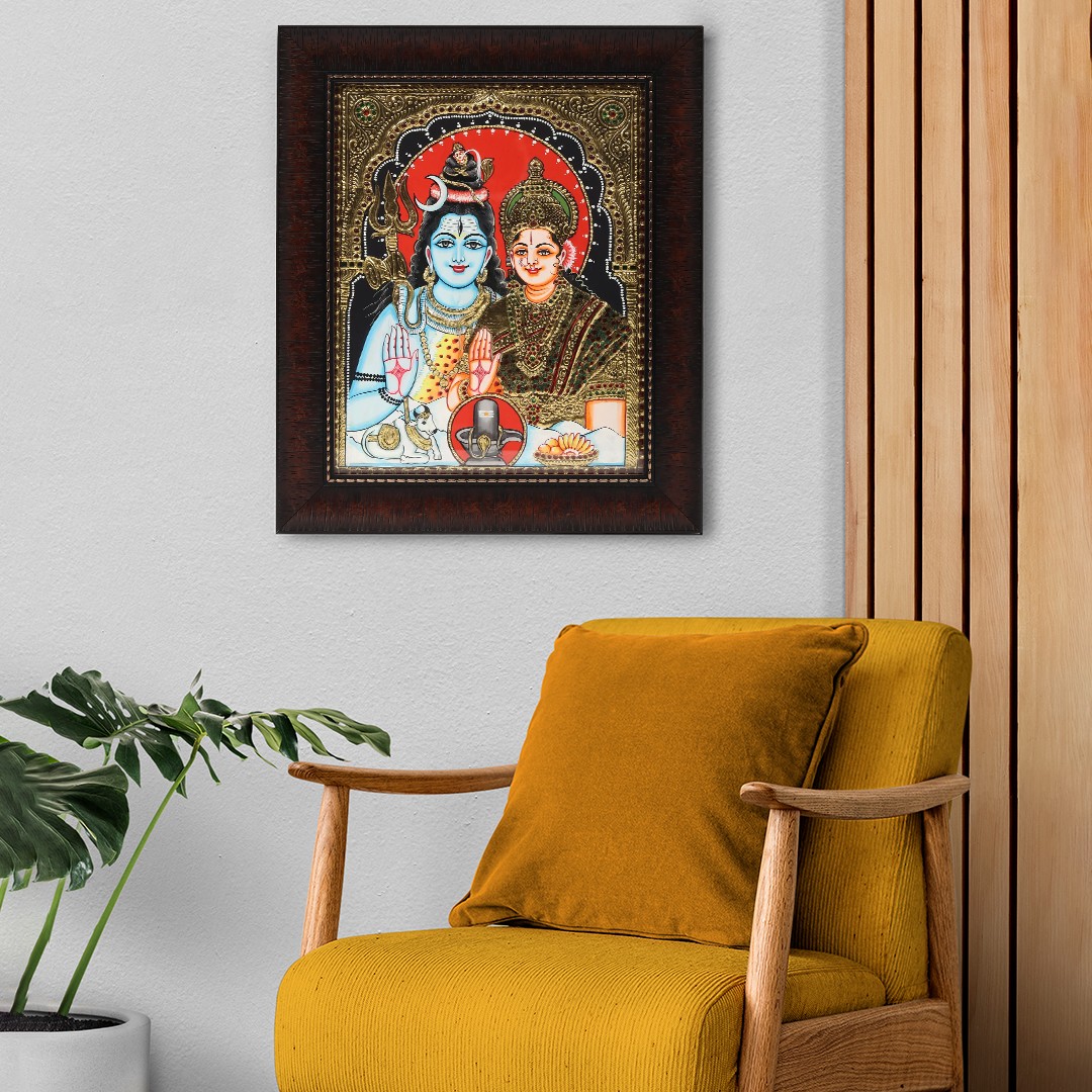 In the realm where art becomes a testament to divine love, we unveil this gorgeous portrayal of Lord Shiva and Goddess Parvati, seated gracefully, assuming Abhaya Mudra, a gesture of divine protection and assurance. In their presence, Nandi, the ever-loyal bull, stands as a symbol of unwavering devotion. The sacred Shivlinga, bathed in divine light, radiates the presence of Lord Shiva. Surrounding them, offerings of Naivedyam complete the imagery into the direction of pure reverence.