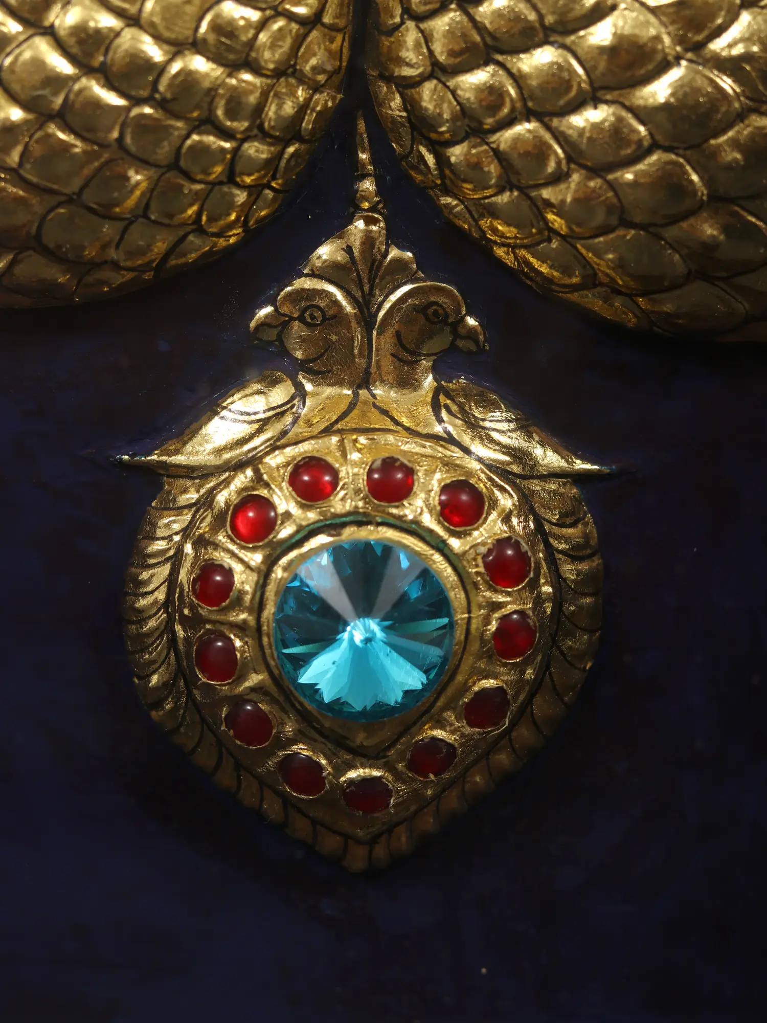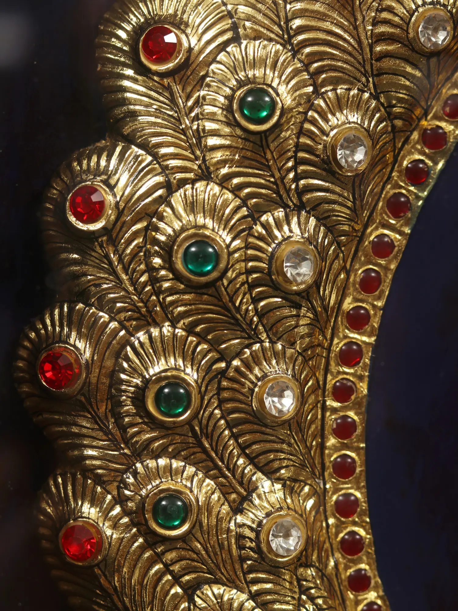 Thereafter, the outlines which were made or traced using a stencil are now ready to be beautified and decked with various add-ons. The usual materials for decoration are cut-glass, pearls, semi-precious and precious gems, gold leaf, and laces. 22 or 18 Karat Gold leaves and gems of varied hues are especially inlaid in areas like pillars, arches, walls, thrones, and dresses. In the final step, the rest of the painting is filled with rich and striking colors such as shades of red, blue, and green. Formerly, the artists used natural colors like vegetable and mineral dyes instead of chemical paints. The entire painting is then cleaned and refined to give a flawless finished look.