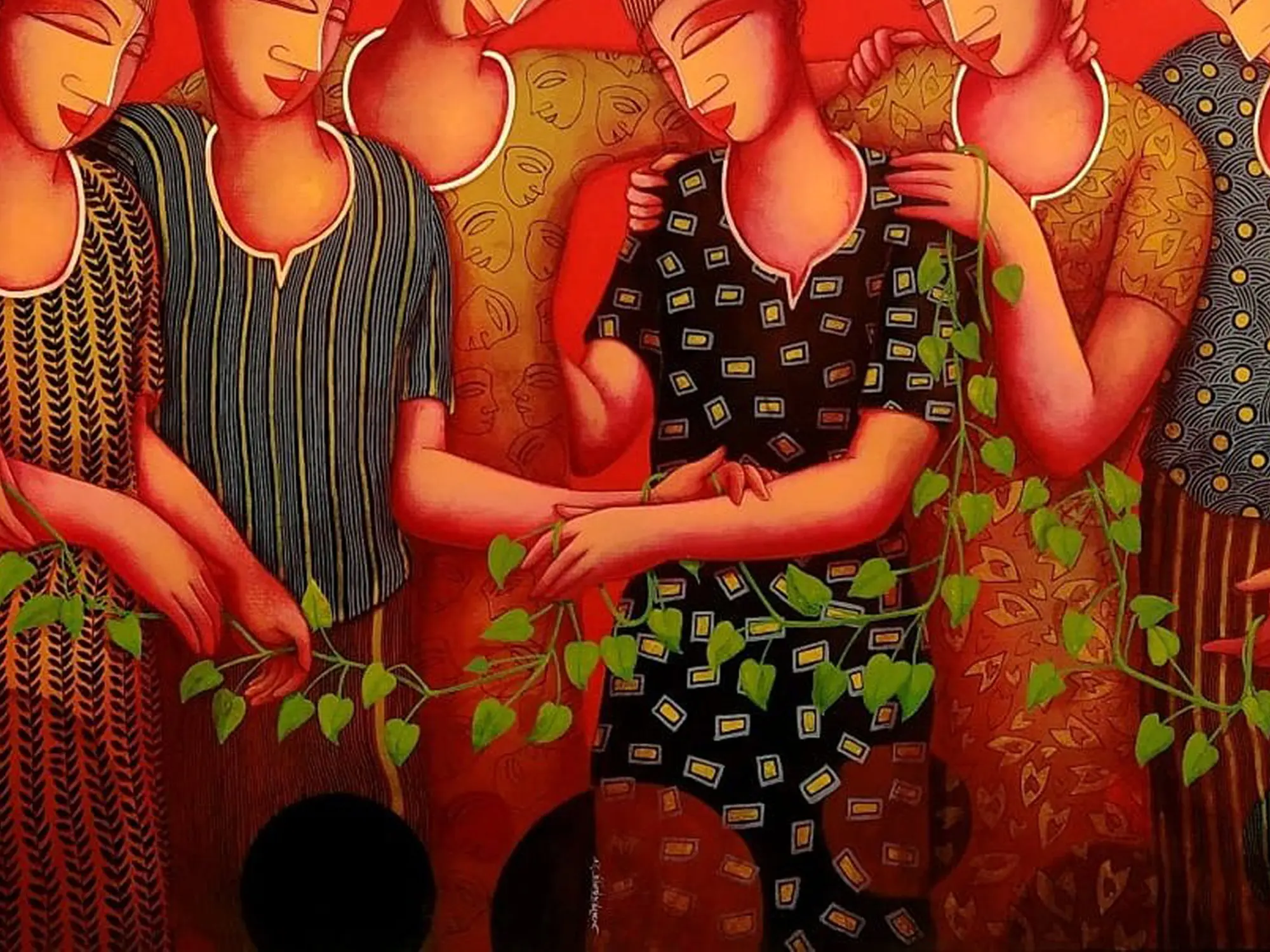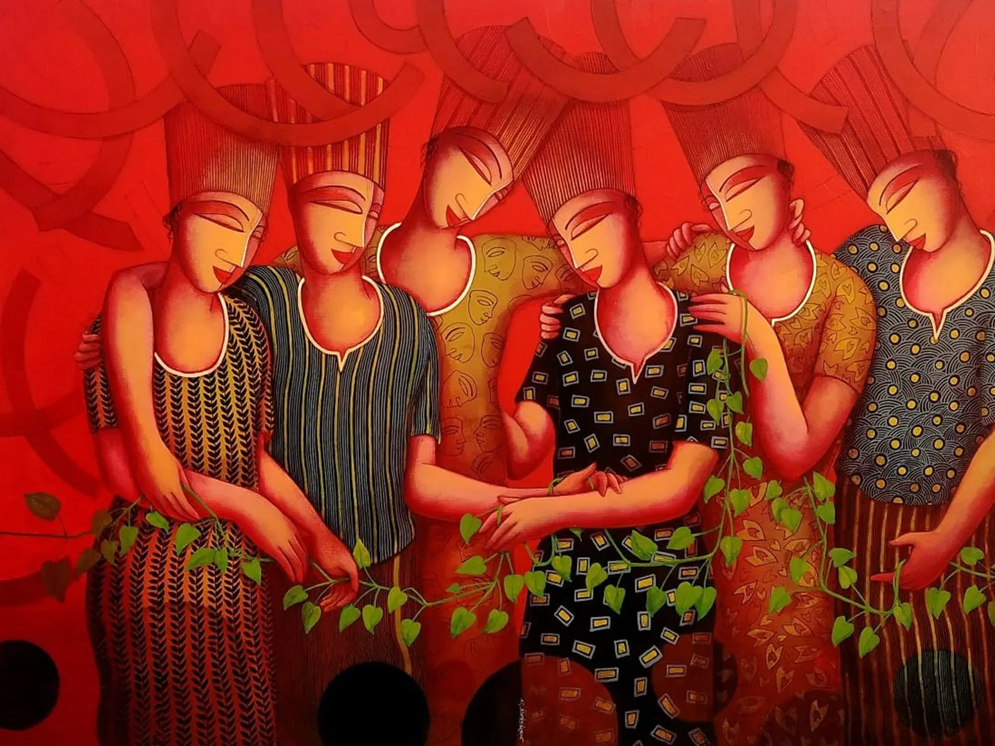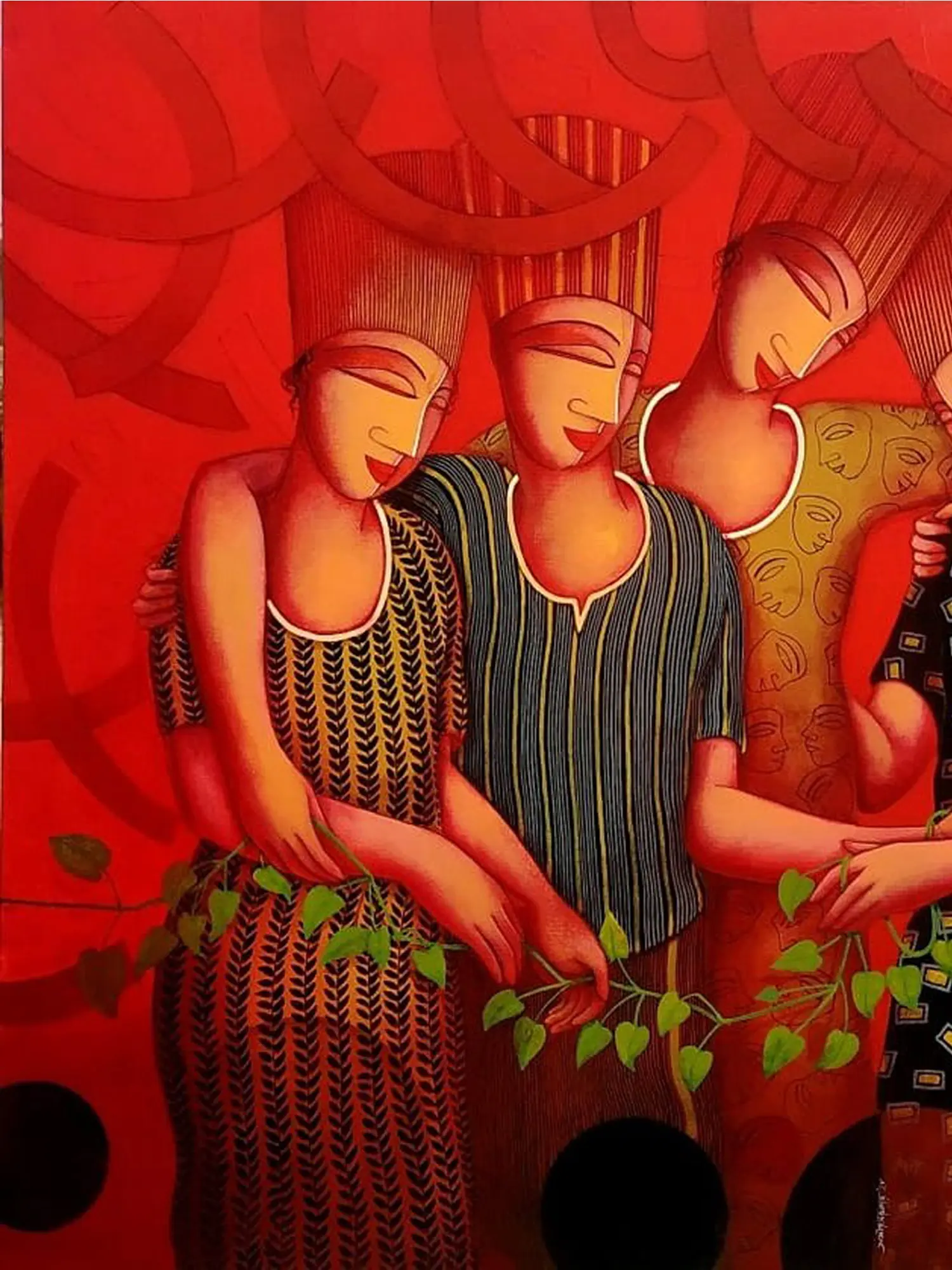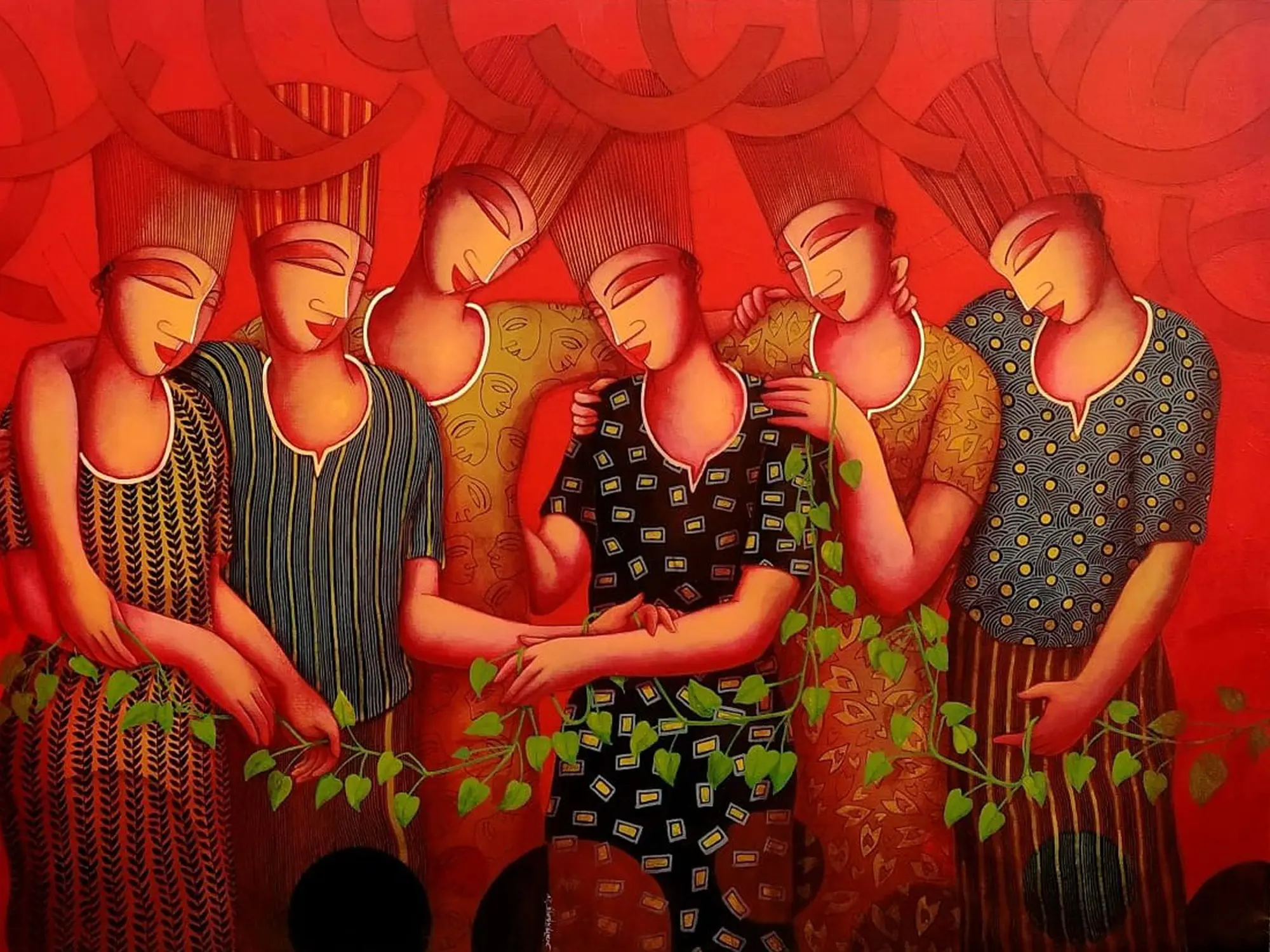 Six women stand in the embrace of each other, creating an atmosphere of tranquility, contentment, and affection in this acrylic on canvas, an ode to the beauty of female friendships- unbounded and beyond the four walls of the world. Wearing beautifully patterned dresses that bring lovely elements to the aesthetic of the painting, the women stand with their eyes closed and their arms embracing one another. Their tilted heads and fulfilled faces bring a serenity to the canvas. A flowing green vine is intertwined with all six women, running horizontally across the canvas as a symbol of the threads of love, acceptance, and friendship that bind them together, eternally.