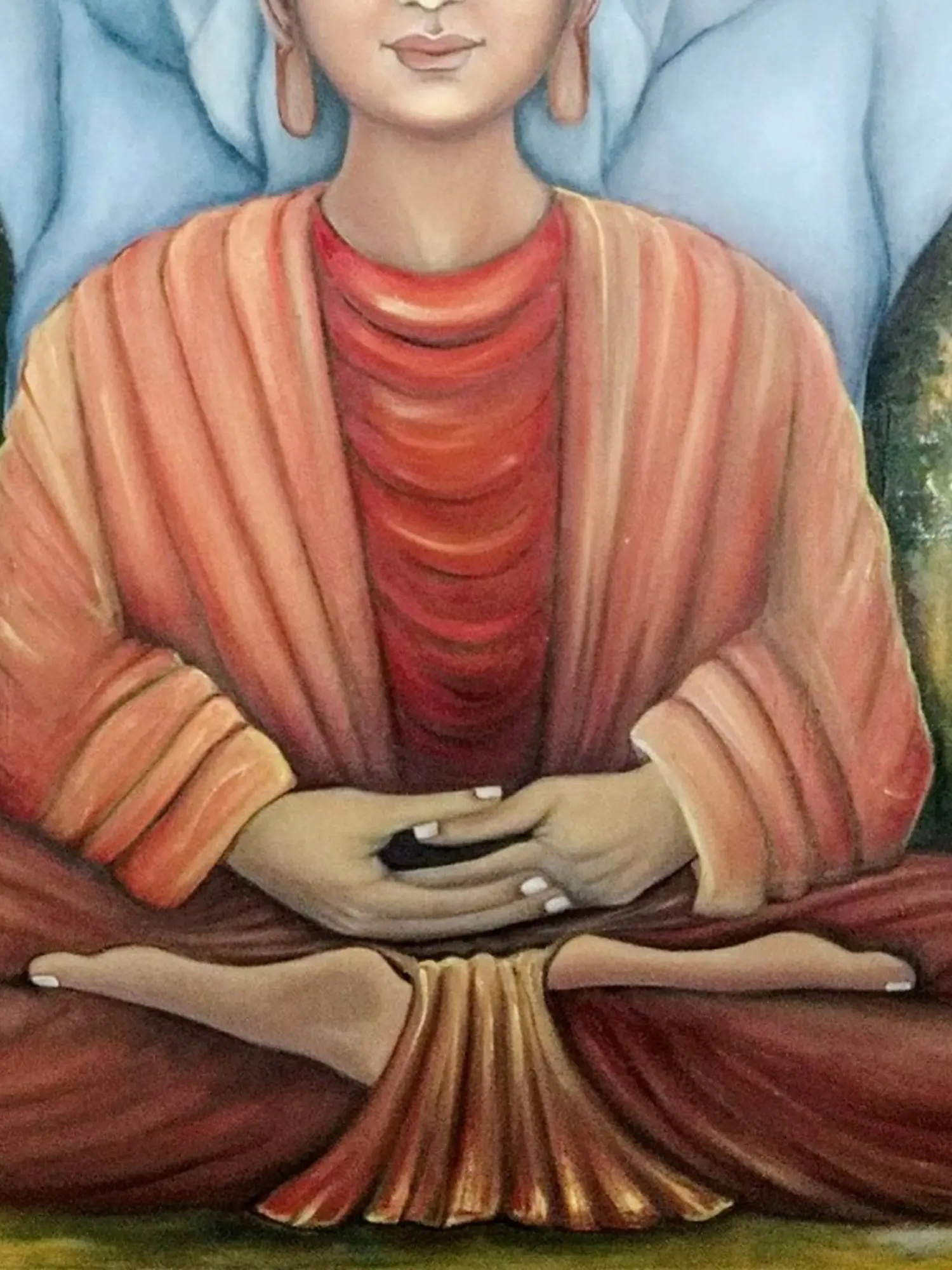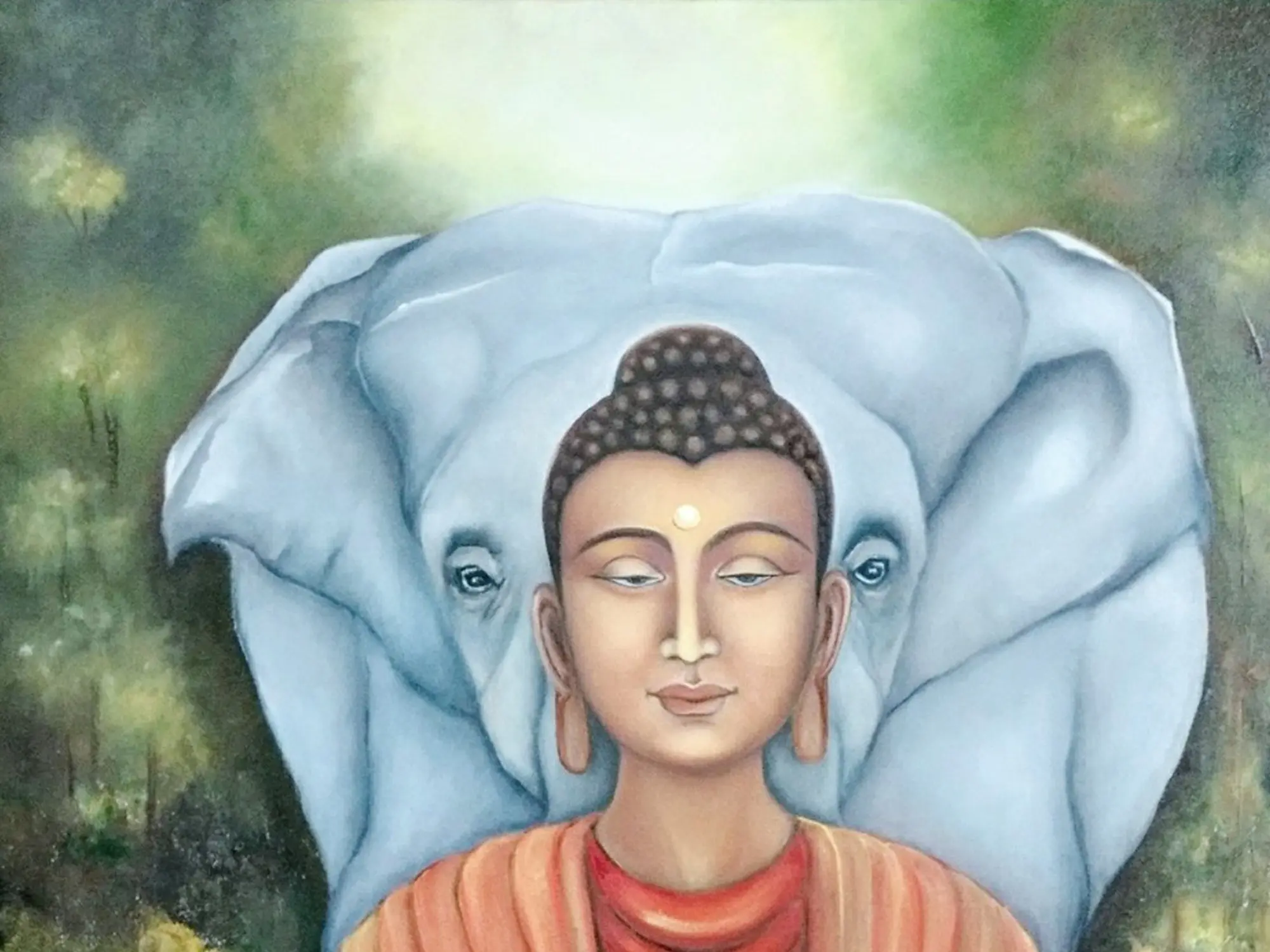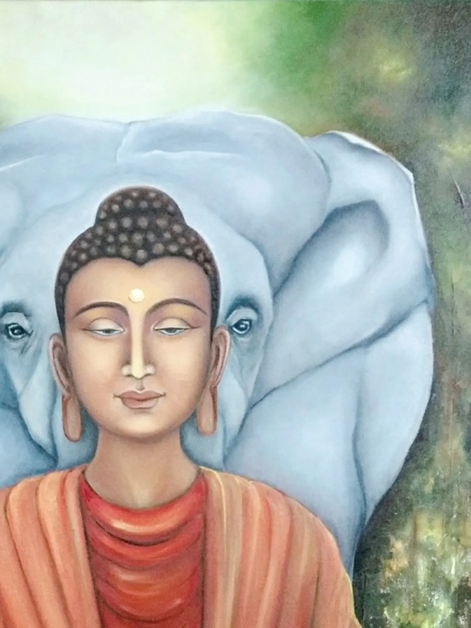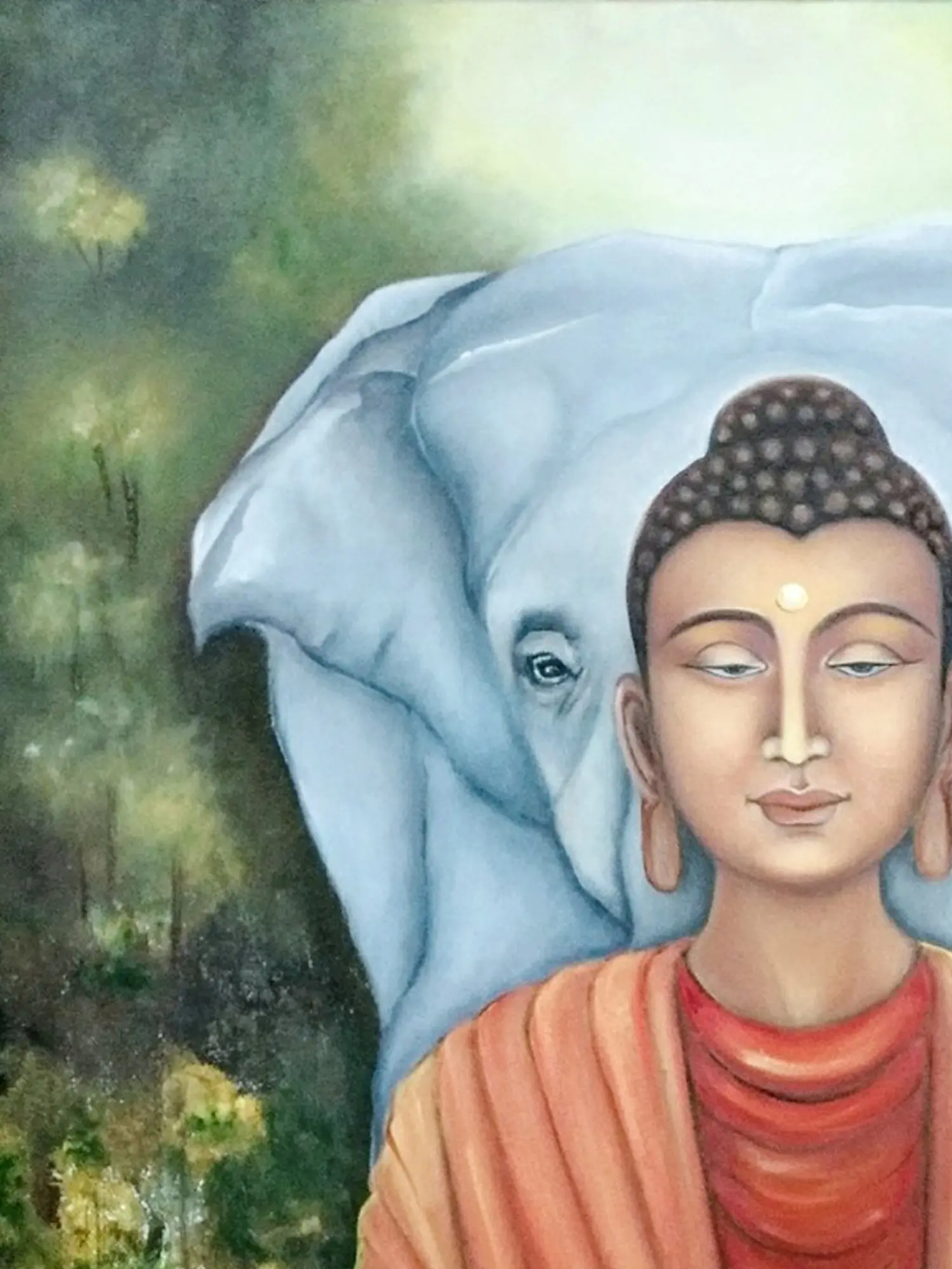 Journey into the realm of enlightenment with "Gaj Gautam - Buddha," a masterful portrayal rendered in oil on canvas - the figure of Buddha emerges, his serene countenance a beacon of wisdom and compassion with an elephantine halo. Through skillful brushwork and meticulous attention to detail, the artist captures the essence of spiritual transcendence. As the gentle glow of enlightenment illuminates the canvas, observers are invited to reflect upon the teachings of compassion and mindfulness that lie at the heart of the Buddha's eternal wisdom.