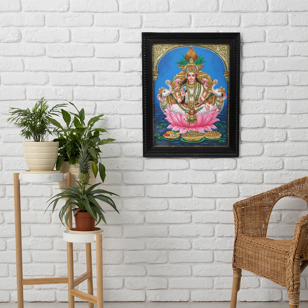 A blend of modern iconography and techniques of Tanjore, this painting is a shrine to the goddess Gajalakshmi, the Hindu goddess of wealth being revered by Gaja or elephants.