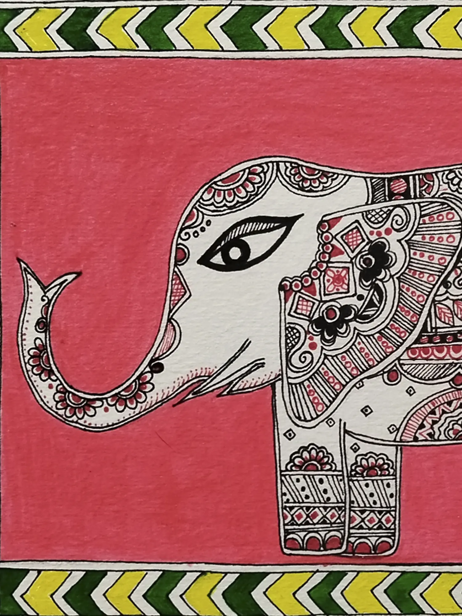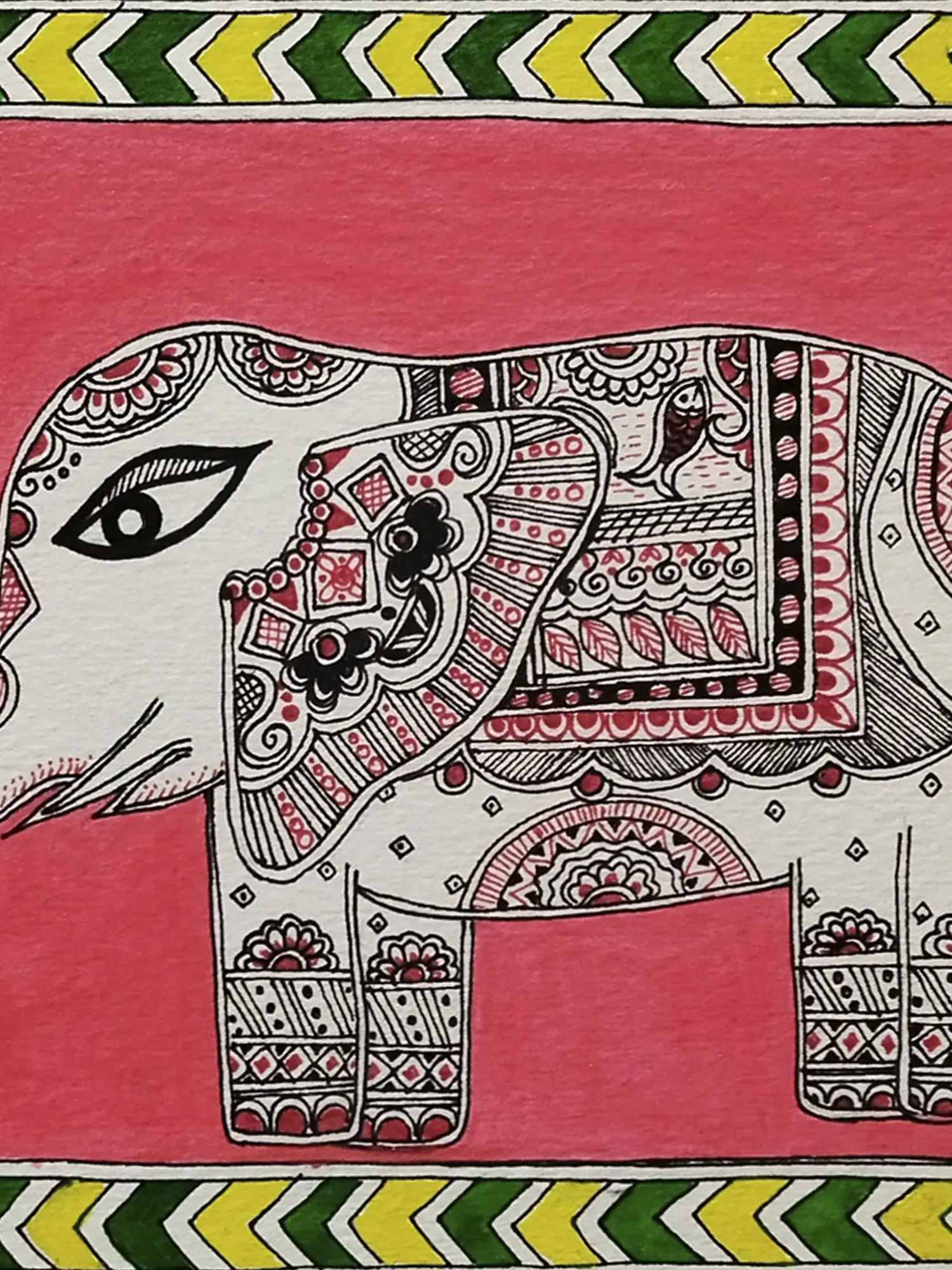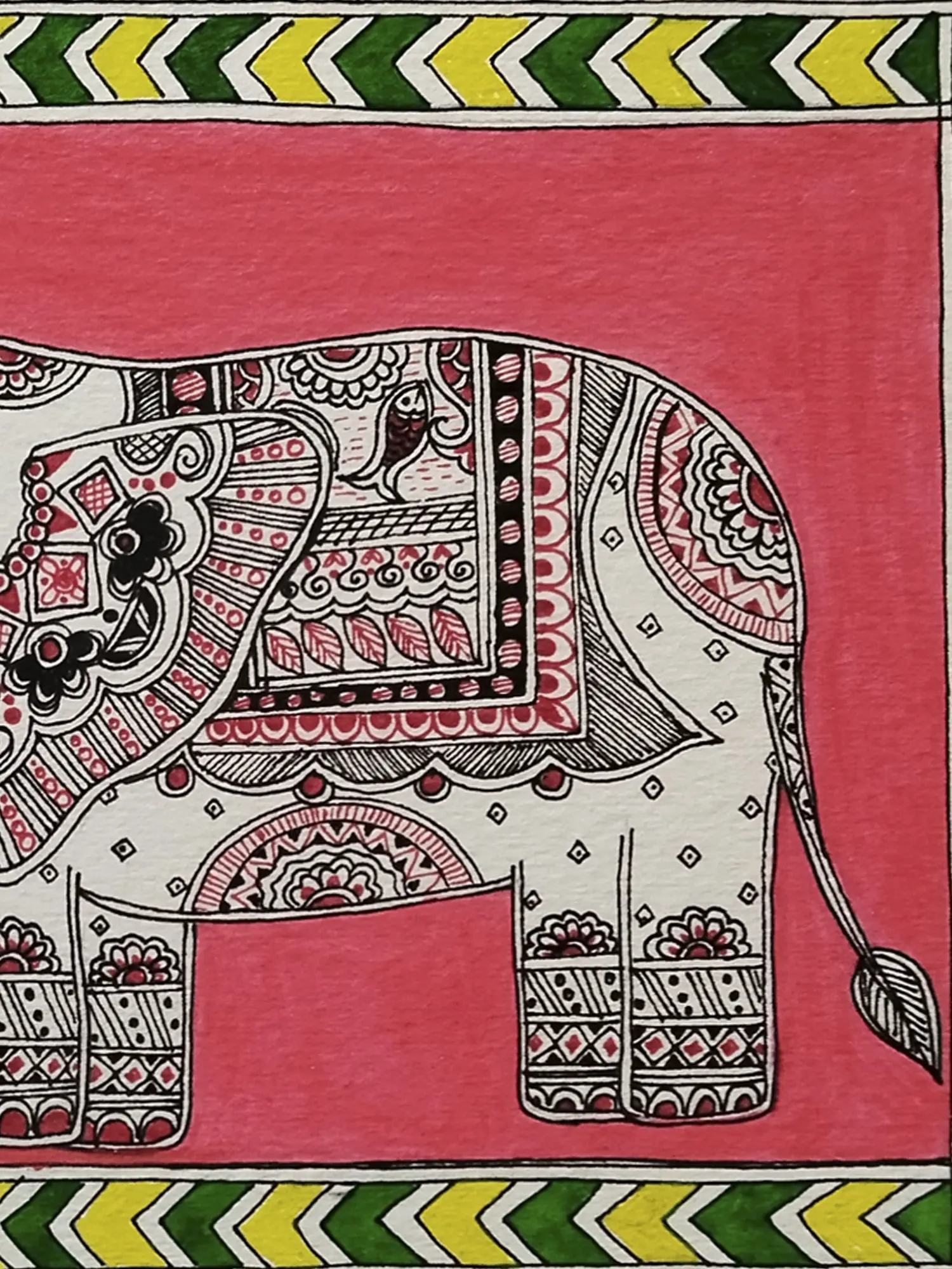 Elephants are revered across cultures for their wisdom, strength, and spiritual significance. In various traditions, they symbolize good fortune, prosperity, and divine protection. This Gajraj Madhubani Painting by Nishu Singh pays homage to these majestic creatures, portraying them in all their glory.