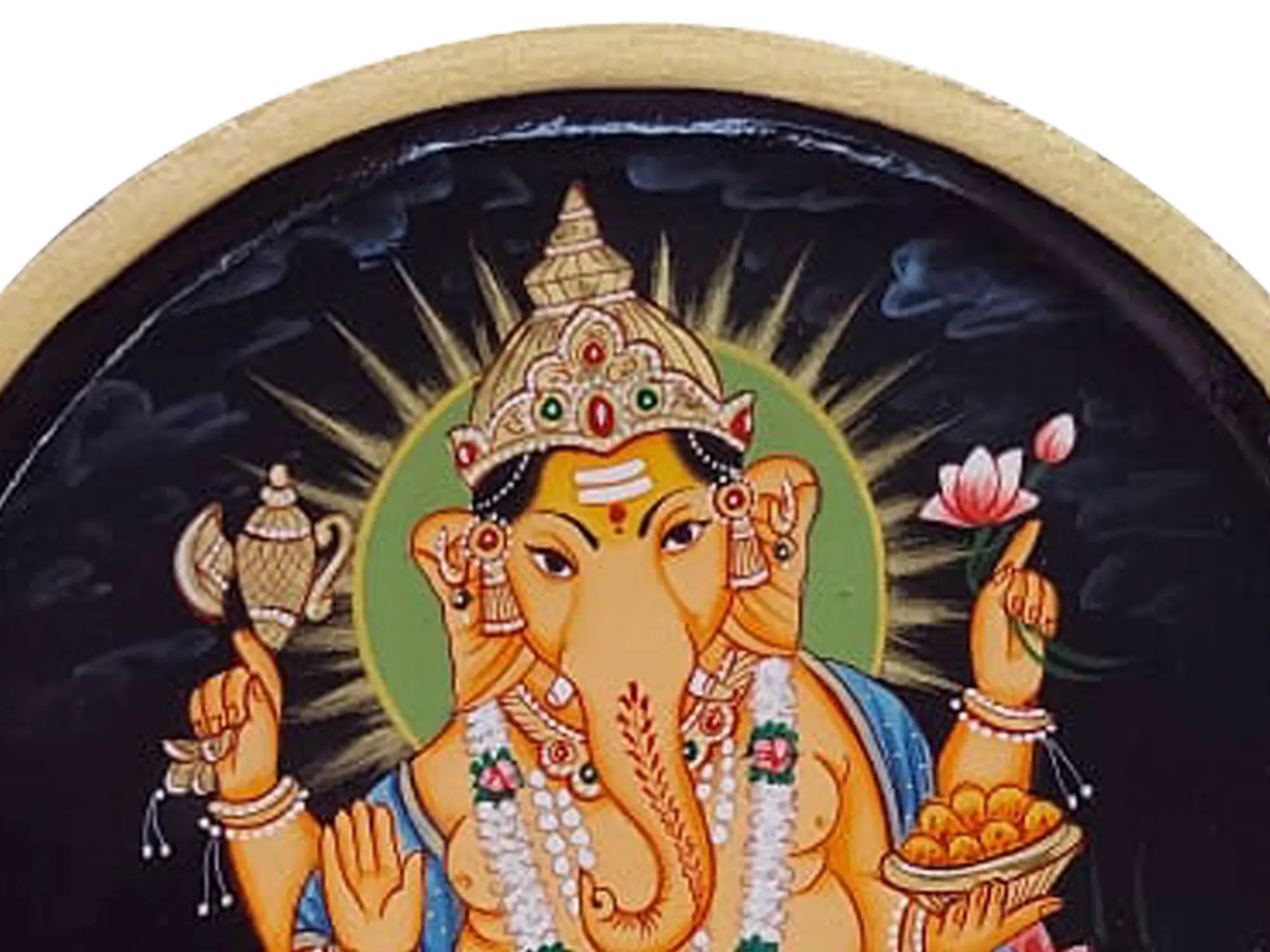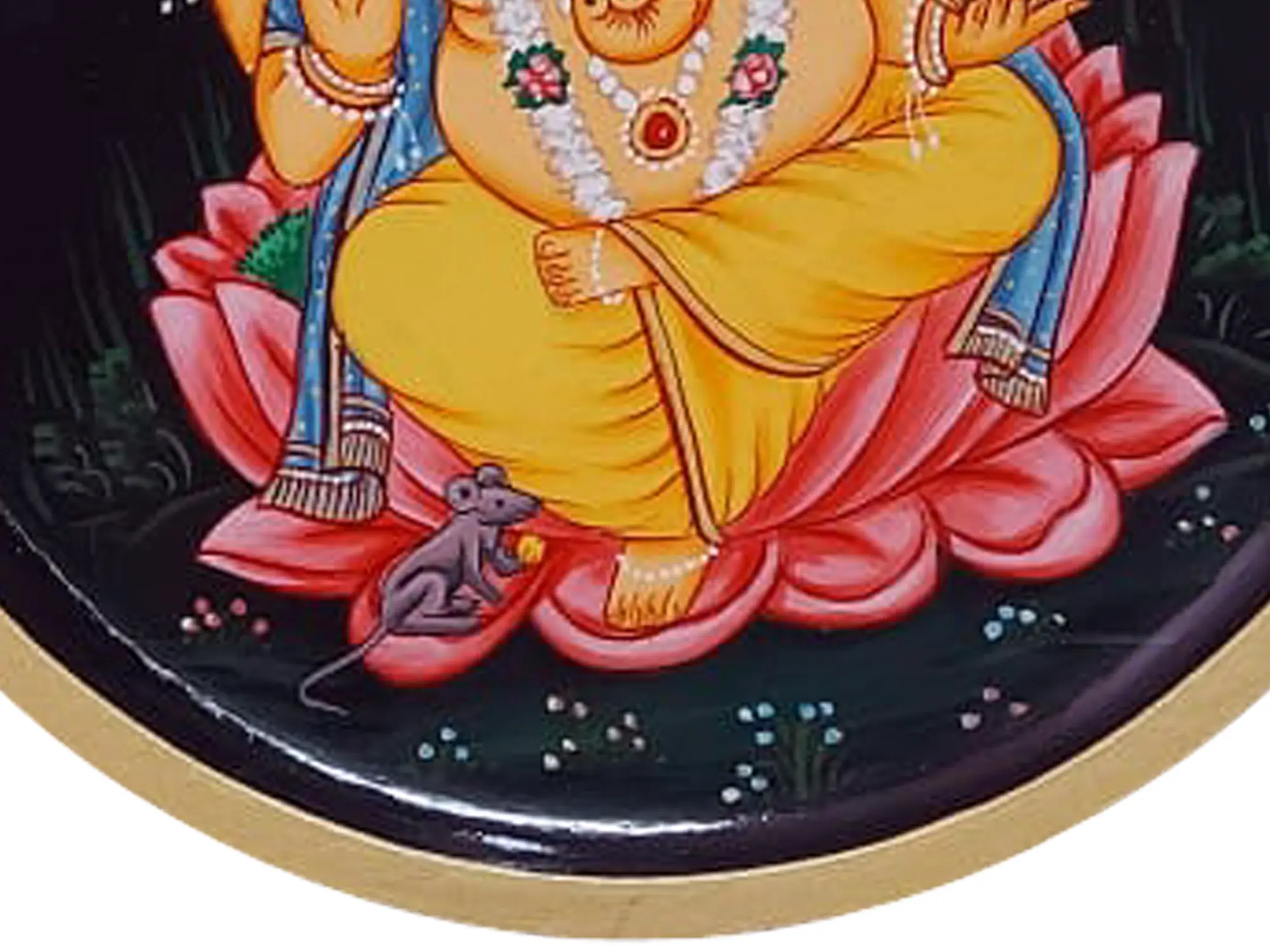 Crafted on wood MDF, it depicts Lord Ganesh seated on a lotus, symbolizing