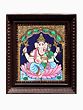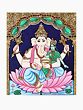 Here, Ganesha, the leader or master of the Ganas (attendants) of Lord Shiva is portrayed sitting on a full-blown lotus in the middle of an ocean having four arms and a pot-belly. The distinctive feature of Ganapati is that he has the head of an elephant and the body of a human, for which he is known as ‘Gajanana’. Because of a single whole tusk, while the other one being broken, he is also known as ‘Ekadanta’. In the upper right arm, he holds an elephant god, his fierce weapon. The noose (pasha) in his upper left arm depicts that he has the ability to liberate his devotees from the never-ending cycle of birth and death. With his lower left hand, holds a pot of Ambrosia while the right hand is in the boon granting Varada Mudra. He is wearing a blue silk dhoti and is decorated with several gold ornaments around his round belly, neck, arms, head, ankles, and wrists.