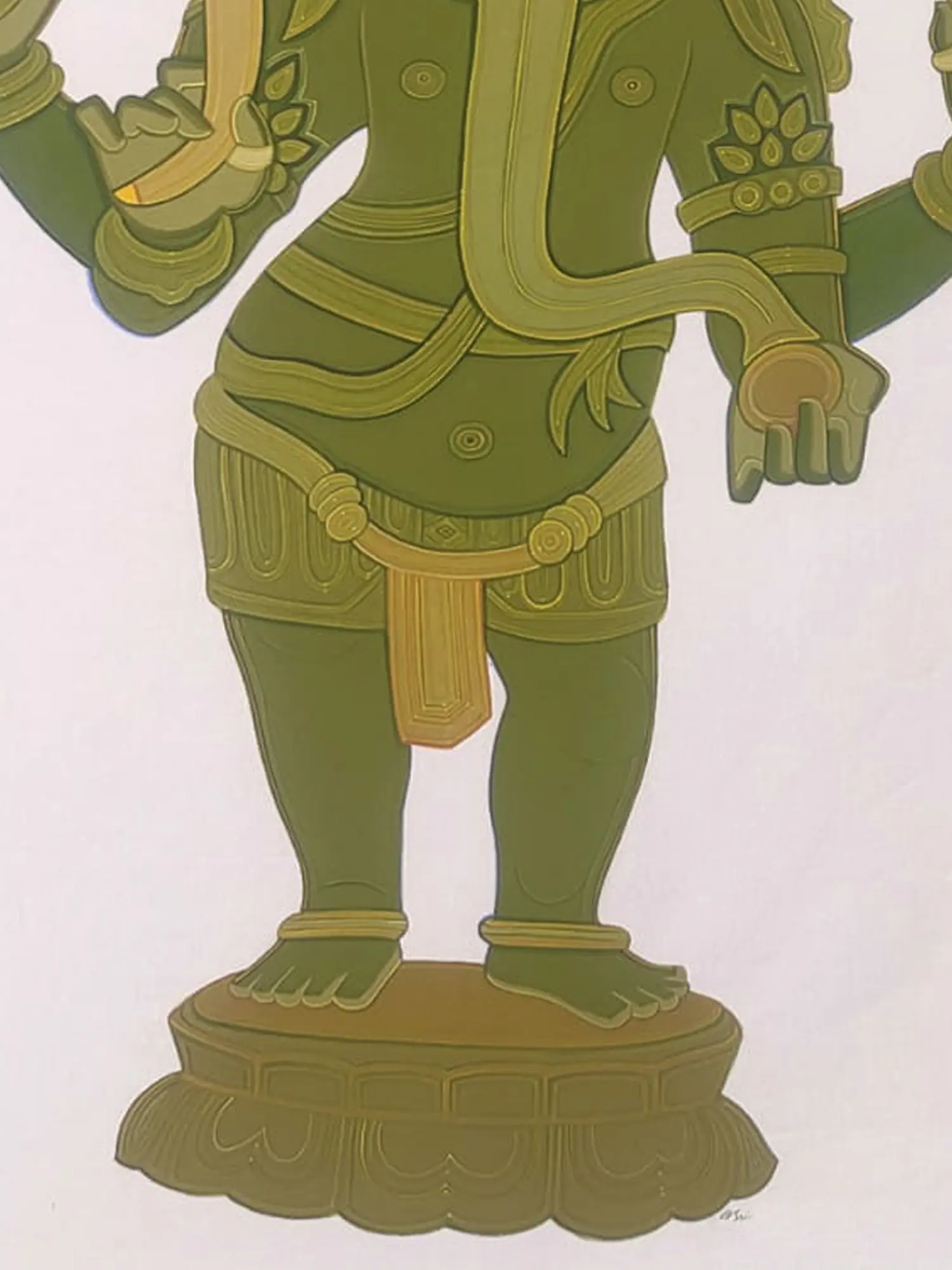 The generous 36-inch width and 48-inch height of the canvas provide a grand scale that allows for an immersive viewing experience. The striking emerald green of the deity is complemented by warm, earthy tones in the ornamentation and the golden crown, creating a balanced and visually appealing composition. You'll be captivated by the intricate detailing of the jewelry and the confident posture.