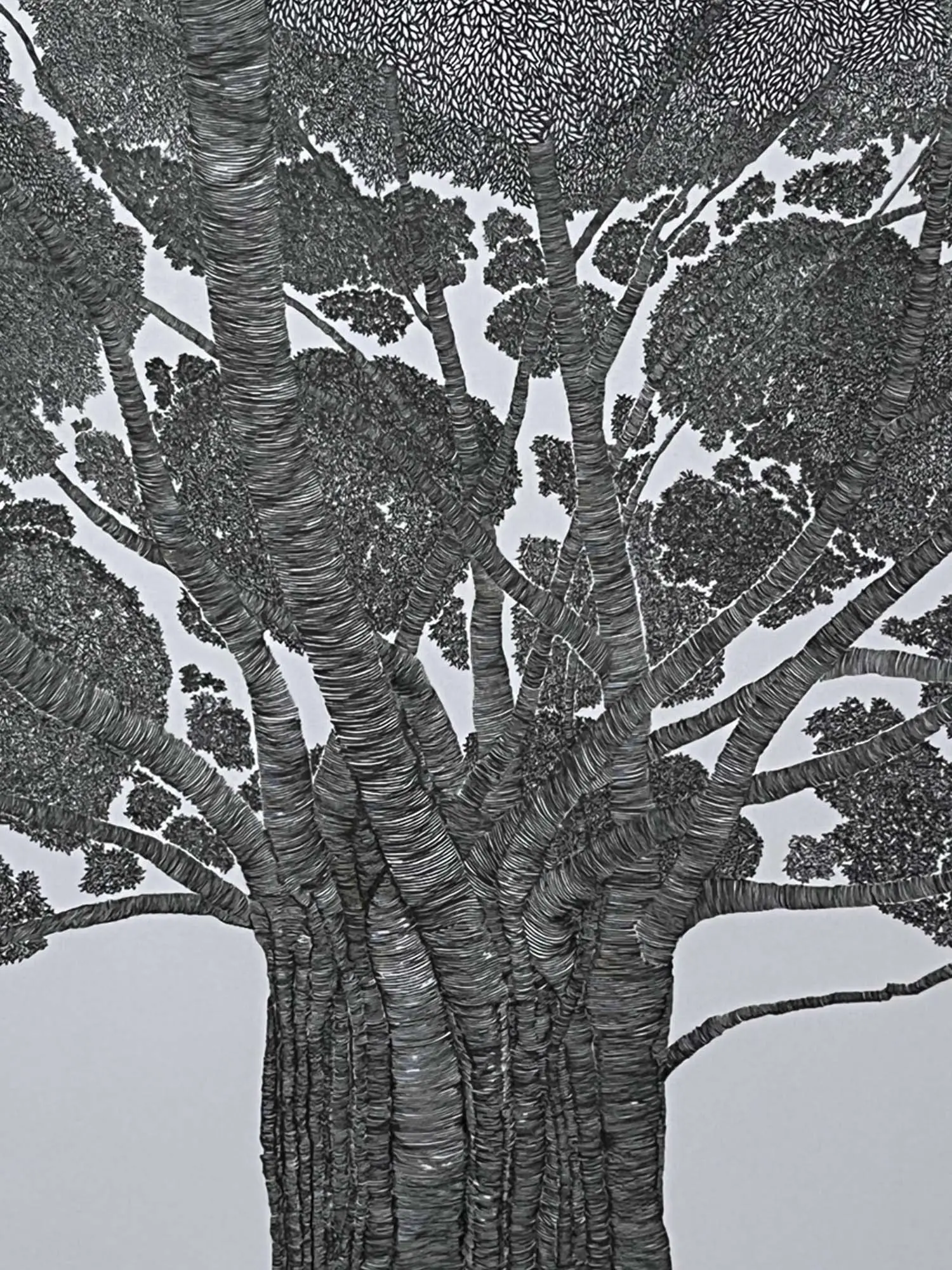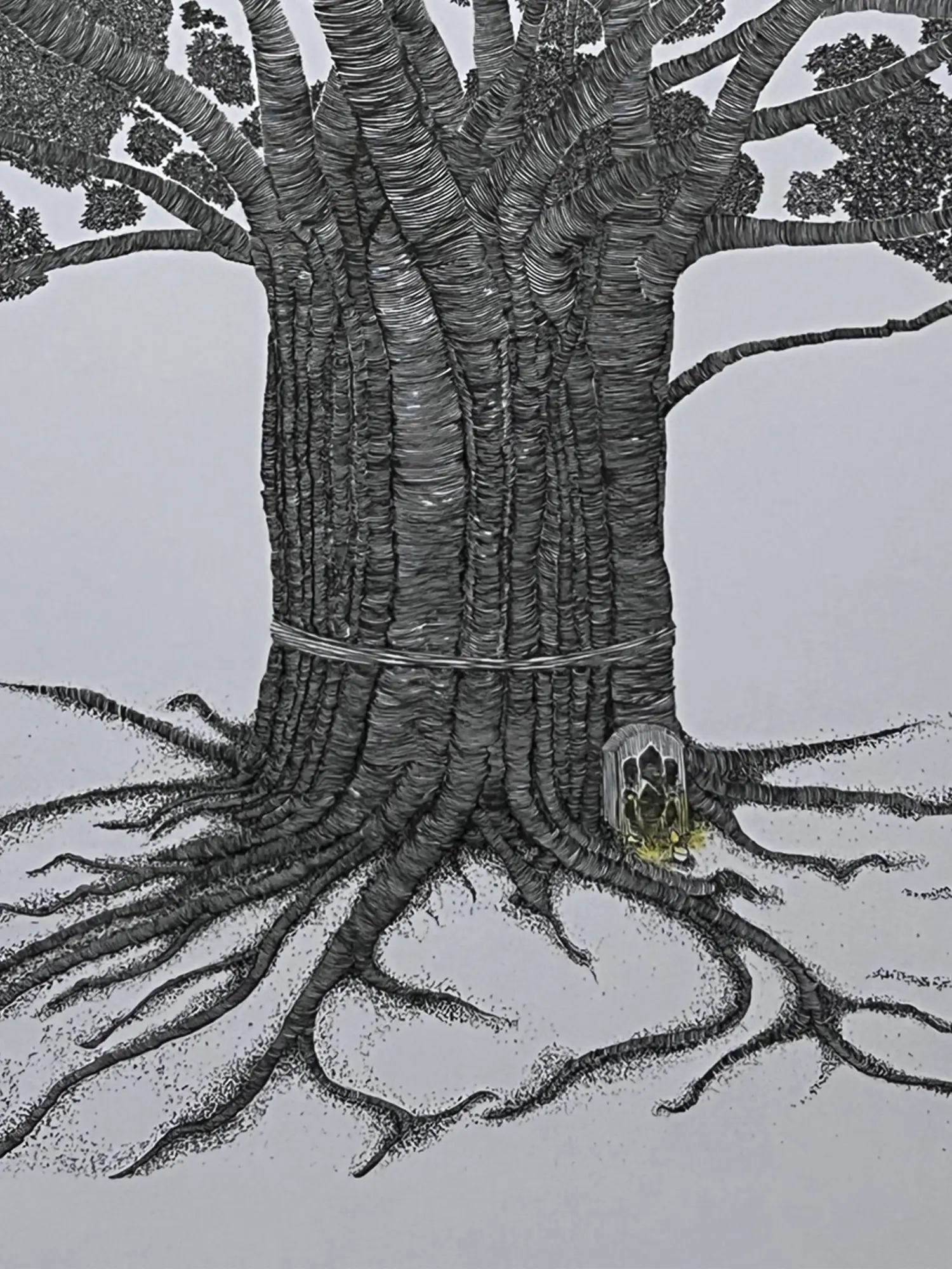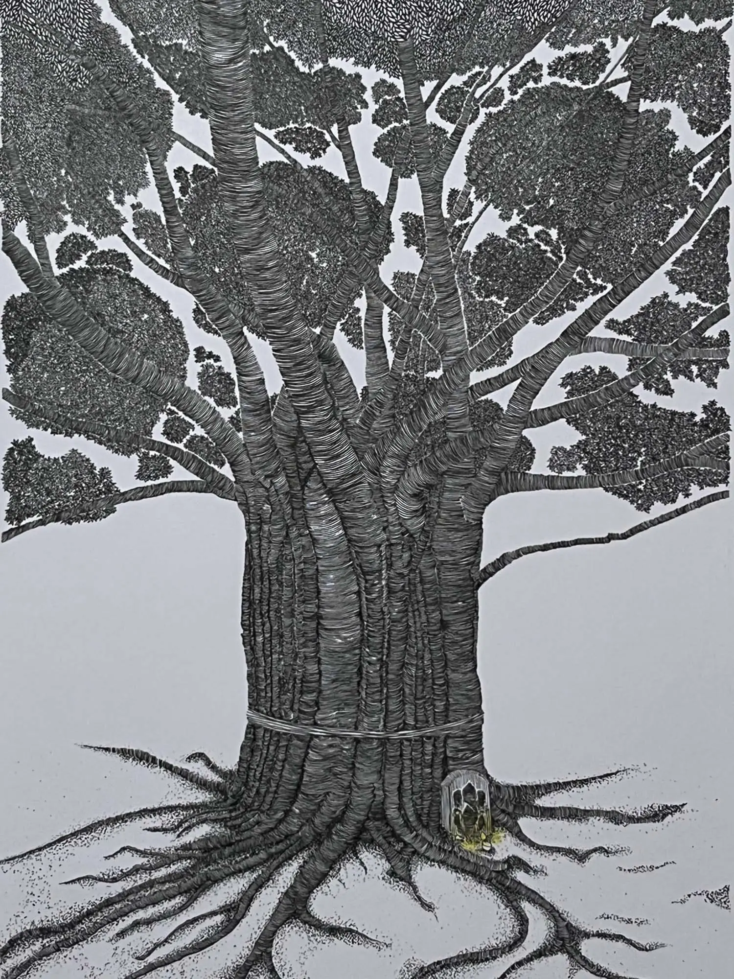 Crafted with meticulous care using the finest ink on paper, this piece is a testament to dedicated artistry. Each stroke is deliberate, building layers of texture and depth that bring the subject to life. The artist’s exceptional skill in rendering the organic form of the tree is evident in the nuanced lines and delicate stippling, showcasing a mastery of the medium that speaks of countless hours devoted to perfection.