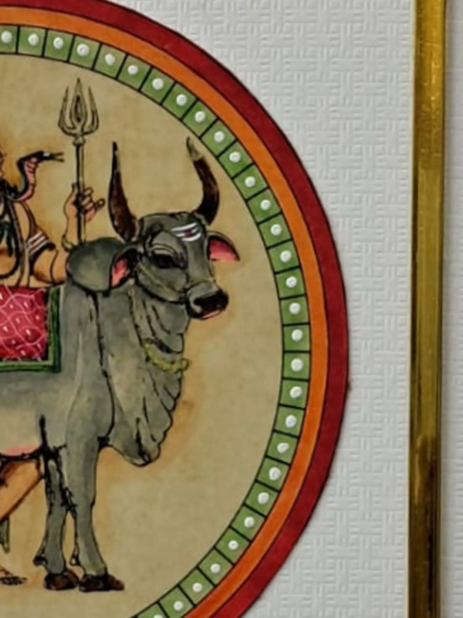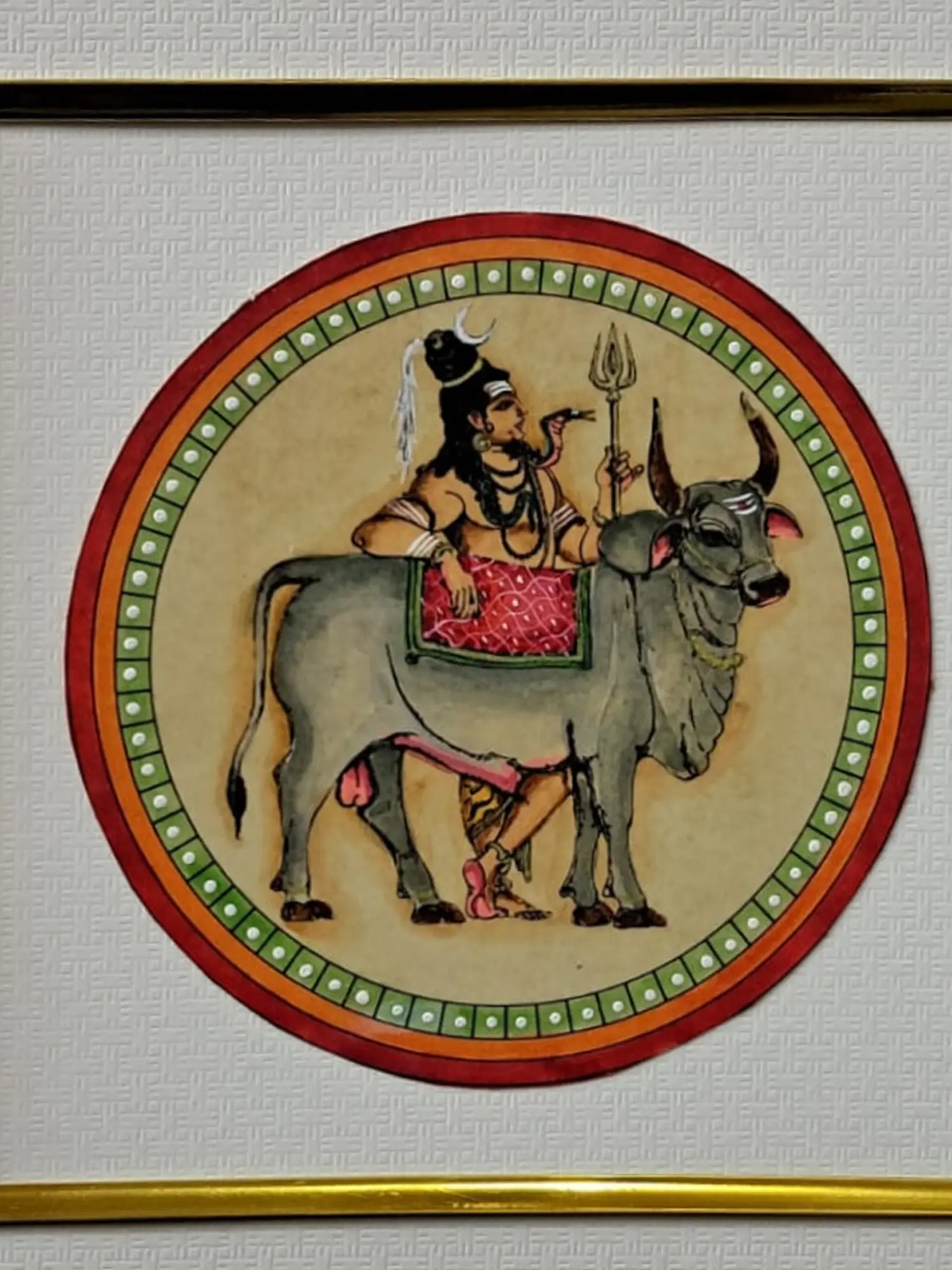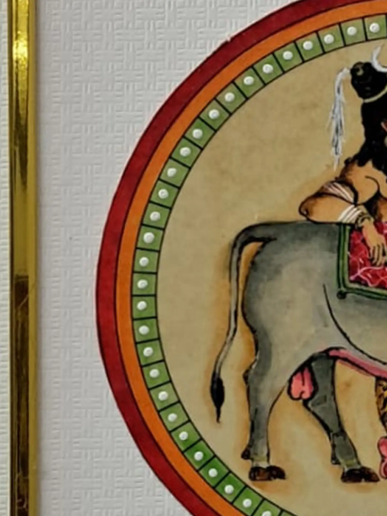 With natural colors on paper, Babita skillfully captures the essence of the Vrishavahan statue, translating the timeless grace of Lord Shiva into an intricate and culturally rich artwork. This piece not only echoes traditional artistic techniques but also serves as a visual delight for the devotees of Lord Shiva and his love for his Nandi.