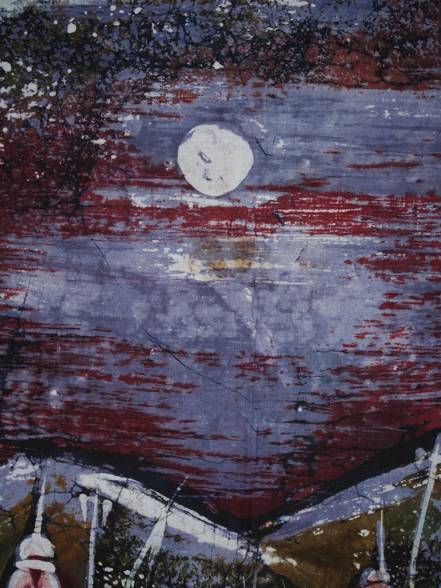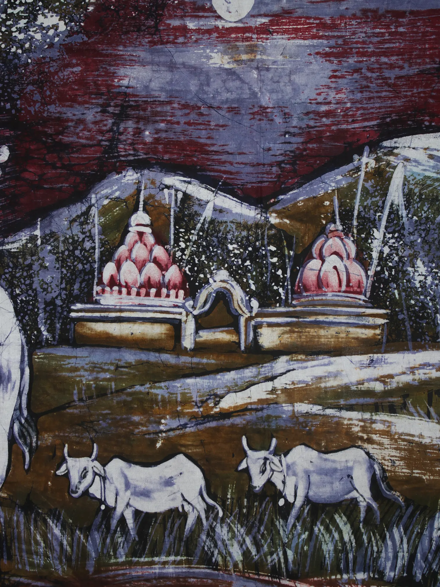 Each stroke of wax and dye in the Batik technique brings life to the scene, inviting viewers into a serene and mystical world where the beauty of devotion and nature coalesce, creating an enchanting visual symphony.