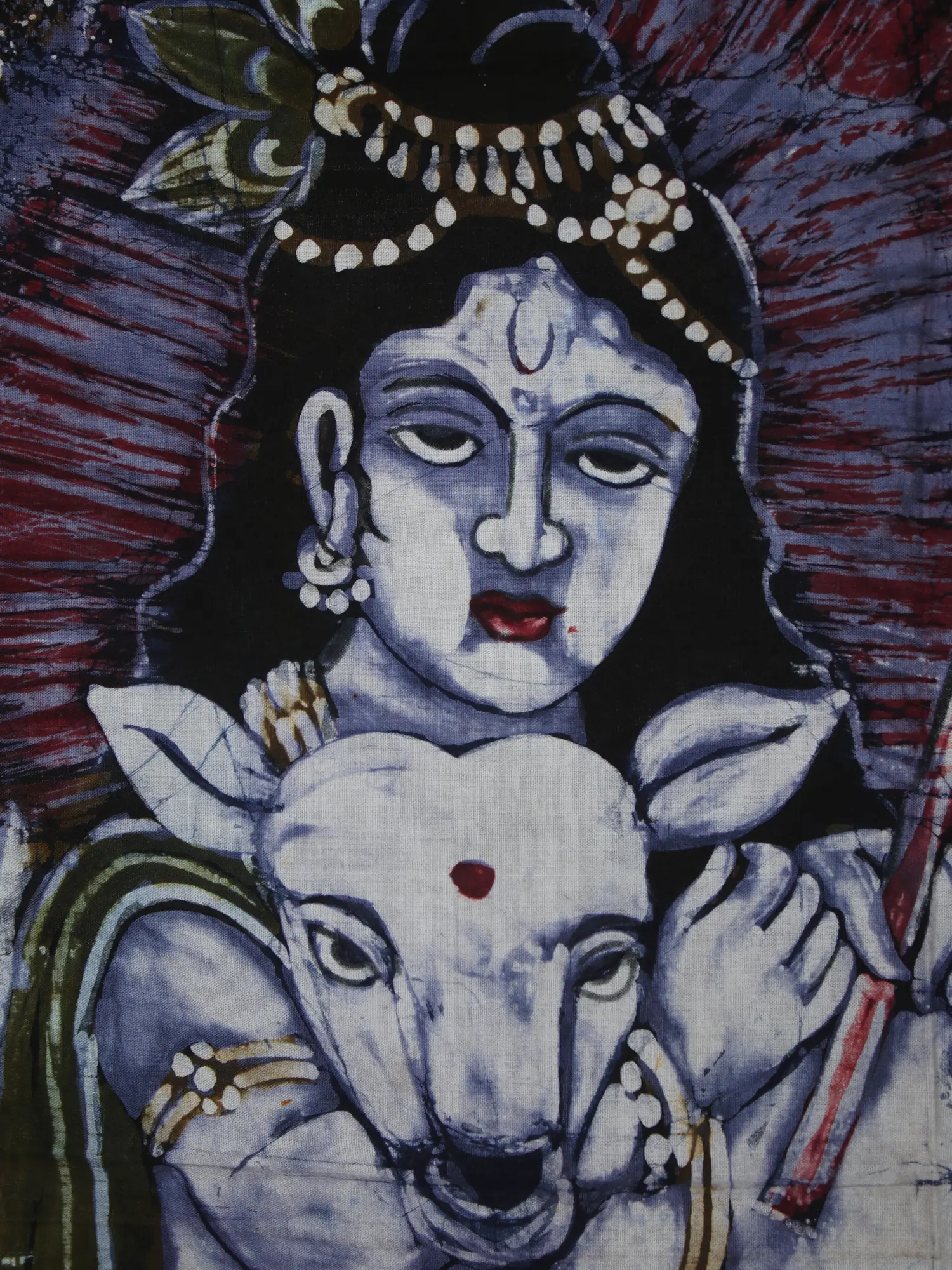 This Batik painting portraying Gau Palak, Lord Krishna embracing a calf beside the Yamuna, is a captivating ode to divine tenderness. The artist skillfully employs varying shades of blue and predominantly purple hues, crafting a fantasy-like aura that transcends the earthly realm. The play of colors gracefully captures the ethereal bond between Krishna and the calf, set against the tranquil backdrop of the Yamuna.