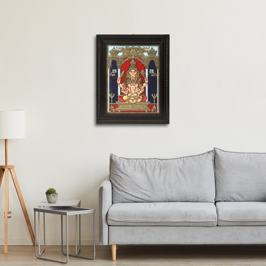 The Gauri Ganesha Tanjore painting captures the profound bond between Devi Parvati and Lord Ganesha, embodying the auspiciousness of the entire universe. This revered portrayal is a source of devotion for countless devotees across India, who seek blessings for progeny and fortune. Devi Parvati, in her Chaturbhuja form, graces a regal throne, radiating the aura of the mother of the universe. Cradled in her loving embrace is Lord Ganesha, portrayed in a dotting form, seated in royal Maharajalilasana. The attention to detail, from their expressions to embellishments, is truly awe-inspiring. The foreground features ritual articles like the burning lamp, while celestial beings shower flowers from above, infusing movement and vibrancy into this Tanjore masterpiece. The frame itself adds to the overall aesthetic richness of the artwork, making it a visual delight and a potent symbol of maternal love and divine blessings.