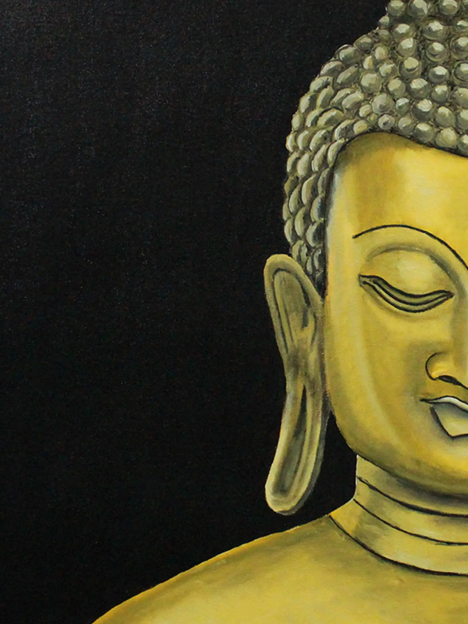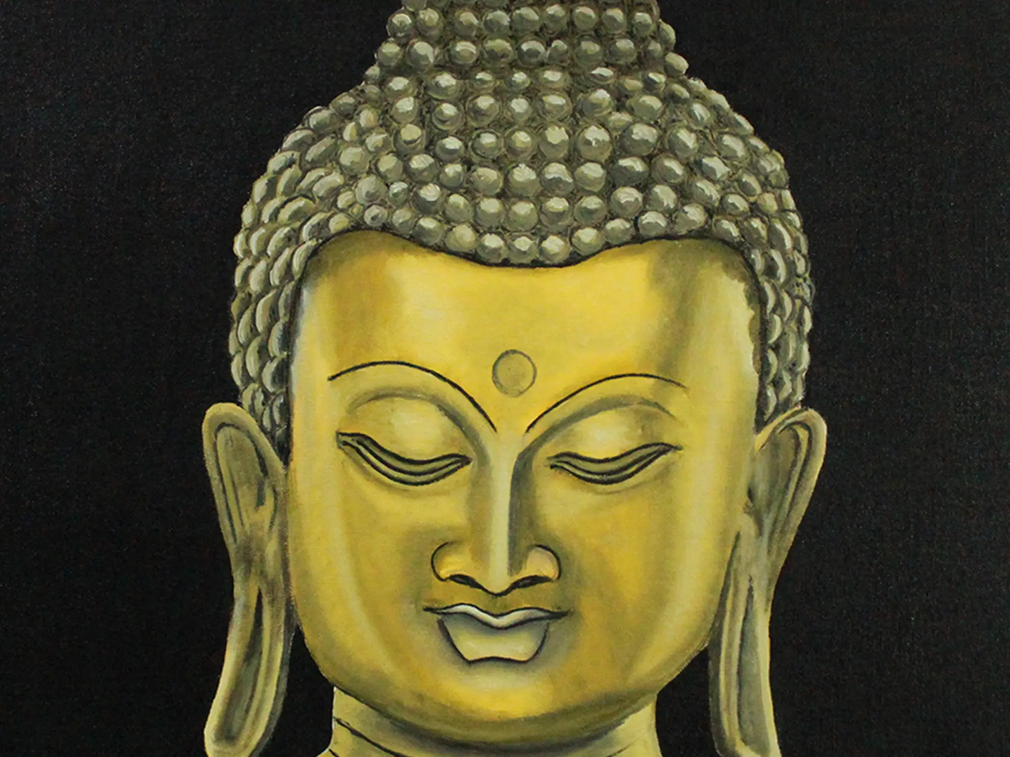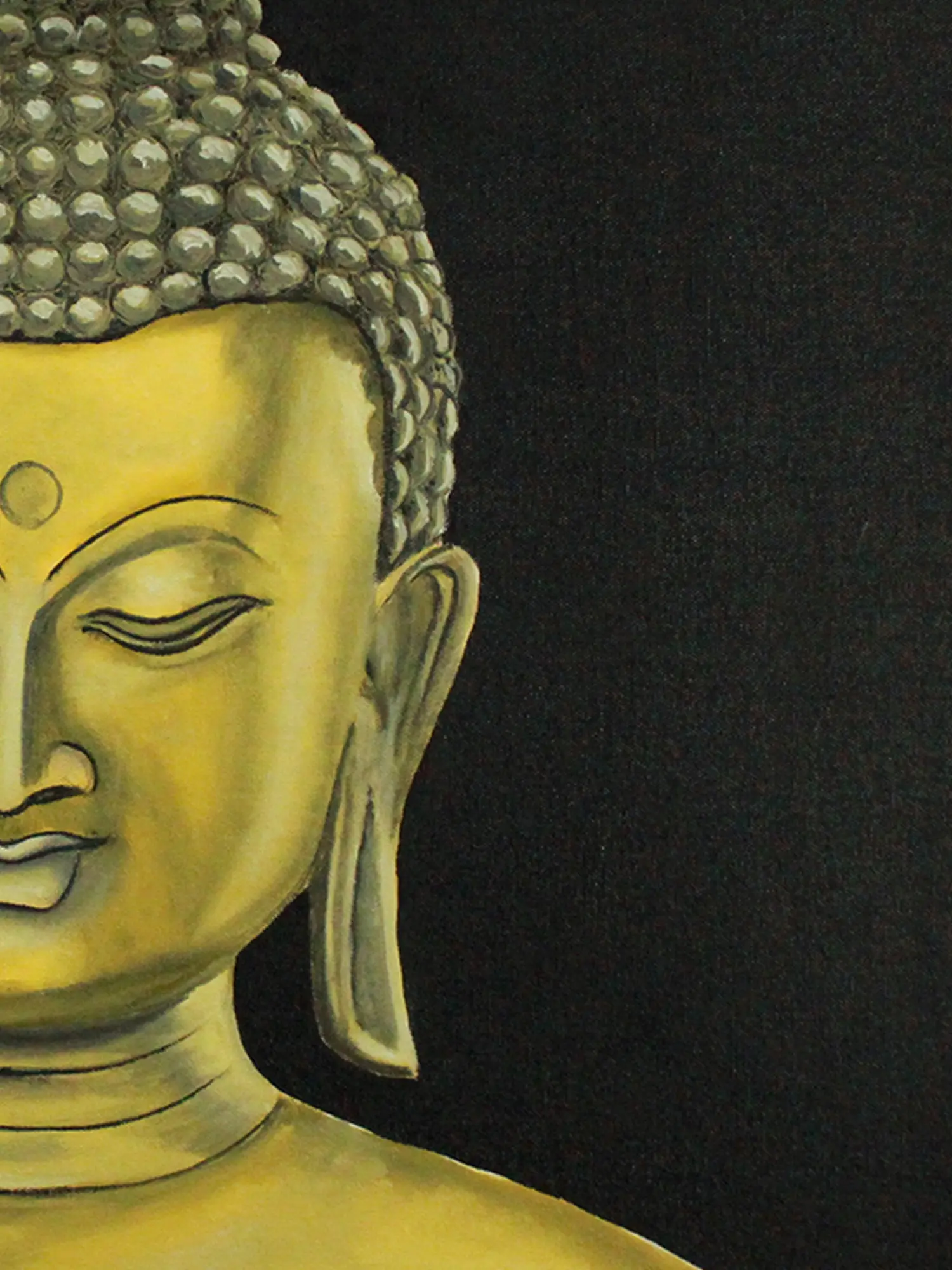 This painting titled "Gauthama Buddha" by Karthik, radiates elegance and spiritual charm. It is an oil on canvas painting, that manifests the serene presence of Buddha in a typical bronze hue, radiating tranquillity and wisdom. With his eyes closed, the Buddha's face embodies a state of deep meditation, directing the human race towards building a connection with their inner self. His pronounced curls are the symbol of profound knowledge, and his half-smiling lips show his state of attainment of Nirvana. The dark background symbolizes the triumph of inner strength over the darkness of confusion. The artwork encapsulates the profound teachings of Buddha, reminding viewers to seek solace in stillness and find enlightenment amidst life's shadows.