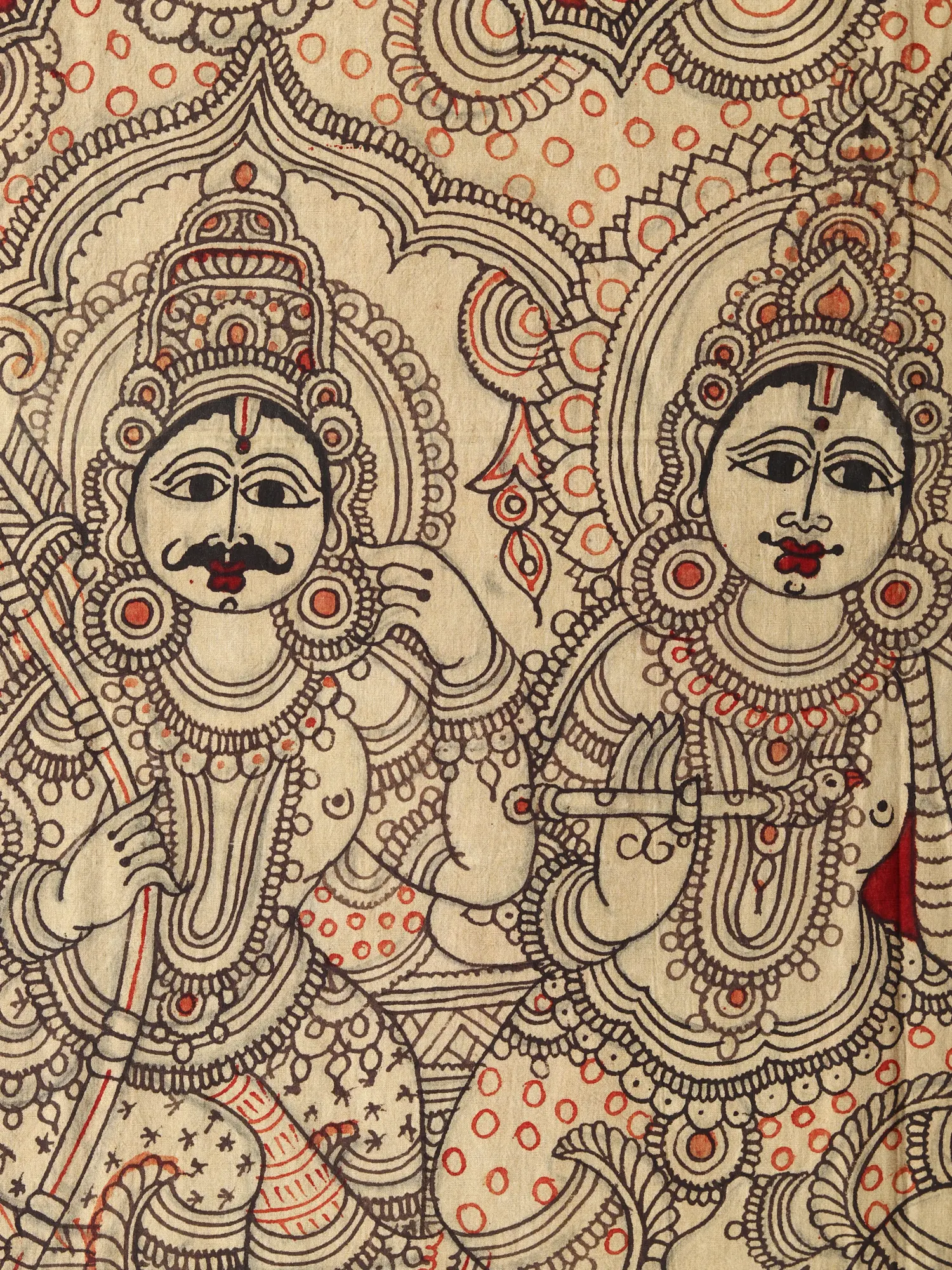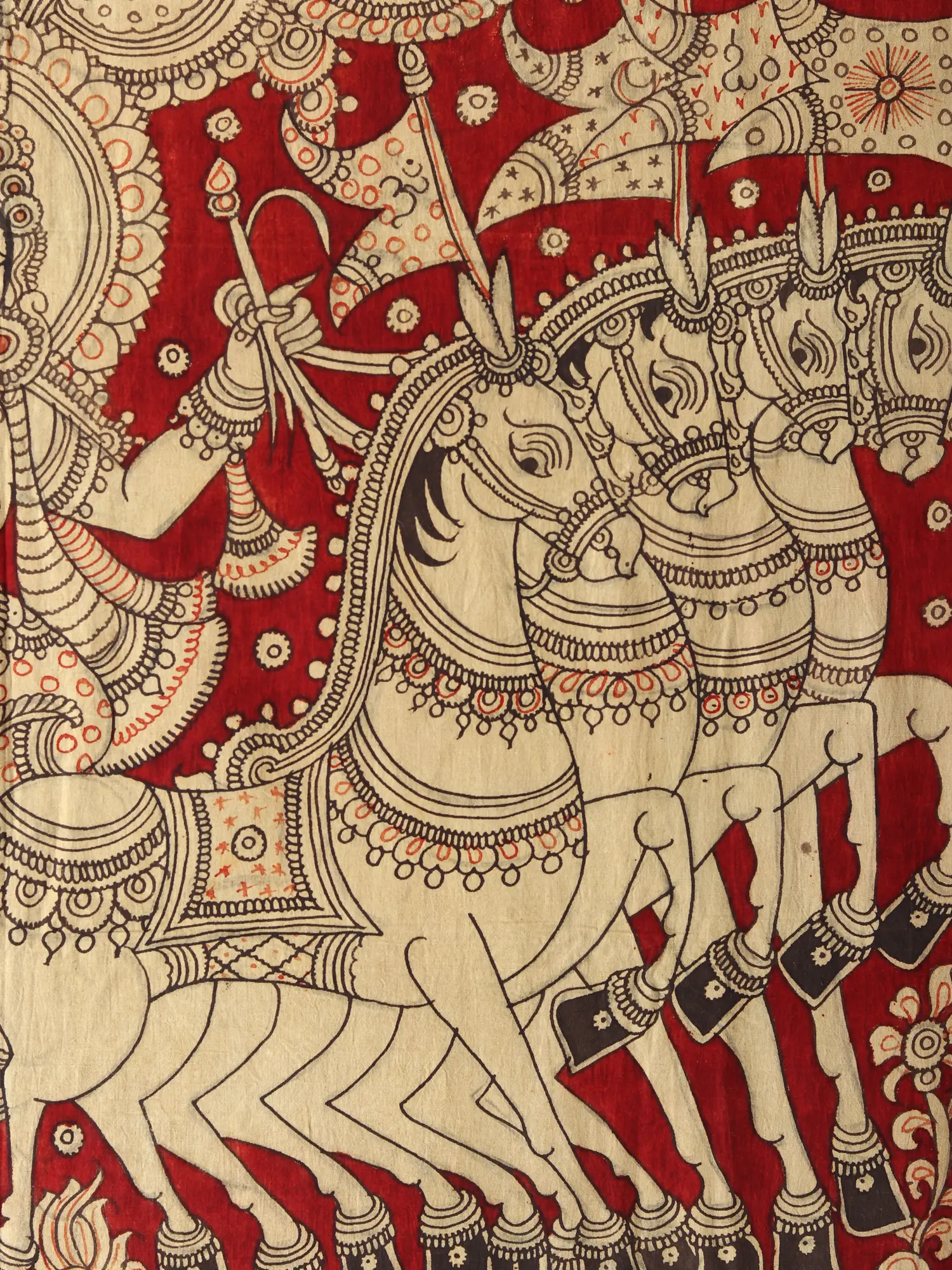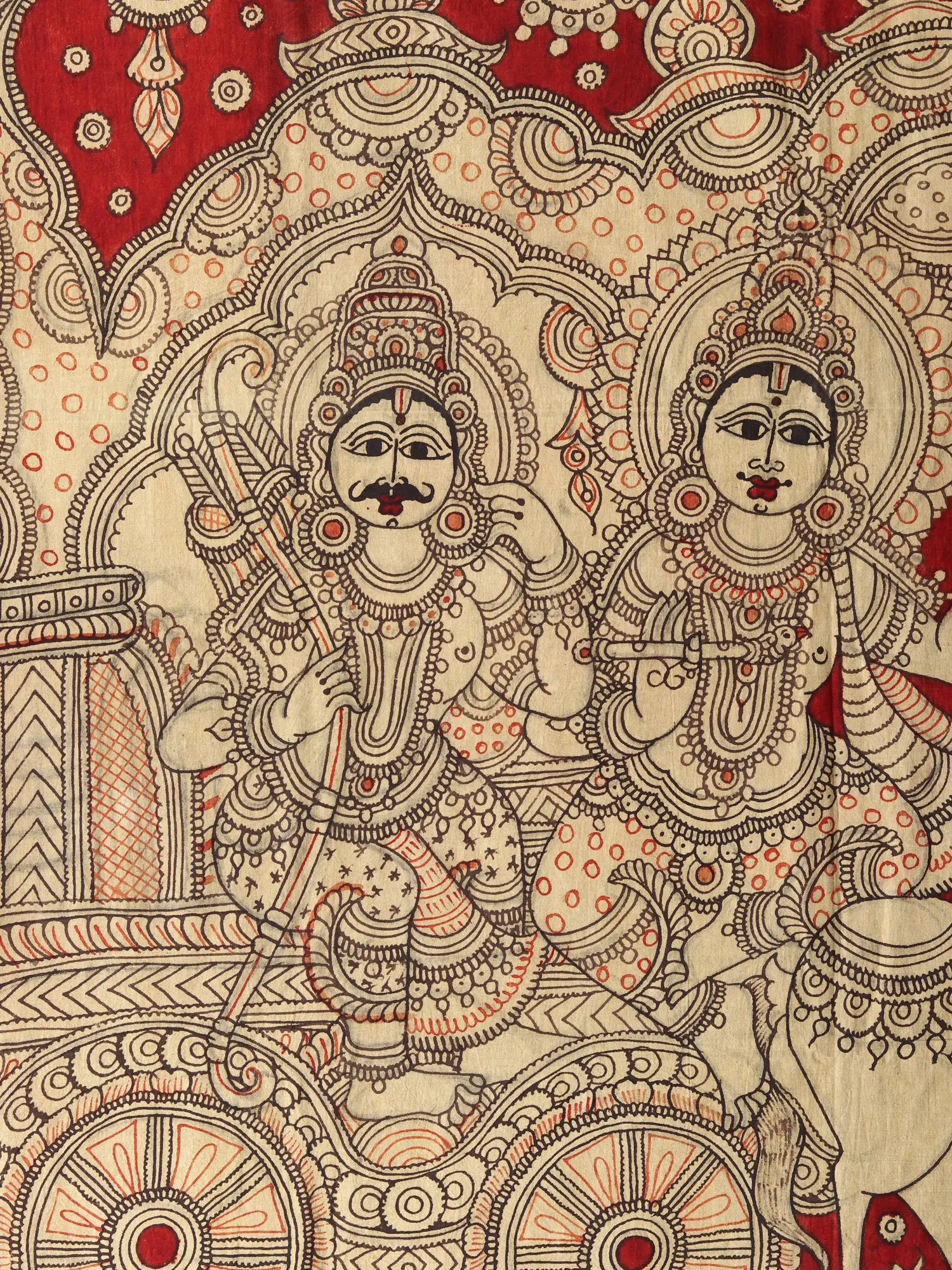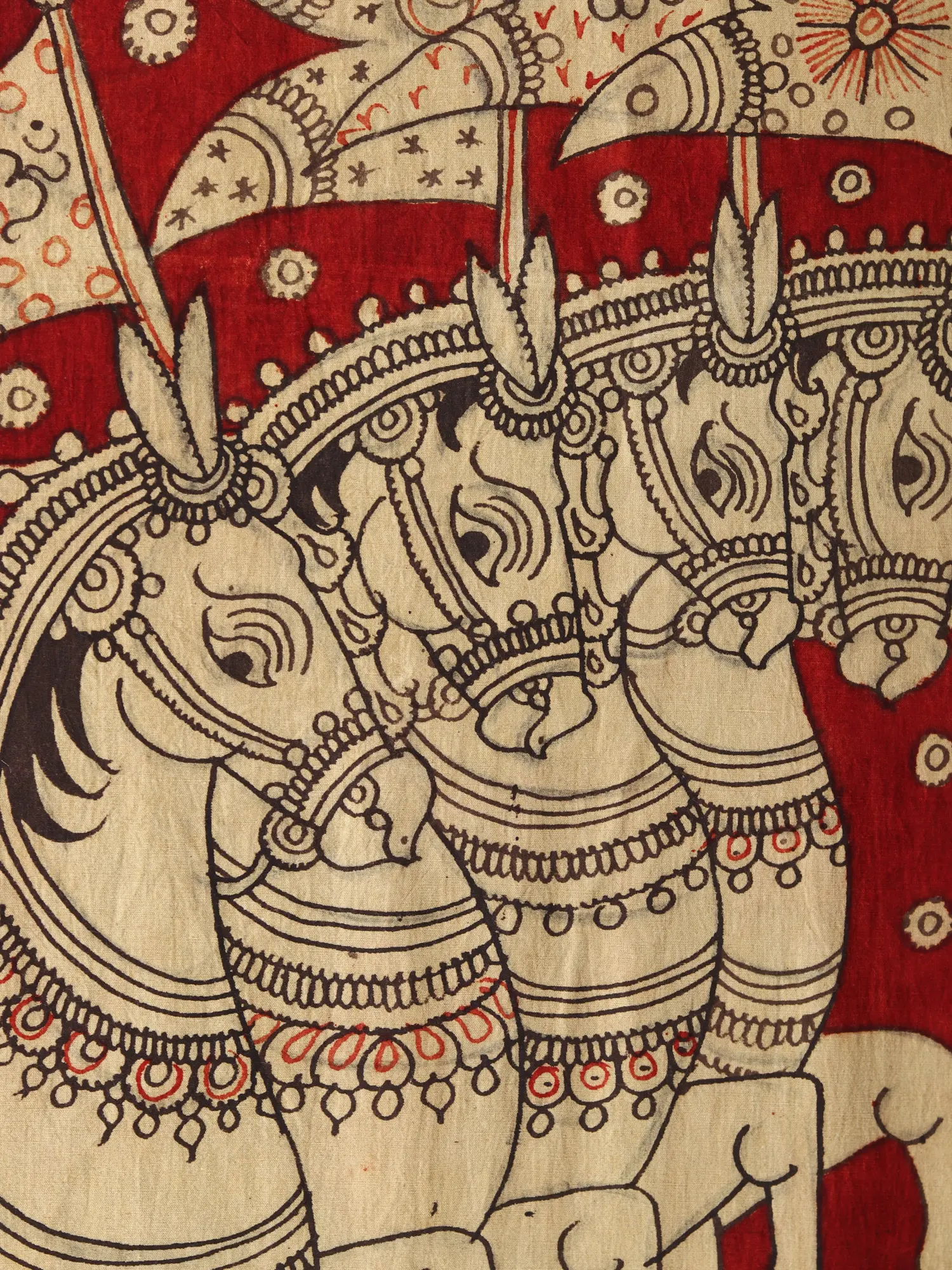 This Geeta Updesha Kalamkari Painting on Cotton beautifully captures the essence of Lord Krishna guiding Arjuna in the Bhagavad Gita. The intricate artistry on the maroon-colored background brings to life the profound wisdom imparted during a crucial moment in the Mahabharata. The depiction likely showcases the pivotal scene where Sri Krishna advises Arjuna to transcend dualities and focus on his duty, or 'karma.'