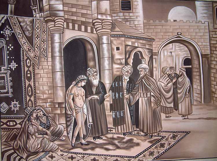 This painting narrates a sordid tale of the slave market whereby one girl is on display while the other two await their turn. The girl barely wears anything to cover her body. The old man, the seller here, holds the delicate hand of his ware to show her to the prospective buyer. Another assistant of his, narrates the qualities of the slave girl in order to lure him. Further down the street, three men stand engaged in serious discussion, not concerned with the slave trade going on next to them.