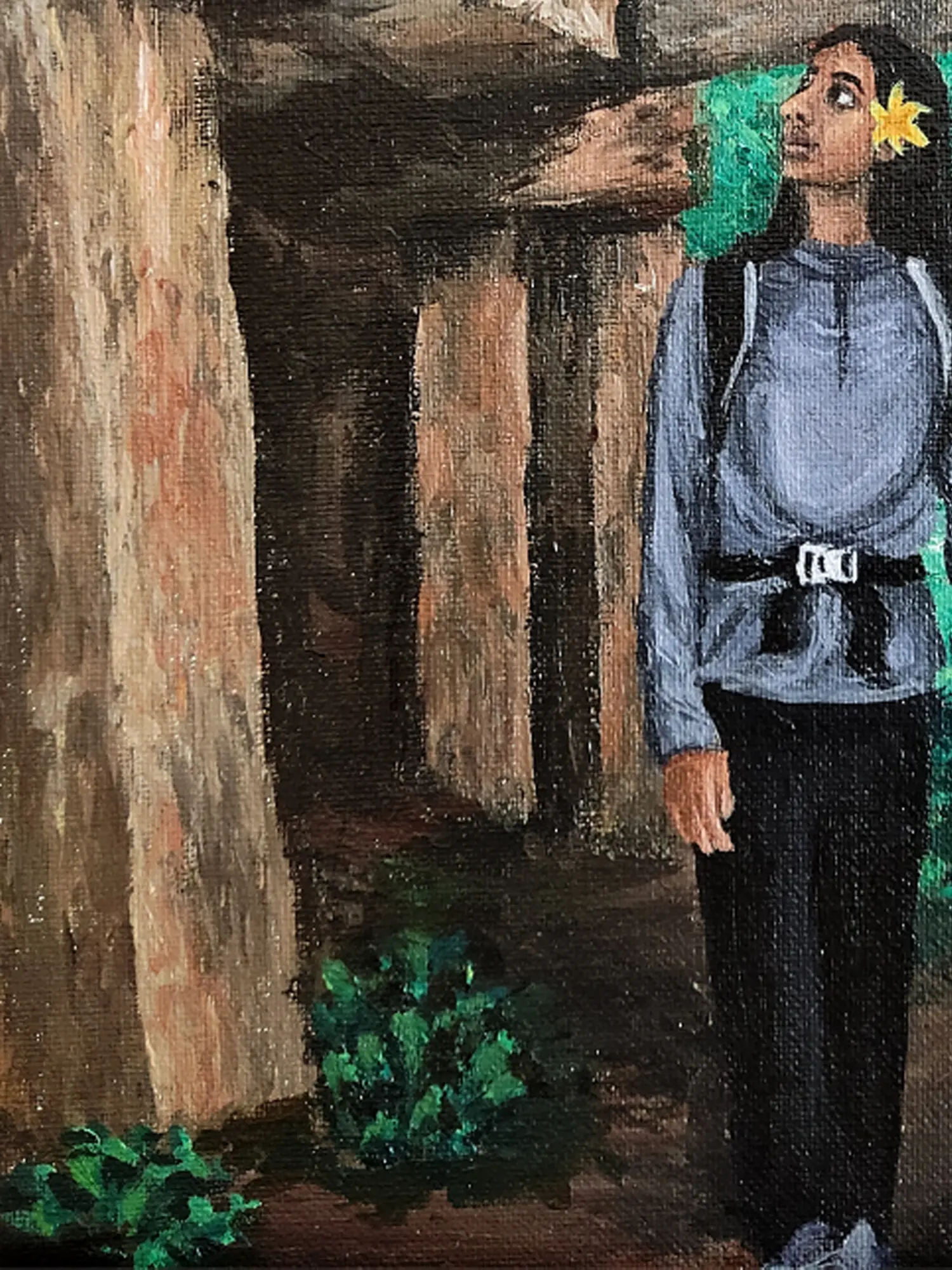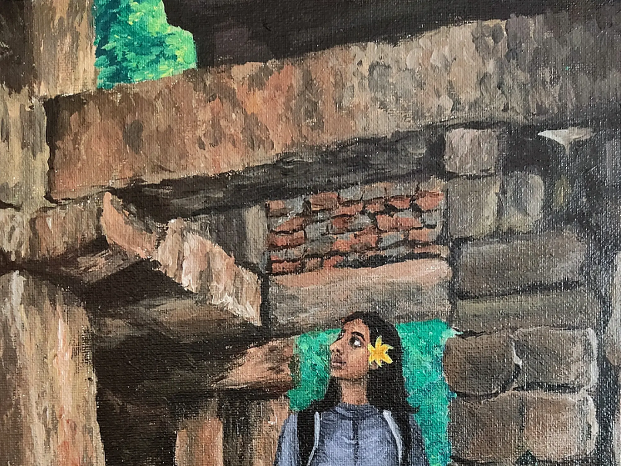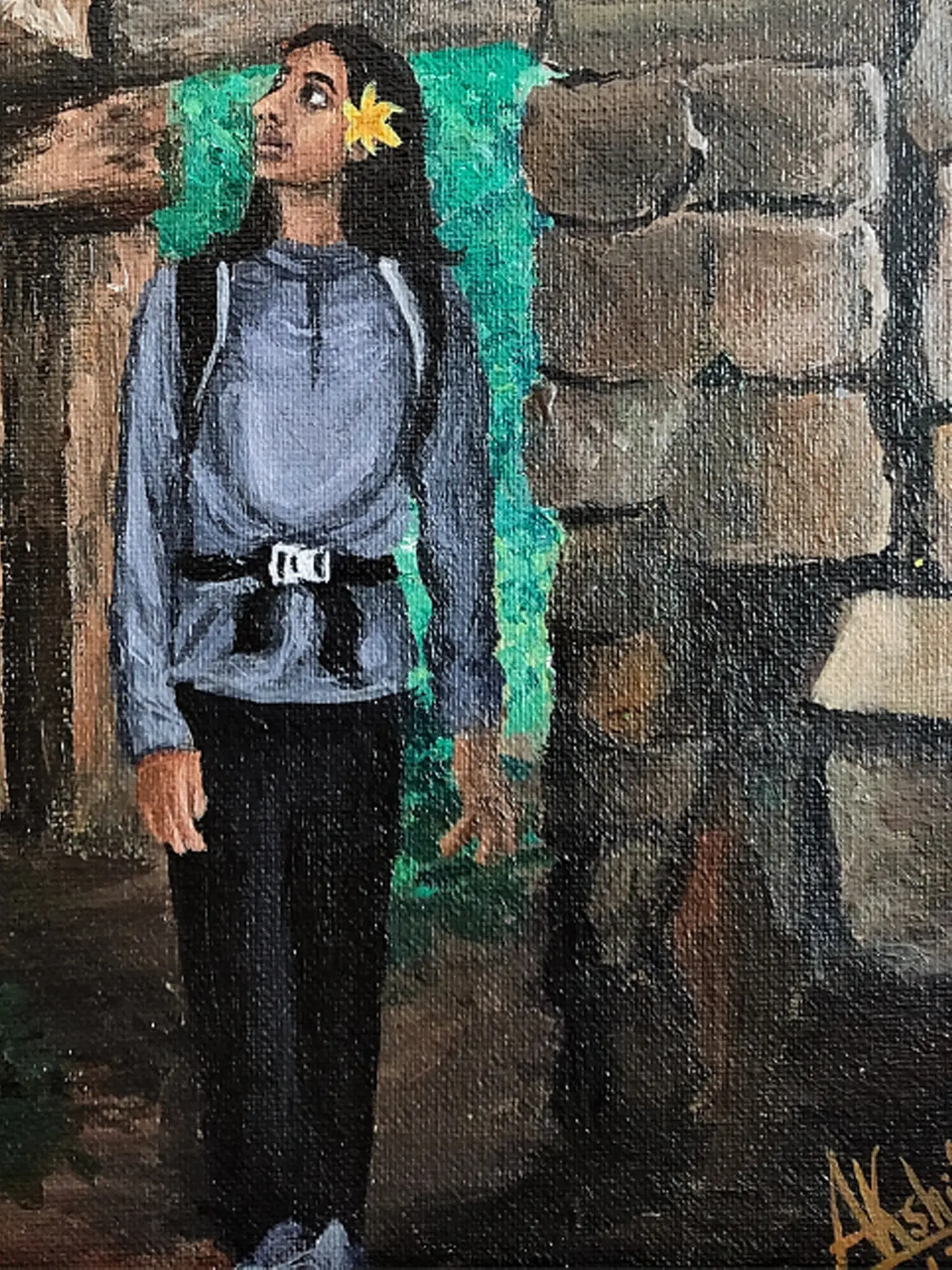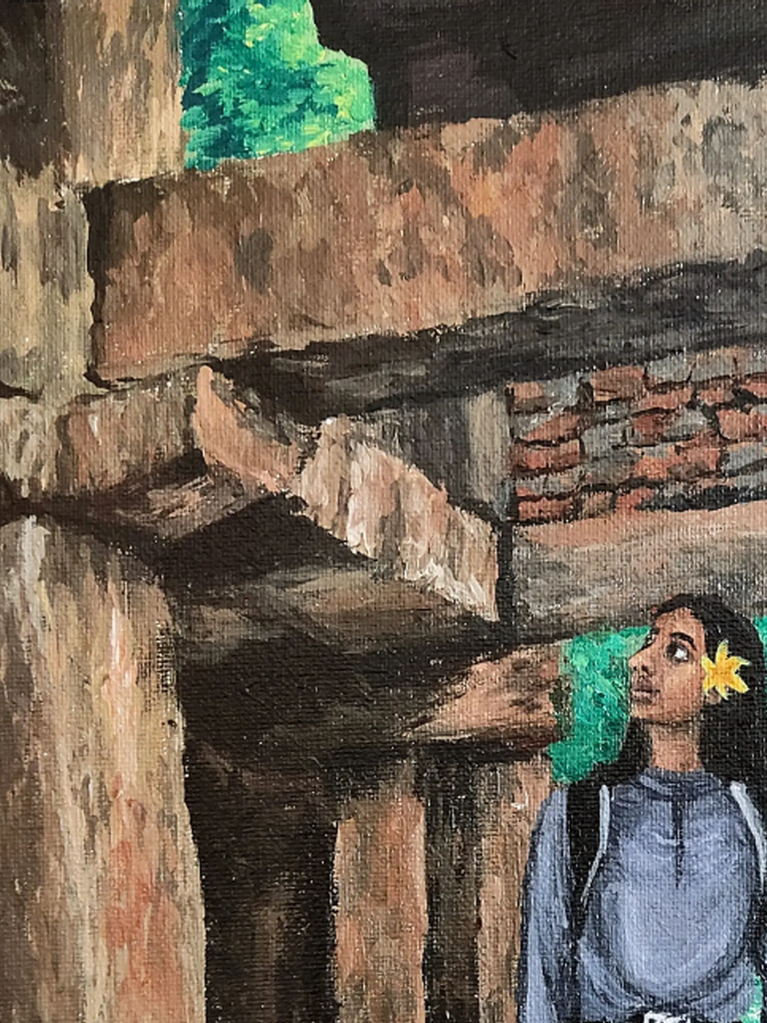 The subject of this acrylic on canvas, a young girl, seems to have wandered and stumbled upon mysterious ruins, whose ancient charm has gripped her imagination and heart. With her twinkling eyes fixed on the antiquated beauty of the structure, which is stripped of its pristine grandeur, the girl with her travelers’ backpack and inquisitive mood fills the heart with an inspiration to be lost in the wilderness to find new musings.