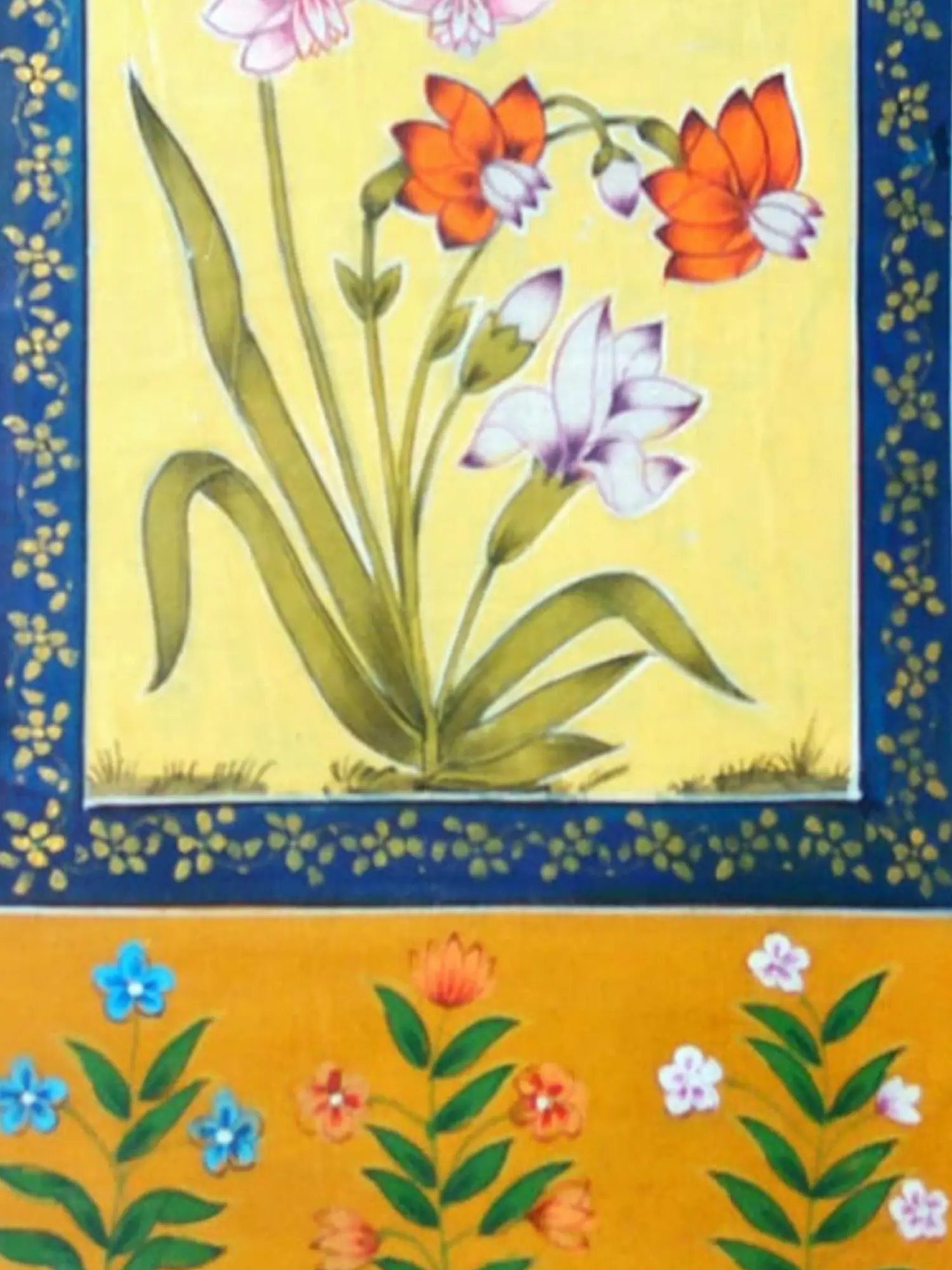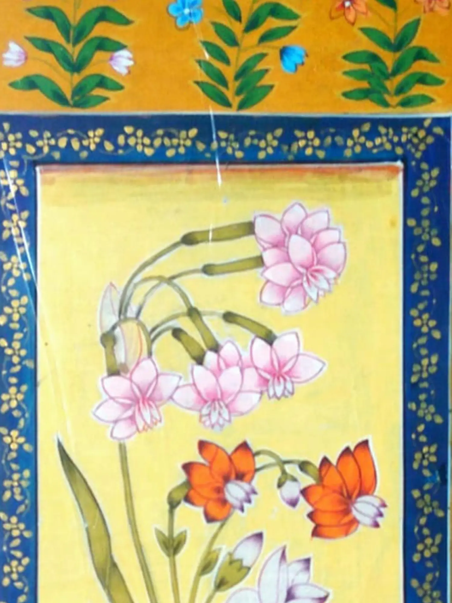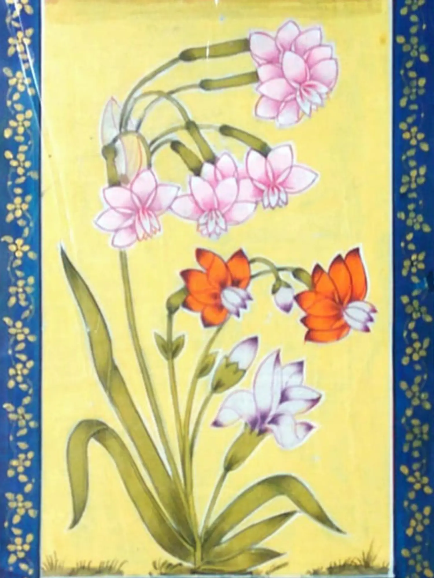 The composition features a central bouquet of delicate blossoms, rendered in soft pinks, whites, and vibrant oranges, all emerging from gracefully arching stems and verdant leaves. This is framed by a rich, deep blue border adorned with intricate golden floral motifs, which in turn is set against a warm, ochre-yellow background. The outer expanse is further embellished with a charming pattern of scattered green foliage and small, jewel-toned flowers, creating a harmonious interplay of color and detail. The painting measures 13 inches in height and 9 inches in width, a perfect scale to capture attention without overwhelming its surroundings.
