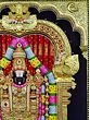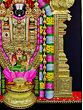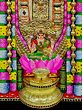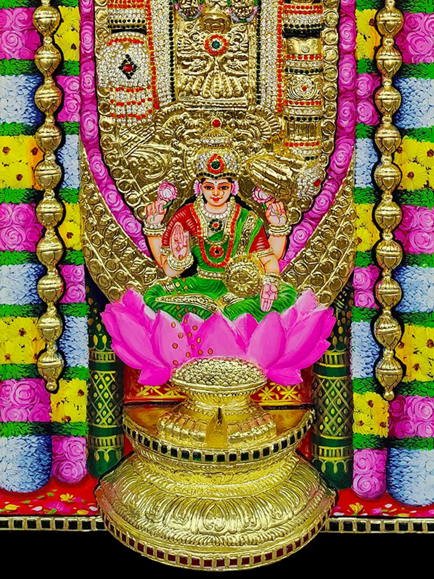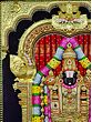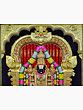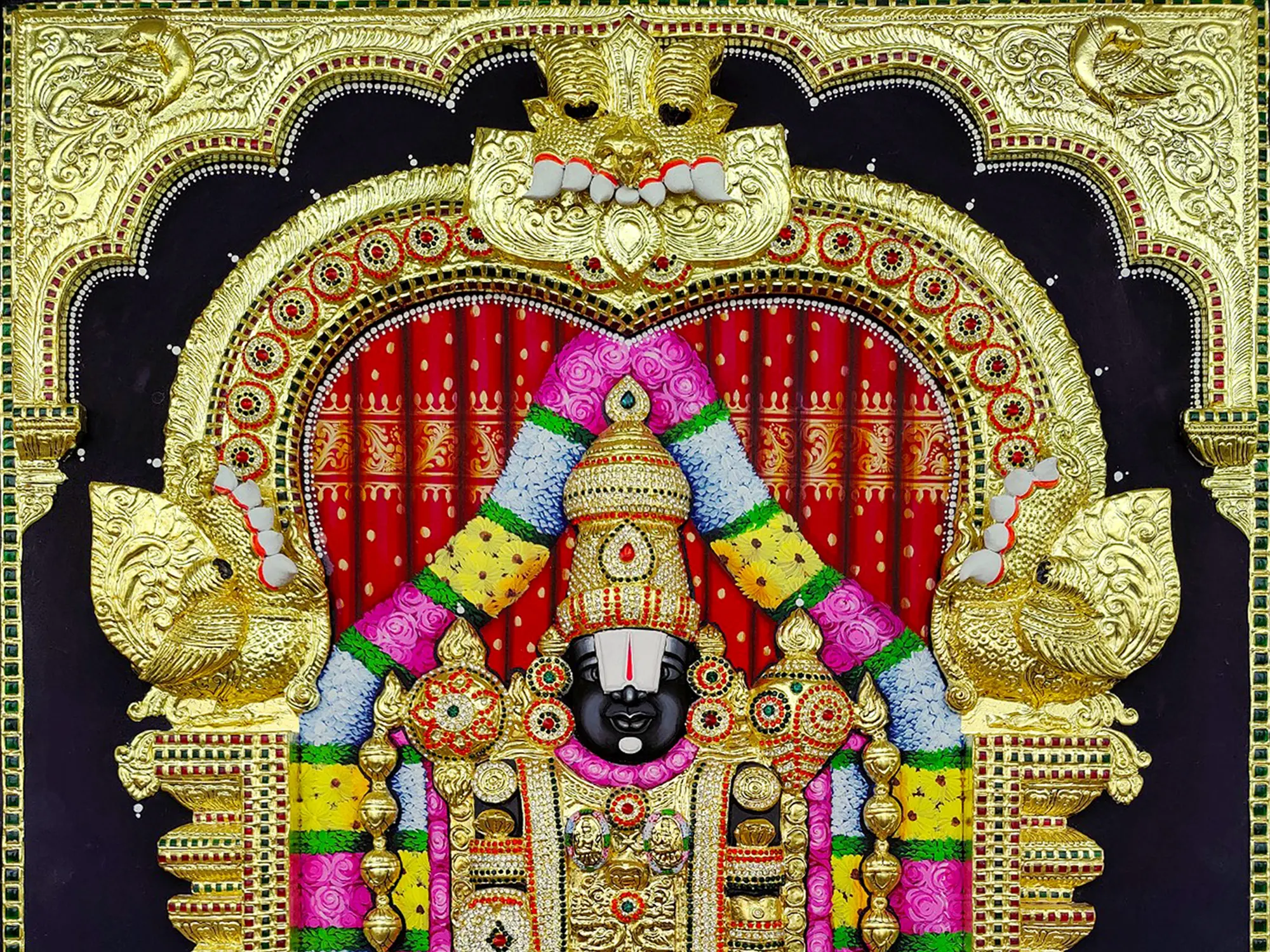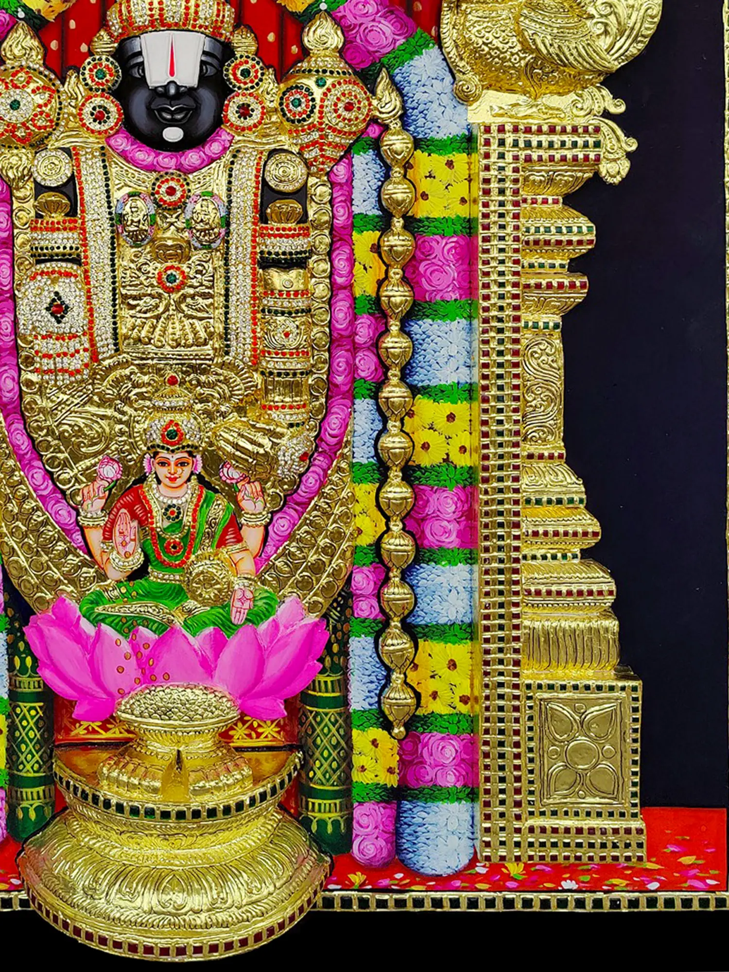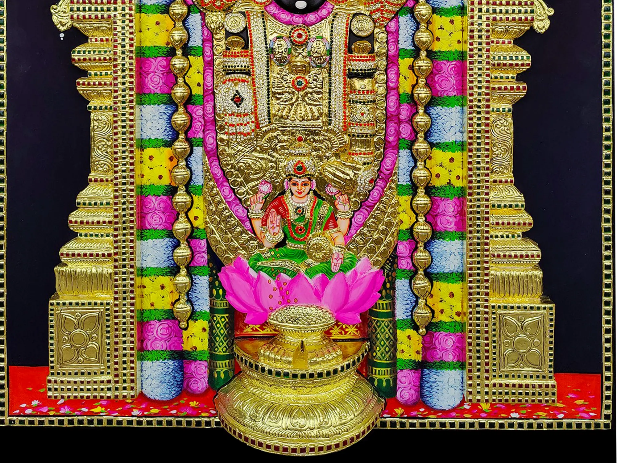 Tirupati Balaji- the most powerful form of Vishnu on Earth, along with his beloved goddess Lakshmi in this marvelous Tanjore painting is a vision of divinity. Balaji appears in his popular form, adorned all over with ornate golden jewelry, a fragrant floral garland, Vaishnava tilak (forehead mark), and his attributes- Shankha (conch) and Chakra (discus). Goddess Lakshmi is enthroned on a Padma or lotus, alluding to her form as Padmavati (the lotus-born one), taken to accompany Vishnu as Tirupati.