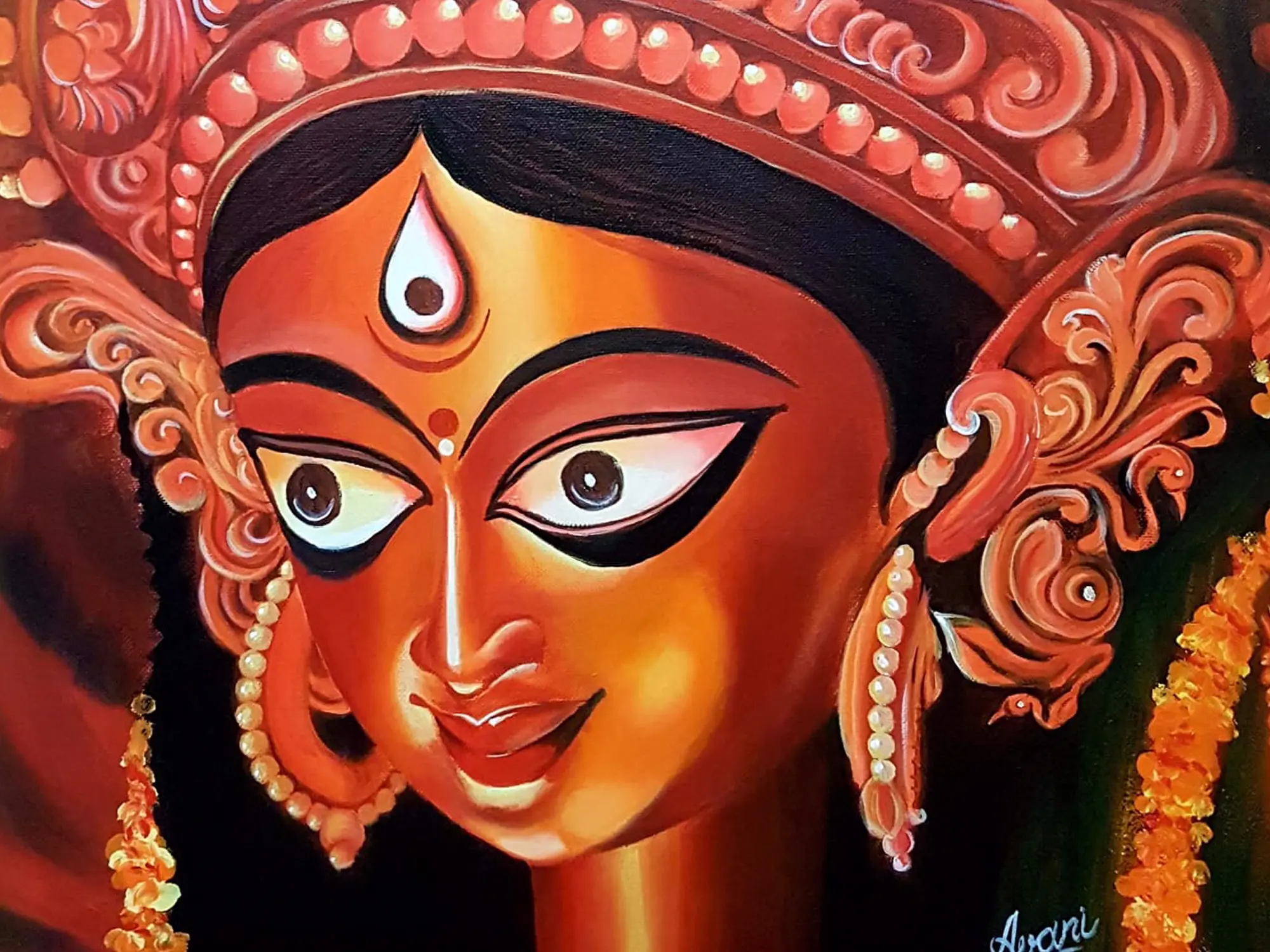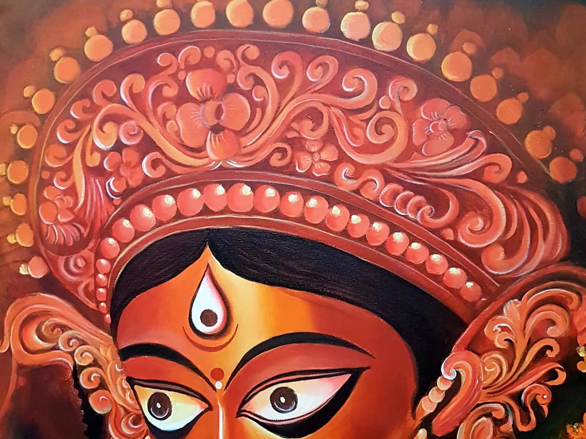 The composition, measuring 20 inches in height and 20 inches in width, is a visual feast, drawing you into the serene yet powerful expression of the goddess. Her iconic third eye, the intricate headdress adorned with floral motifs, and the delicate pearl earrings are rendered with remarkable precision. The interplay of warm, fiery tones against a deep, enigmatic background creates a dynamic and emotionally resonant viewing experience.