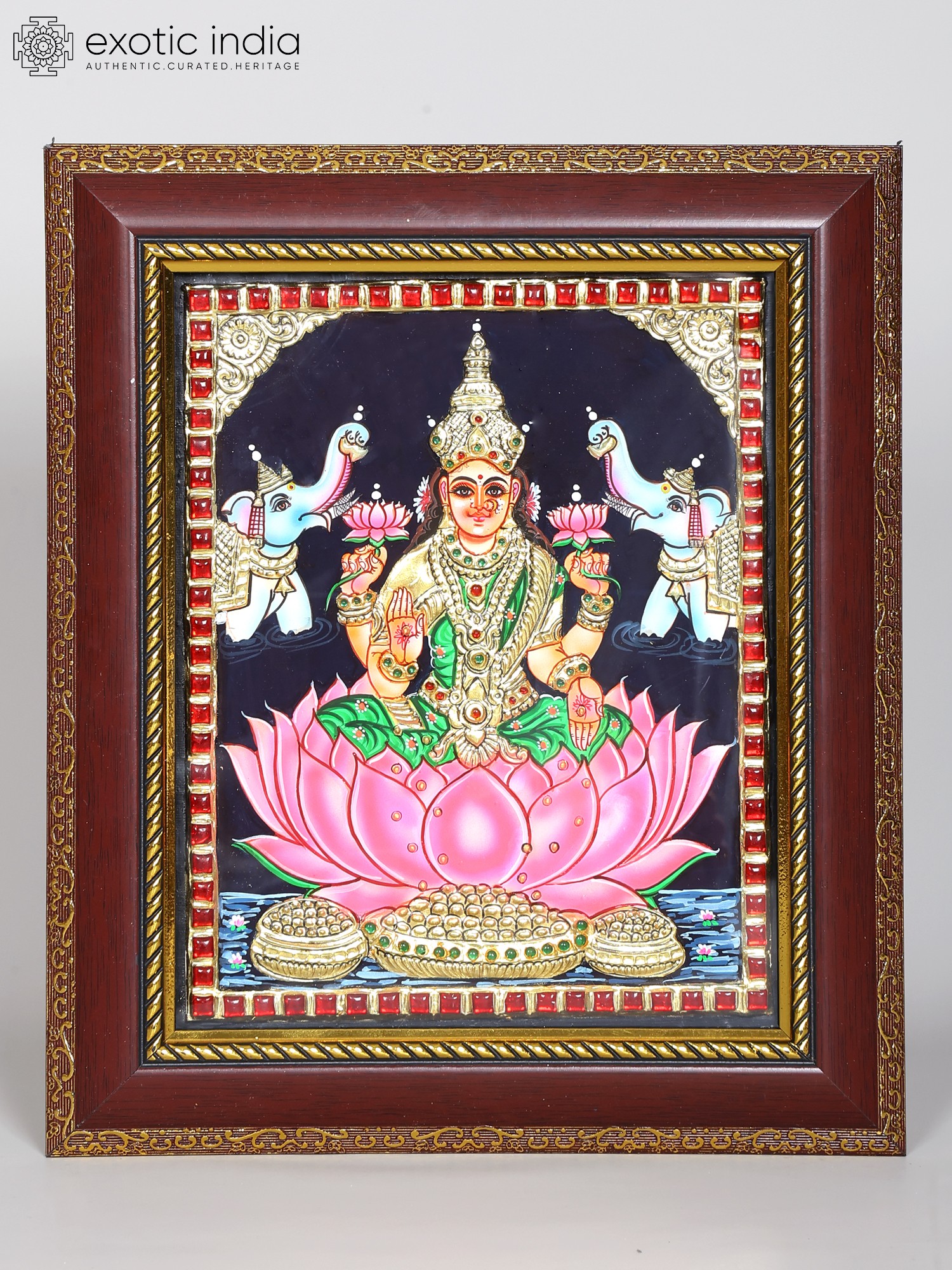 Goddess Gajalakshmi Tanjore Painting | Traditional Colors With 24K Gold | Teakwood Frame