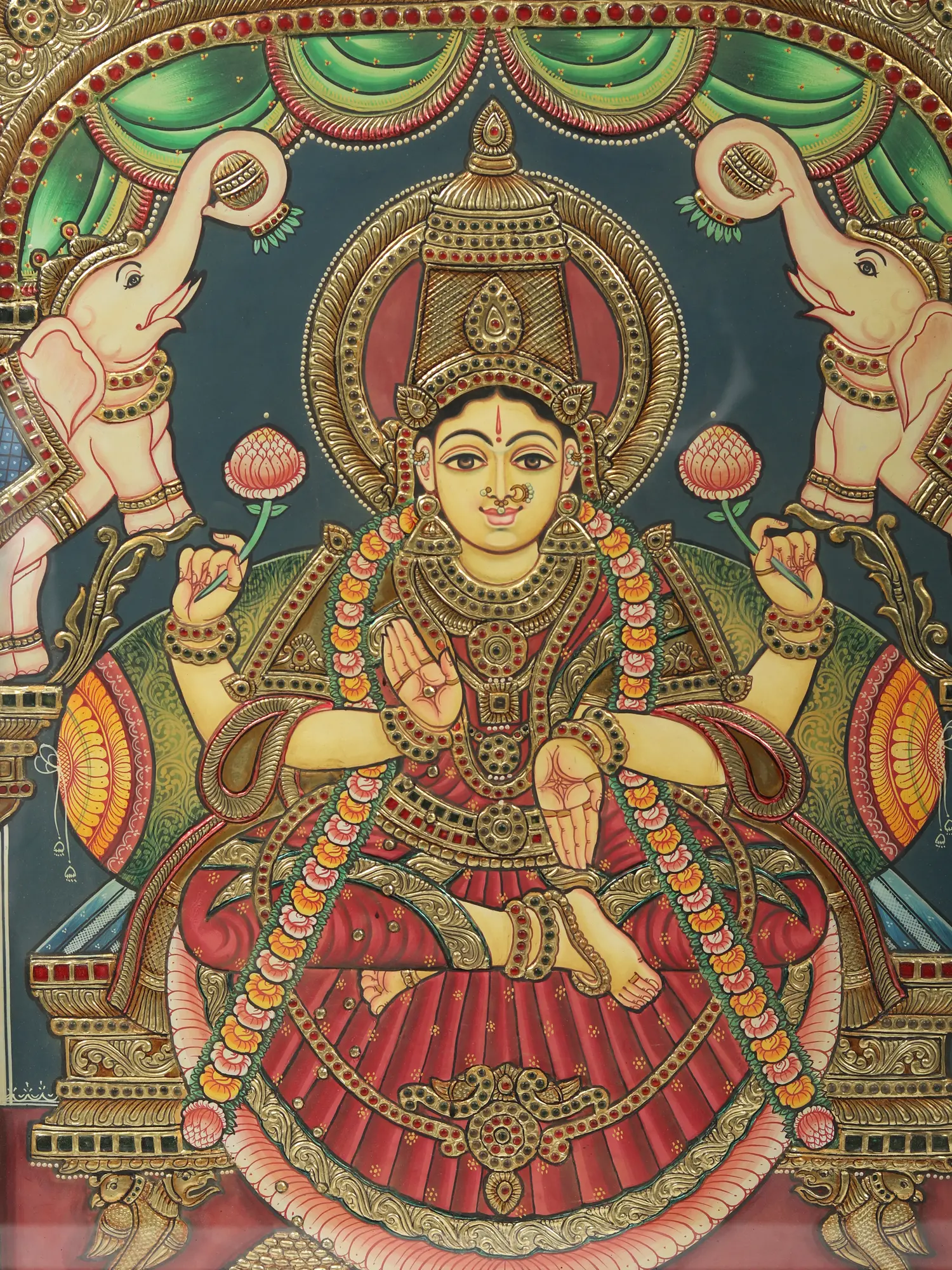 This artwork draws its inspiration from the iconography of Gajalakshmi, a revered form of Lakshmi, the Hindu goddess of wealth, fortune, and prosperity. In Hindu mythology, she is often depicted flanked by elephants, signifying her royal power and her ability to shower blessings. This particular depiction resonates with the rich cultural heritage of South India, a region where Tanjore paintings have flourished for centuries, preserving sacred narratives and aesthetic principles. You'll appreciate how this piece connects you to a lineage of devotion and artistic excellence.