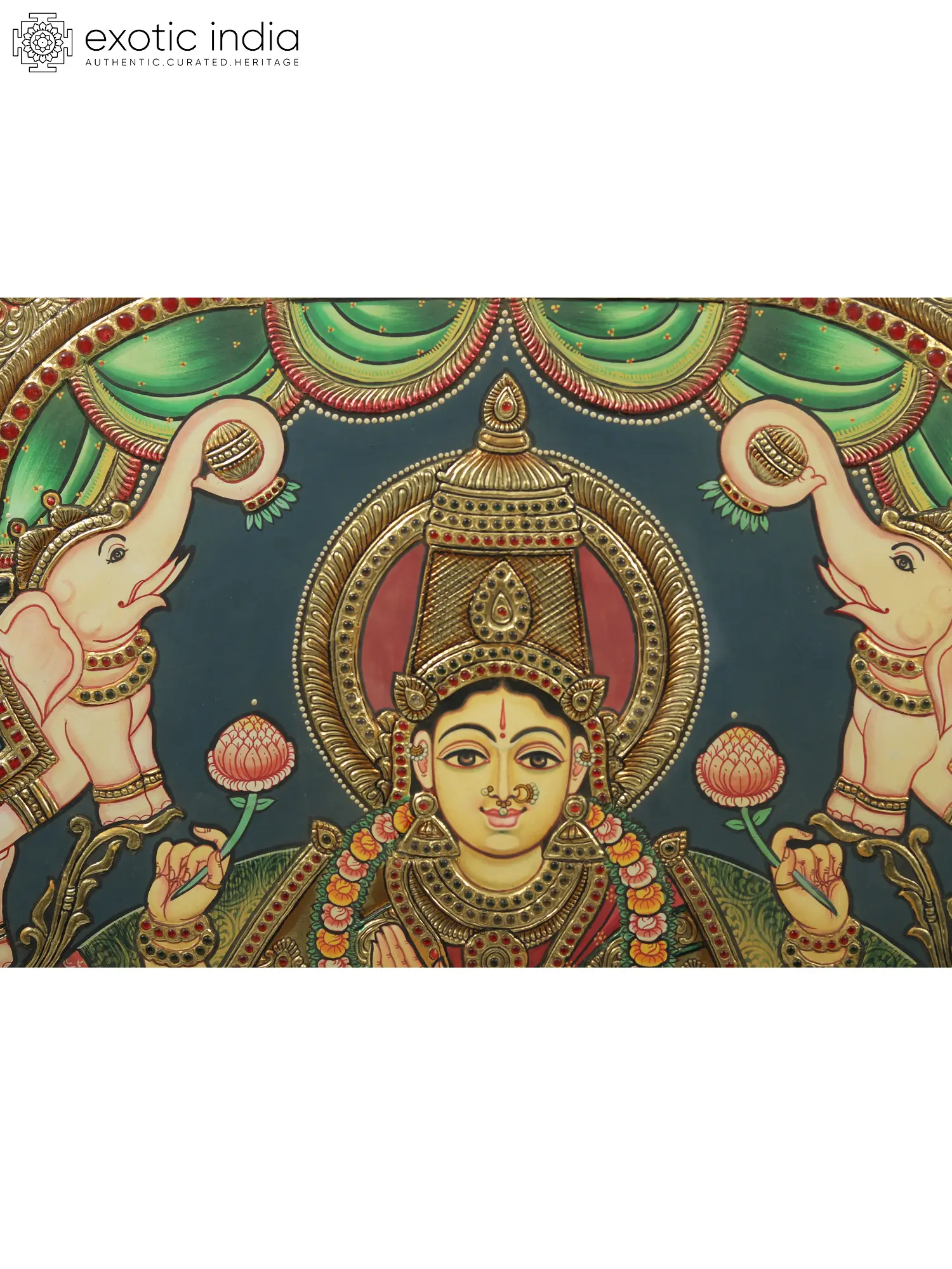 Observe the central figure, adorned in opulent attire and jewelry, seated in a posture of serene authority. Flanking her are two majestic elephants, symbolic of strength and abundance, each gracefully holding a lotus flower, another emblem of purity and prosperity. The surrounding architectural motifs and decorative borders are rendered with remarkable precision, highlighted by the shimmering gold work. The harmonious color palette and the deep, rich tones of the traditional pigments create a visual symphony, further enhanced by the subtle texture of the gold appliqué. The entire composition measures 28 inches in height and 22 inches in width, presented within a tasteful frame that complements its grandeur.
