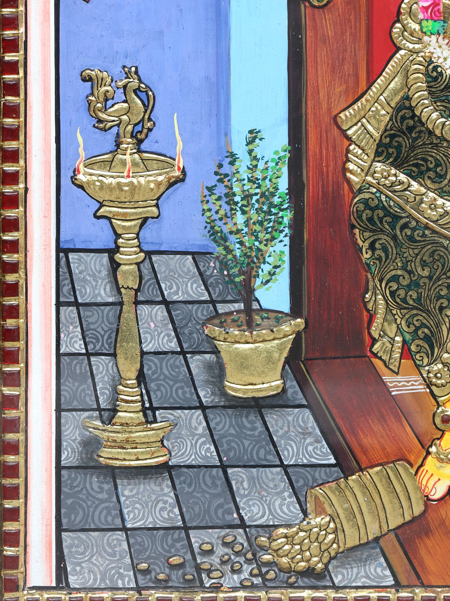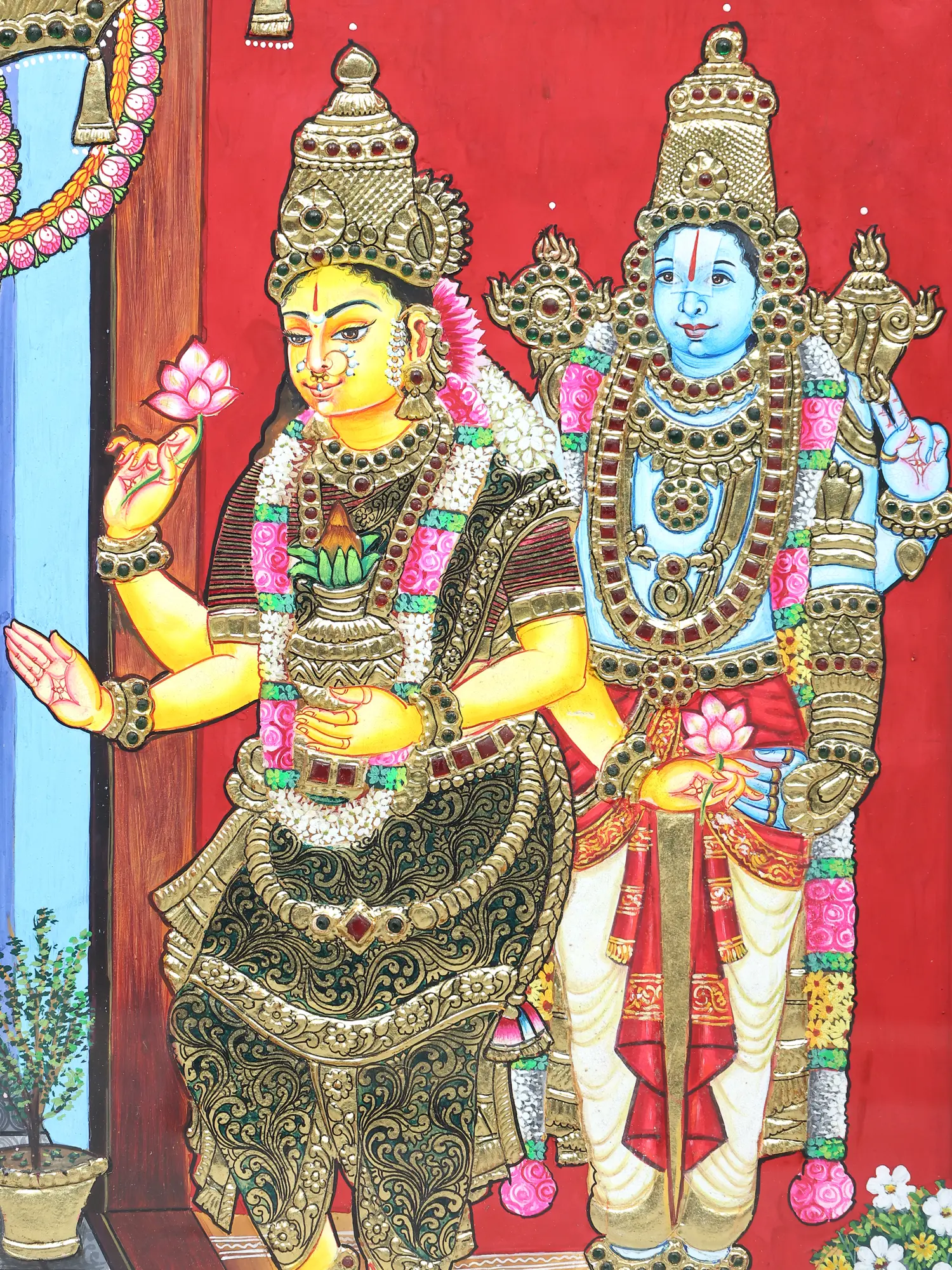 Four Armed Goddess Lakshmi Seated on Kirtimukha Throne | Traditional Colors with 24 Karat Gold | Embossed Tanjore Painting with Frame