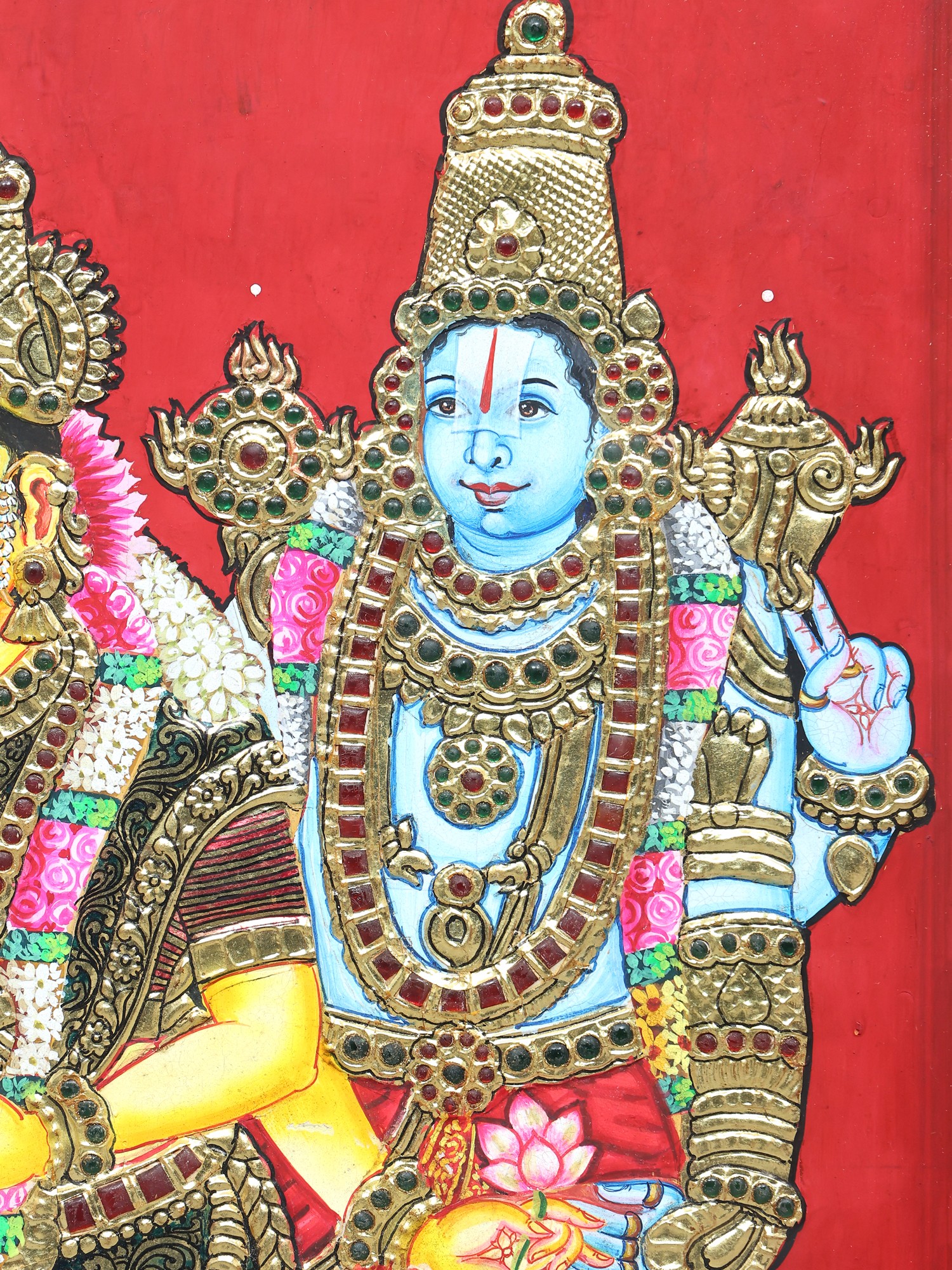 Goddess Rajarajeshvari (Tripura Sundari) with Embossed Kirtimukha Prabhavali | 24 Karat Gold Work | Vintage Framed Tanjore Painting