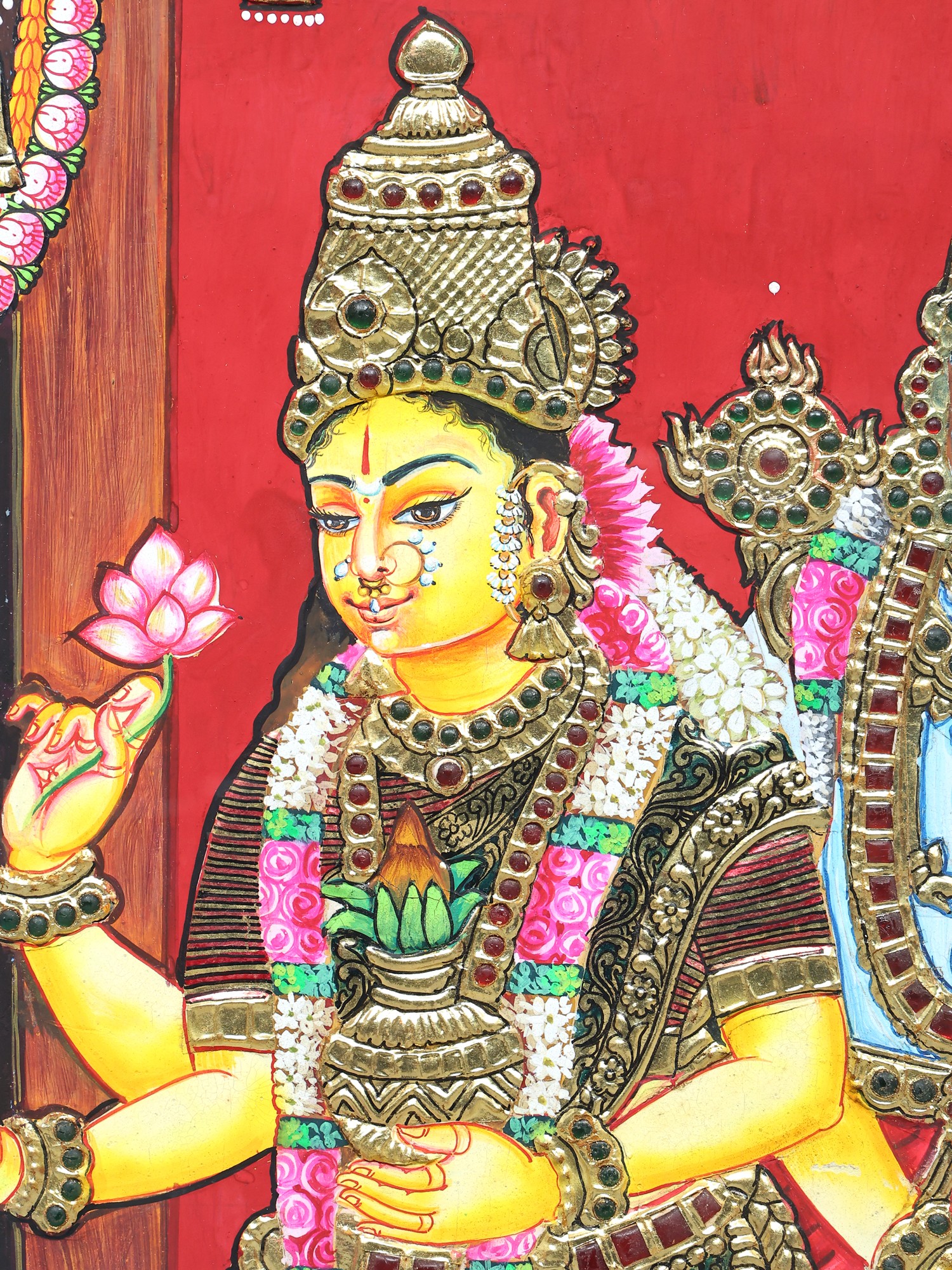 Goddess Gajalakshmi Seated on Lotus with Kirtimukha Arch | Traditional Colors with 24 Karat Gold | Tanjore Painting with Vintage Frame