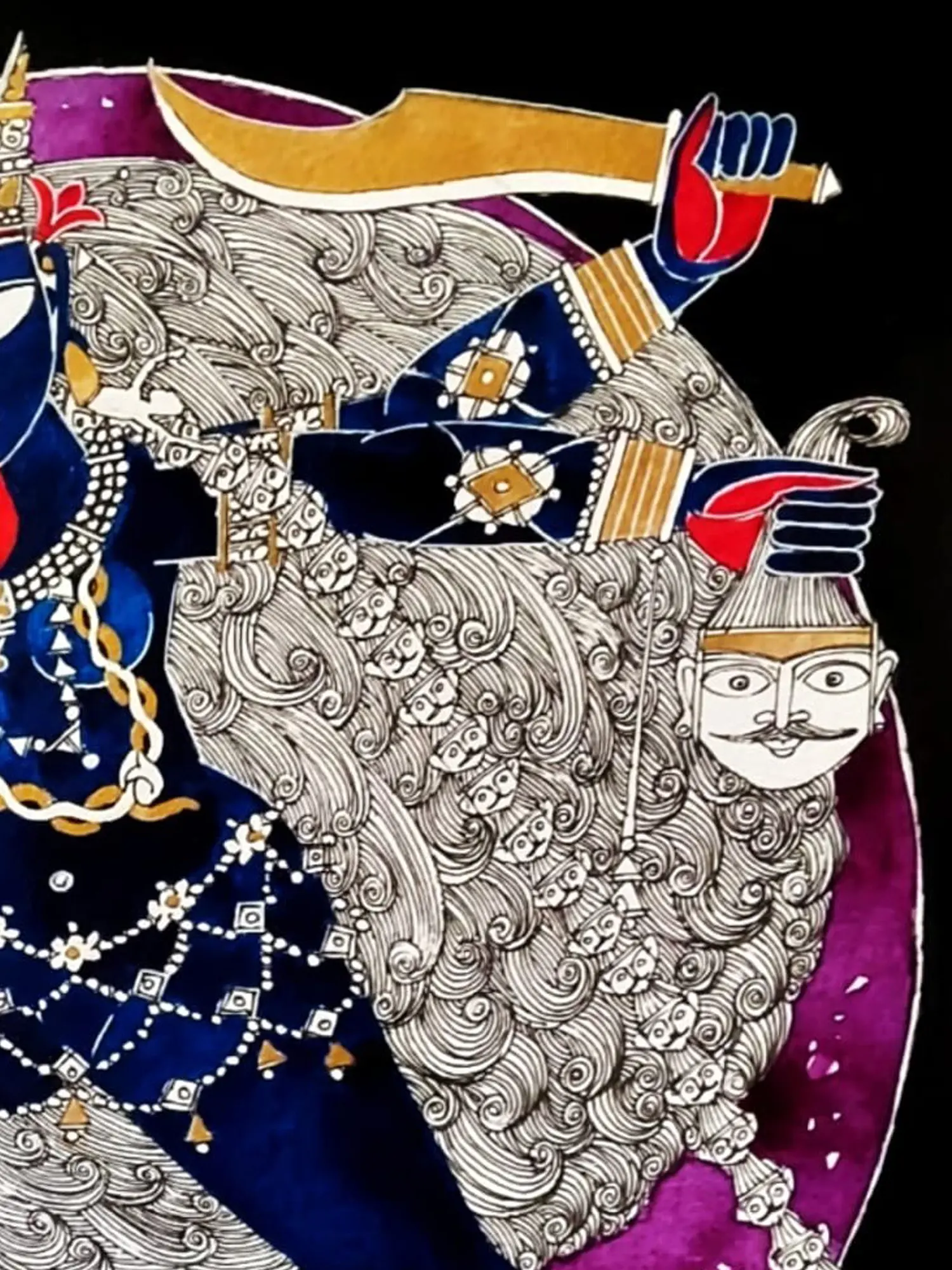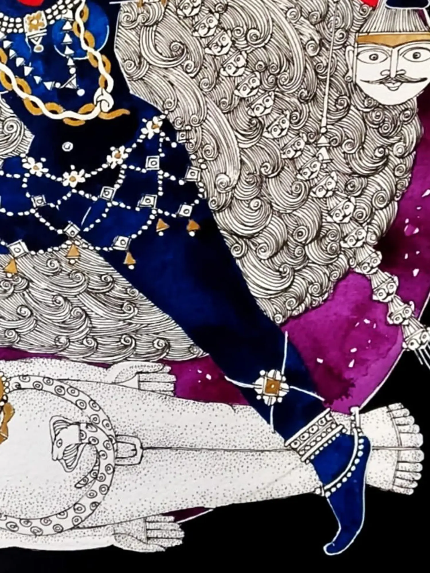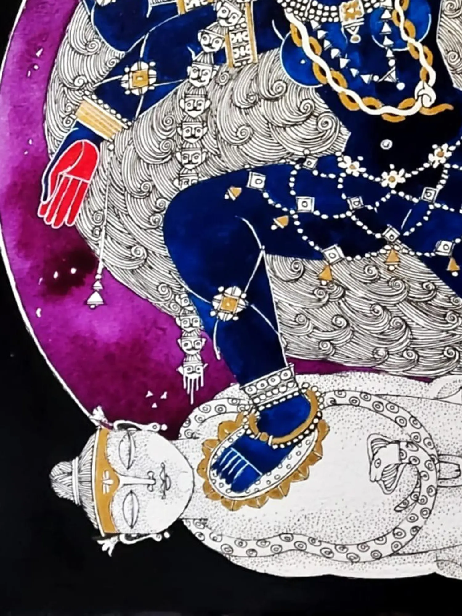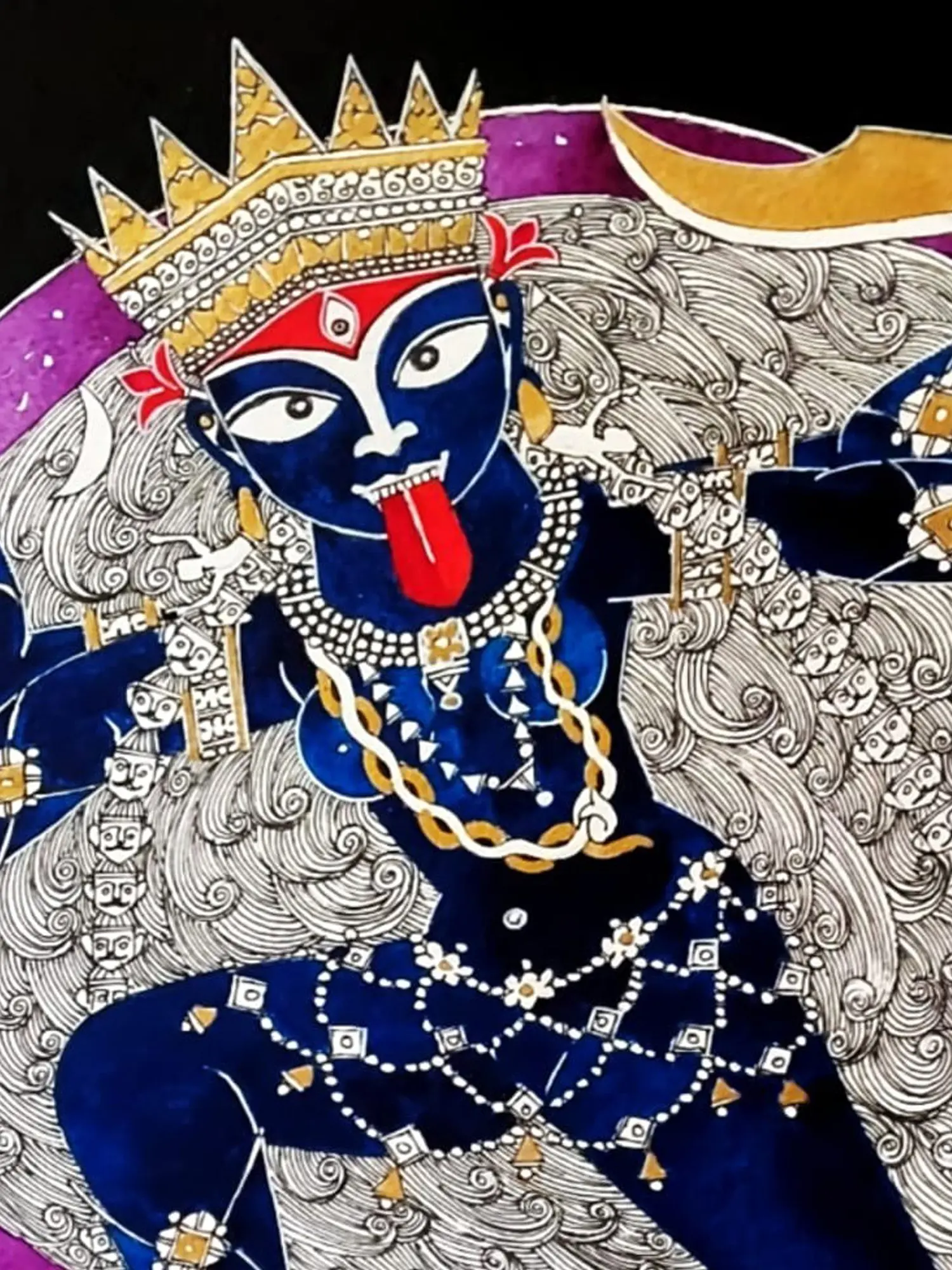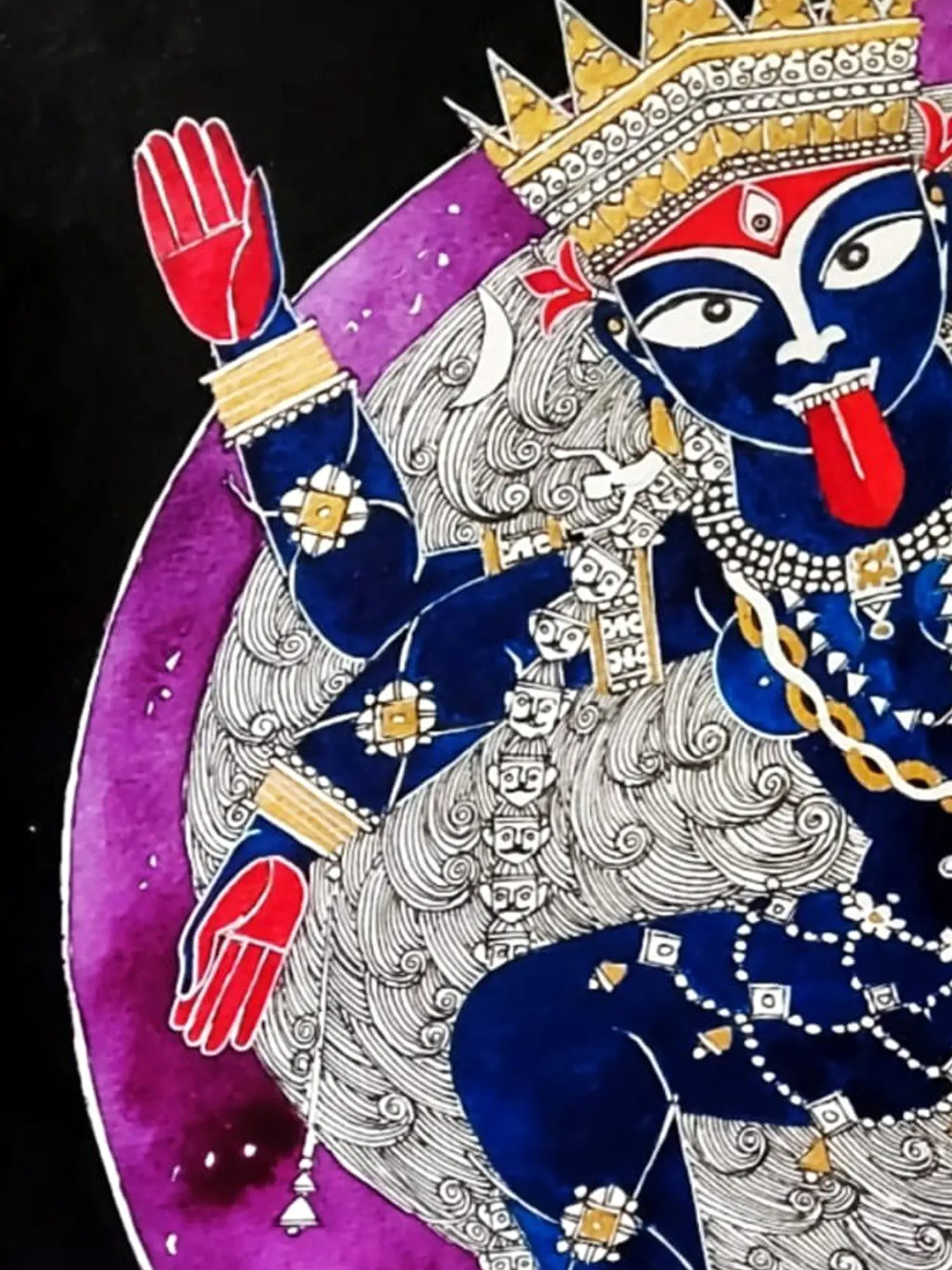 Her lotus feet are on the lotus of Shiva’s heart, who lies in self-surrender under the great mother. With perfection of lines and vibrant hues, the artwork carries a drama, which comes from its meticulous details. Whether it is the ethereal ornamentation of the goddess- her earrings made from the bodies of the demons she slays, or the blood dripping from the severed heads of her garland, or the contrast between Devi Kali’s enchanting dynamism and Shiva’s stillness, Samik De succeeds in evoking the riveting imagery of Kali on the battleground.