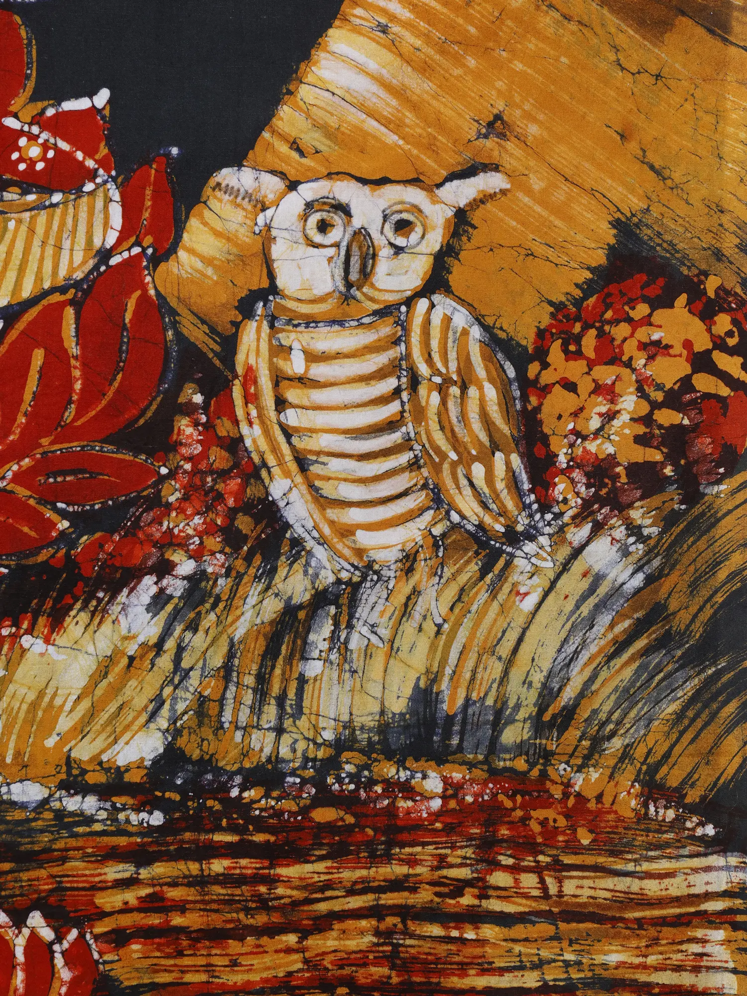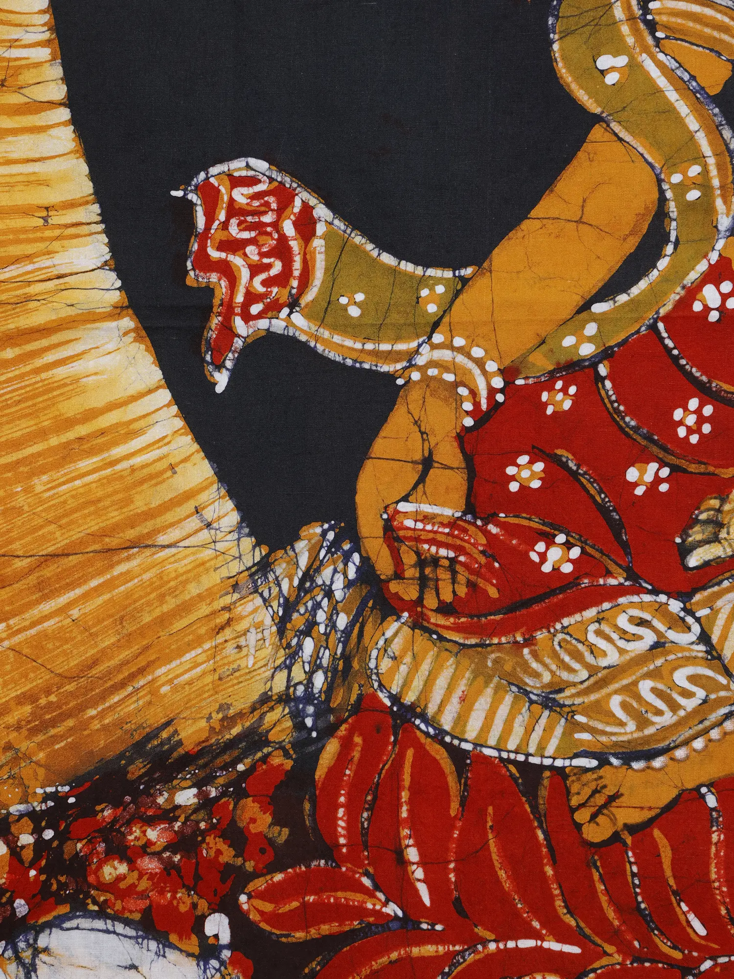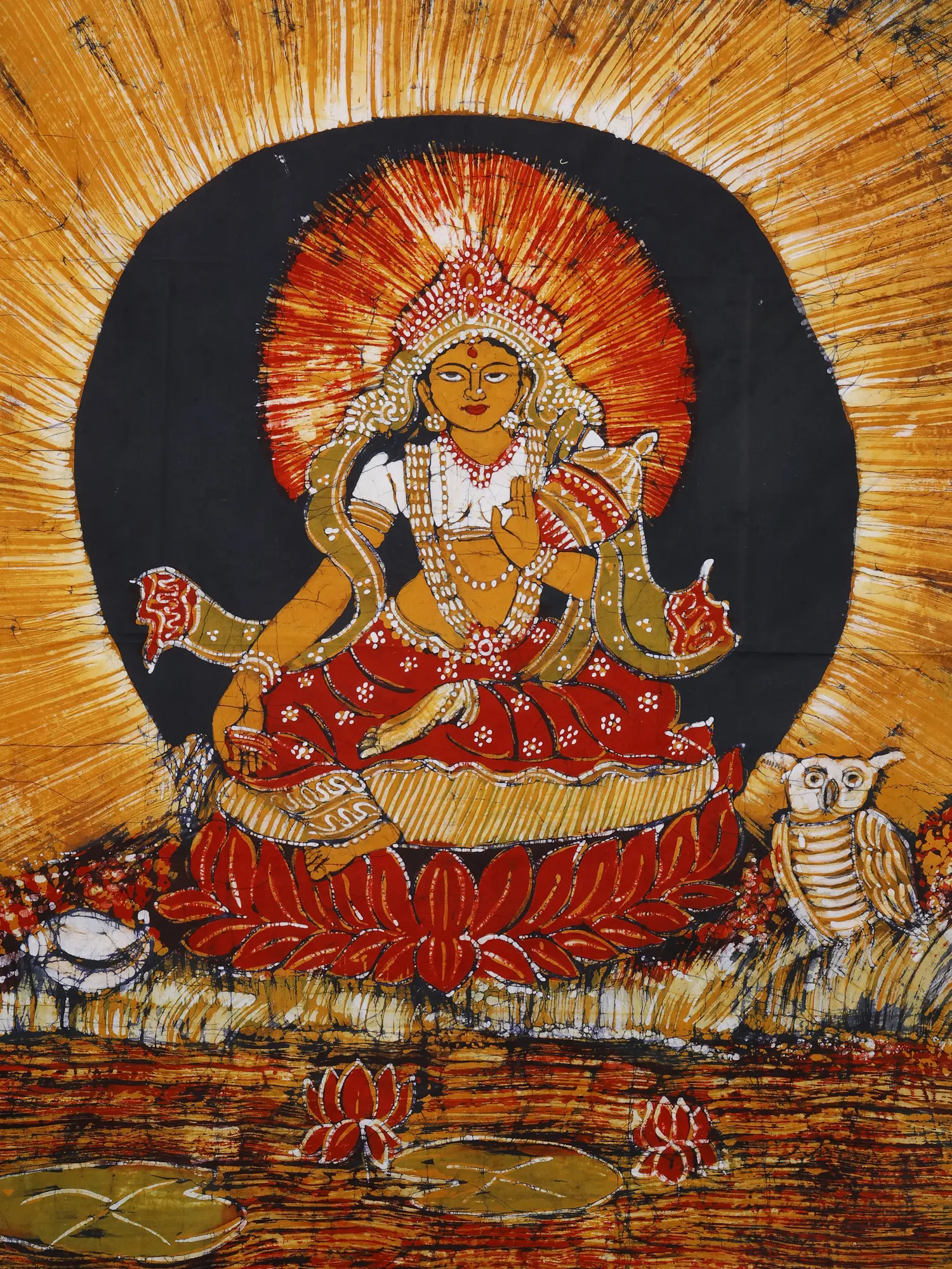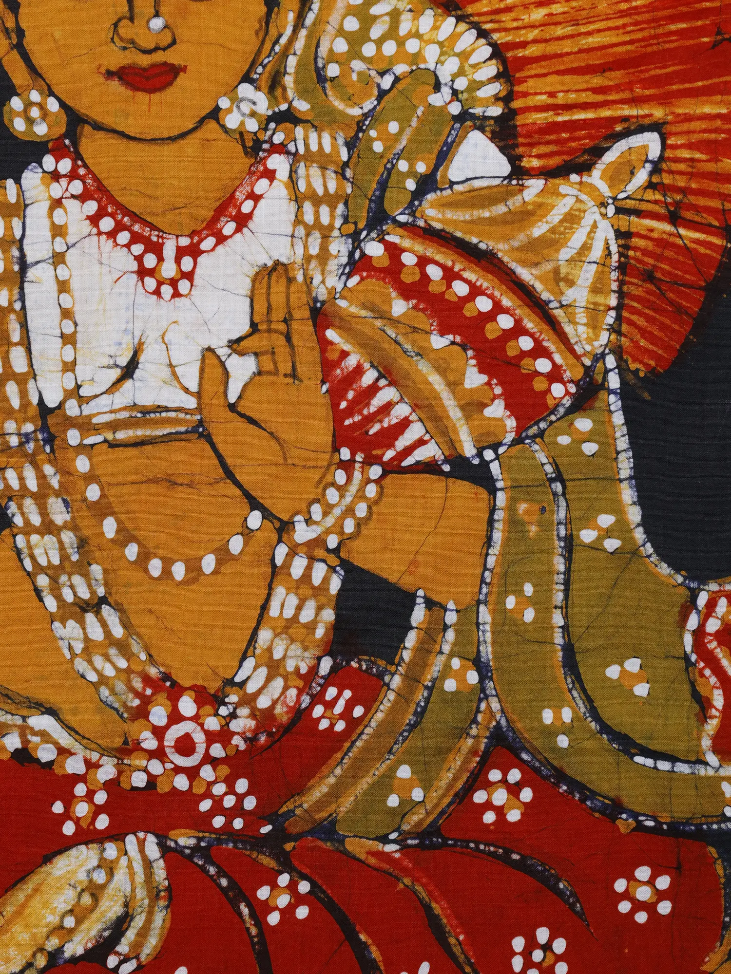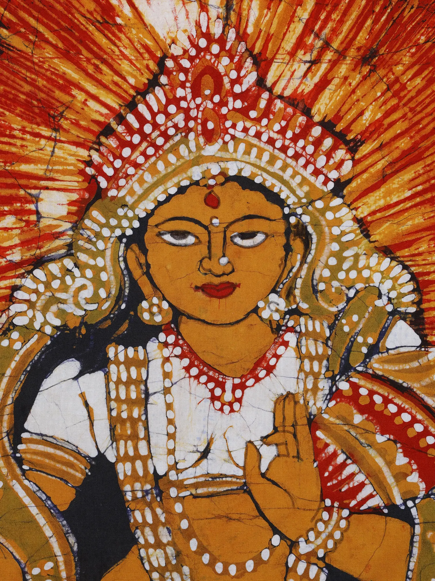 This divine goddess of wealth, fortune, love, prosperity and devotion is considered to be the favourite goddess in the Hindu pantheon; painted with the wax-resist dyeing technique on a super blooming double lotus pedestal, therefore also regarded as Padmavati.