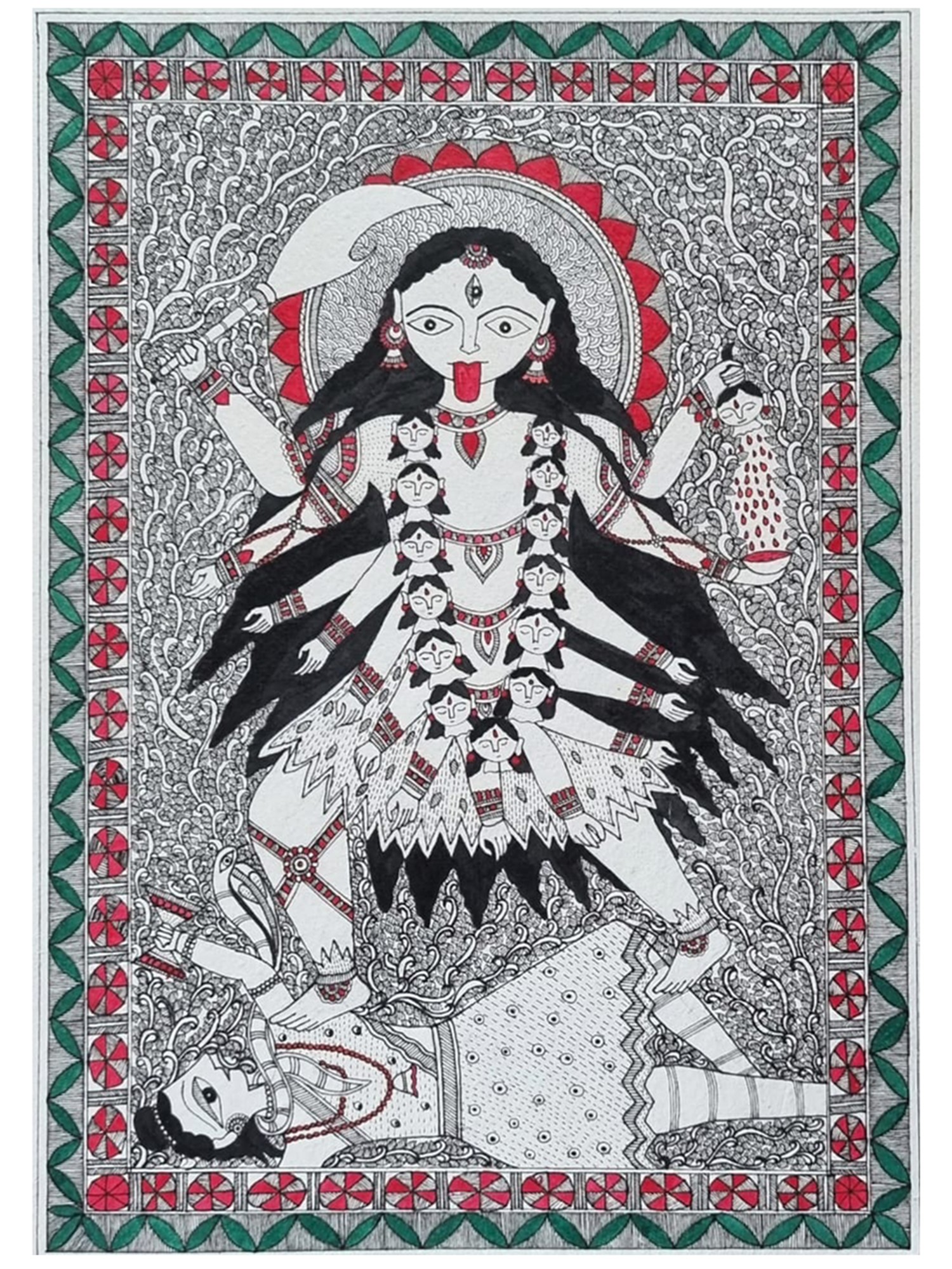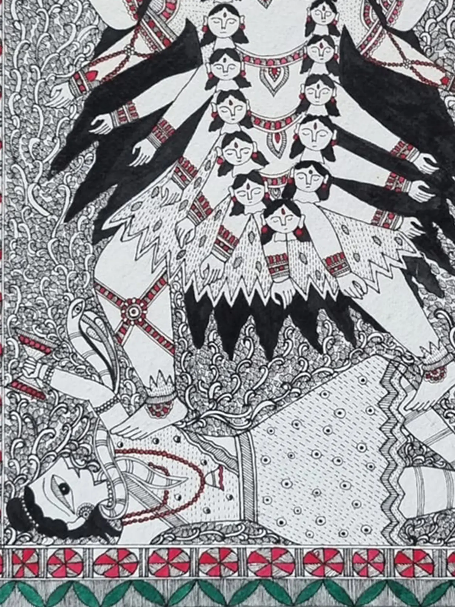 This painting is more than just a visual representation; it is an invocation of divine energy and a testament to the enduring power of traditional Indian art forms. It serves as a powerful reminder of the cyclical nature of existence, the triumph of good over evil, and the profound spiritual truths embedded within Hindu philosophy. Whether you are a collector of folk art, a devotee seeking a tangible connection to the divine, or an admirer of artistic craftsmanship, this rendition of Goddess Mahakali offers a captivating glimpse into the heart of Indian spiritual and artistic heritage. Its presence can bring a sense of powerful protection and profound contemplation to any space it graces.