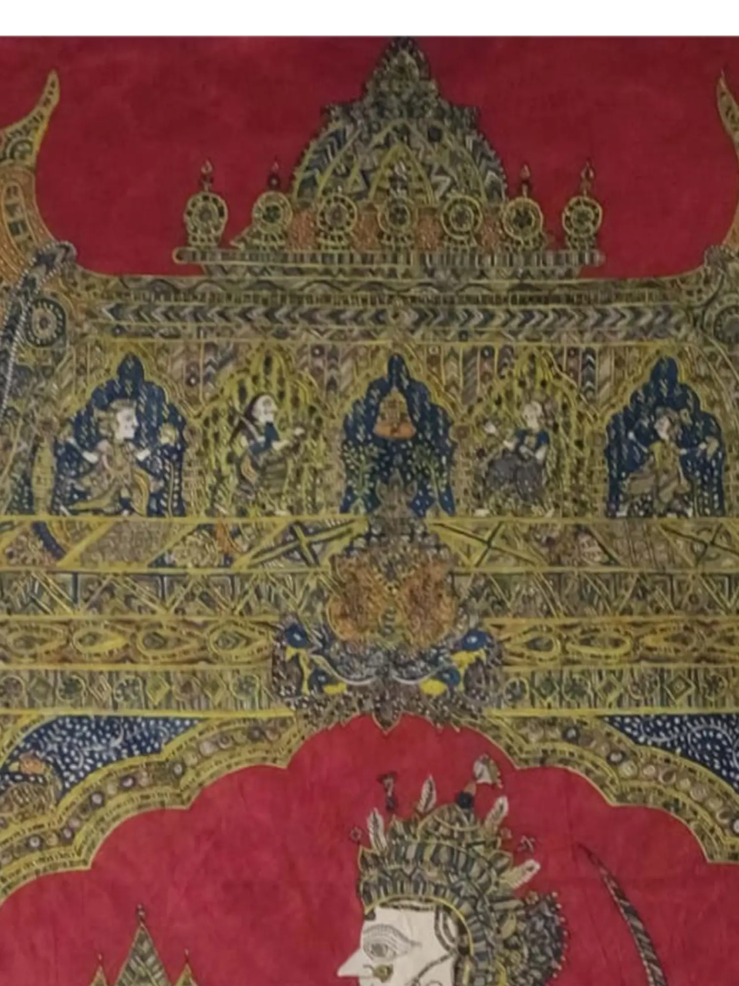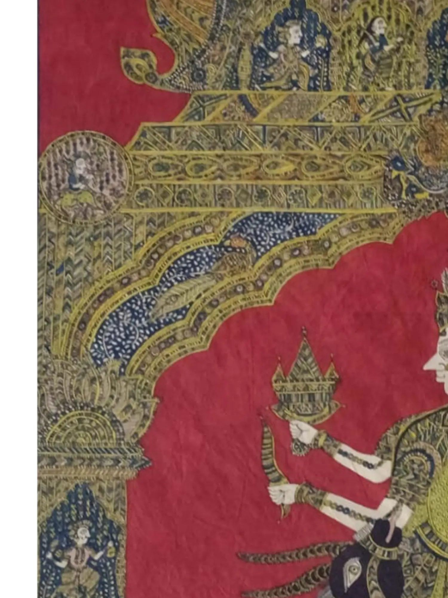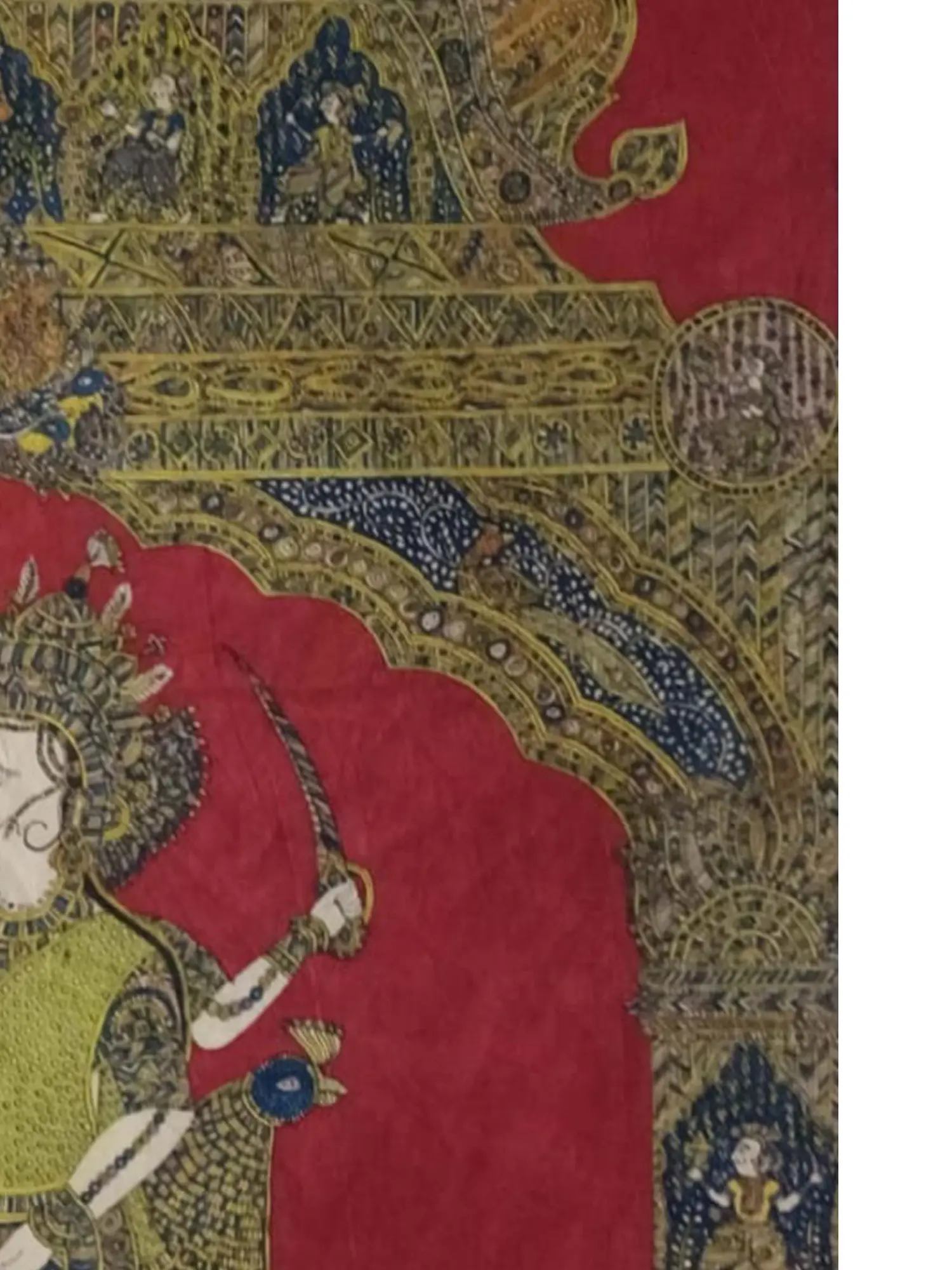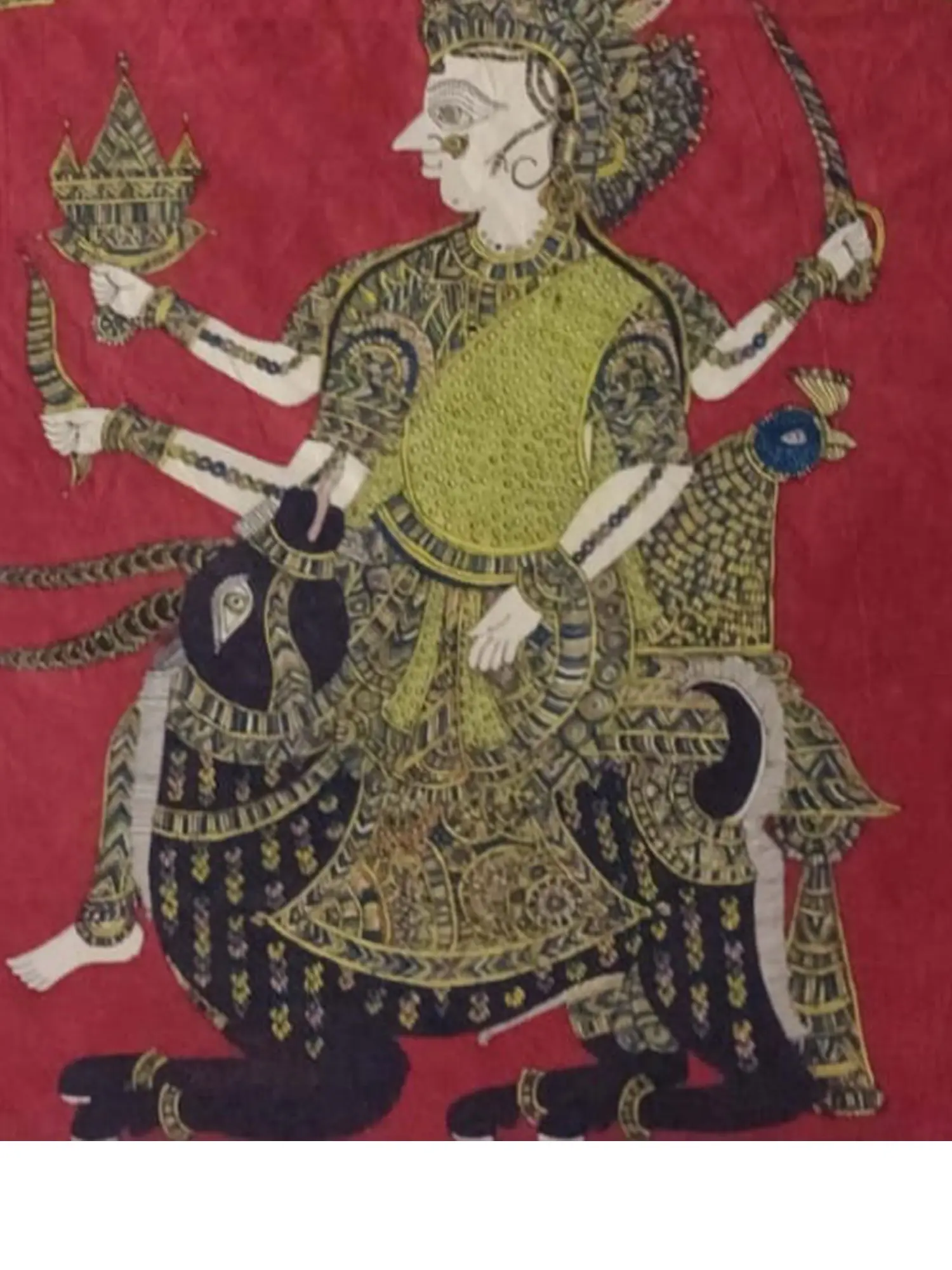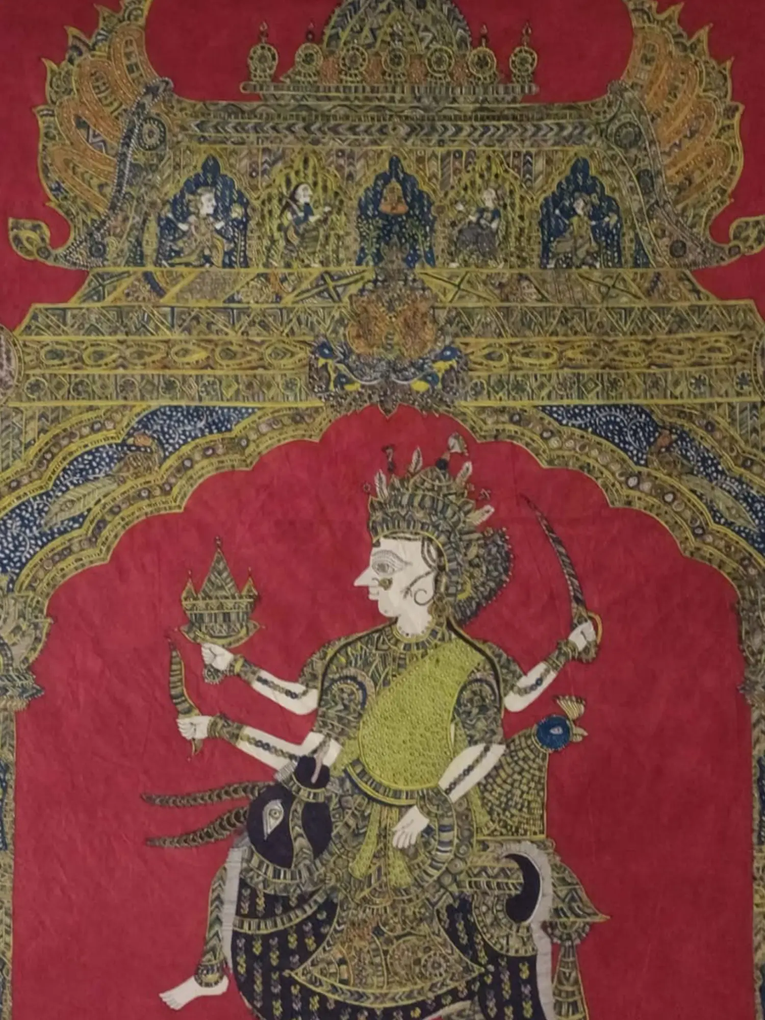 Enter the sacred realm of Mata Ni Pachedi, where the divine presence of Goddess Meldi and her faithful Vahana radiate timeless grace. Each brushstroke honours tradition, infusing the canvas with the reverence of ancient rituals. Created with natural pigments, this piece resonates with spiritual energy, inviting you to explore the depths of devotion and reverence. Let its colours weave a tapestry of faith and folklore, where every detail whispers of the divine connection between humanity and the divine.