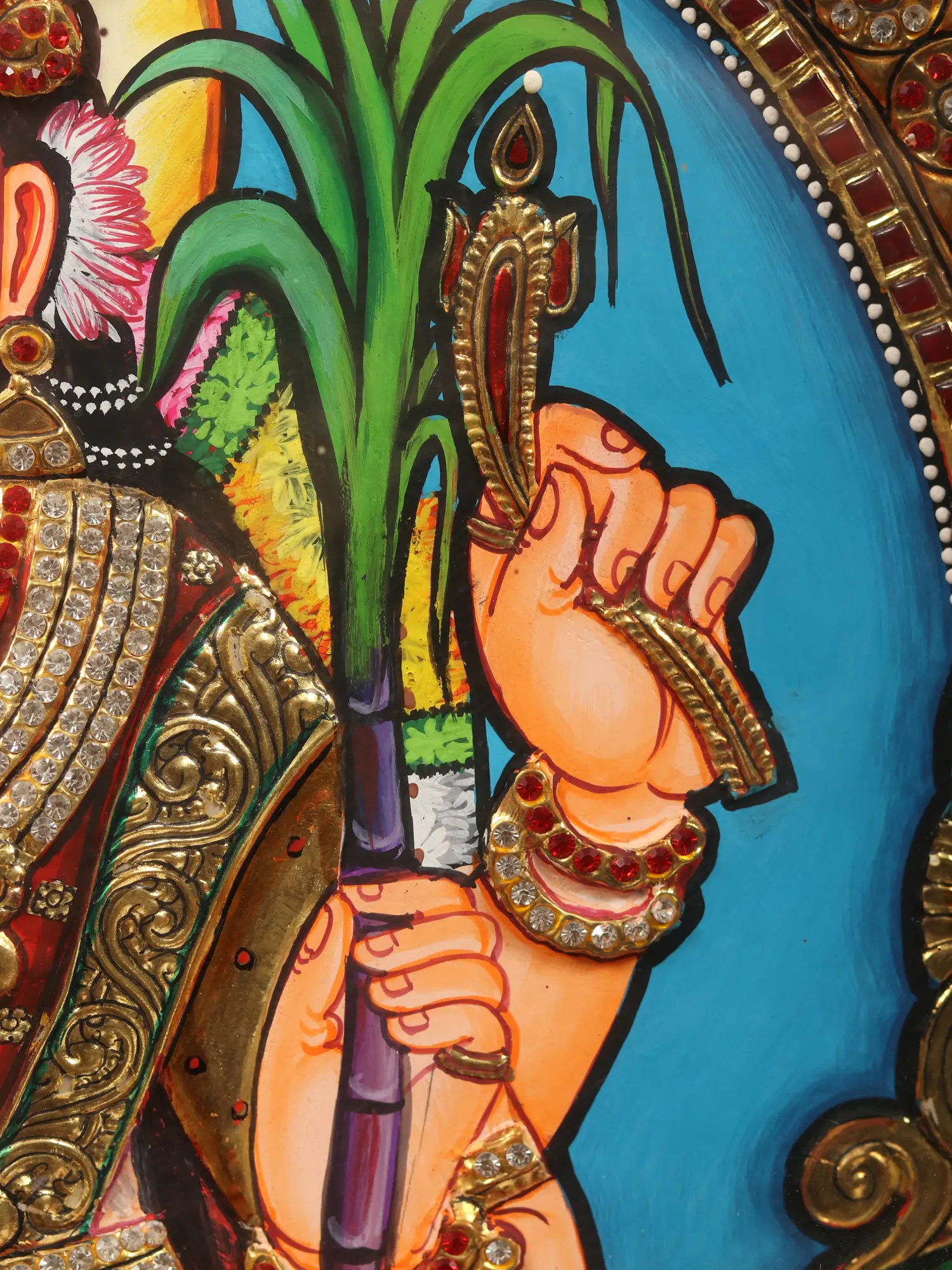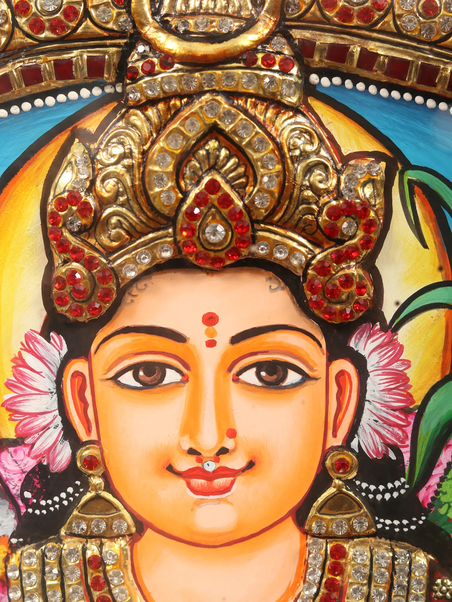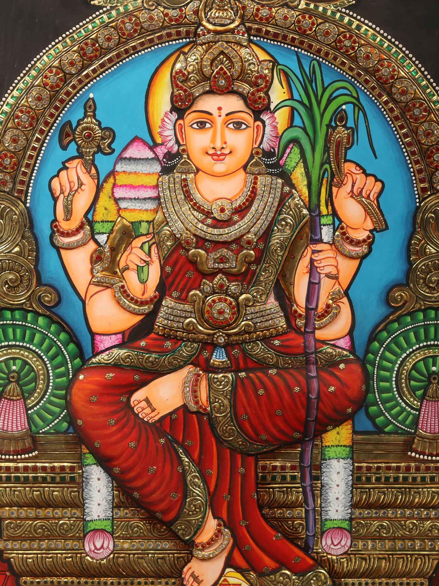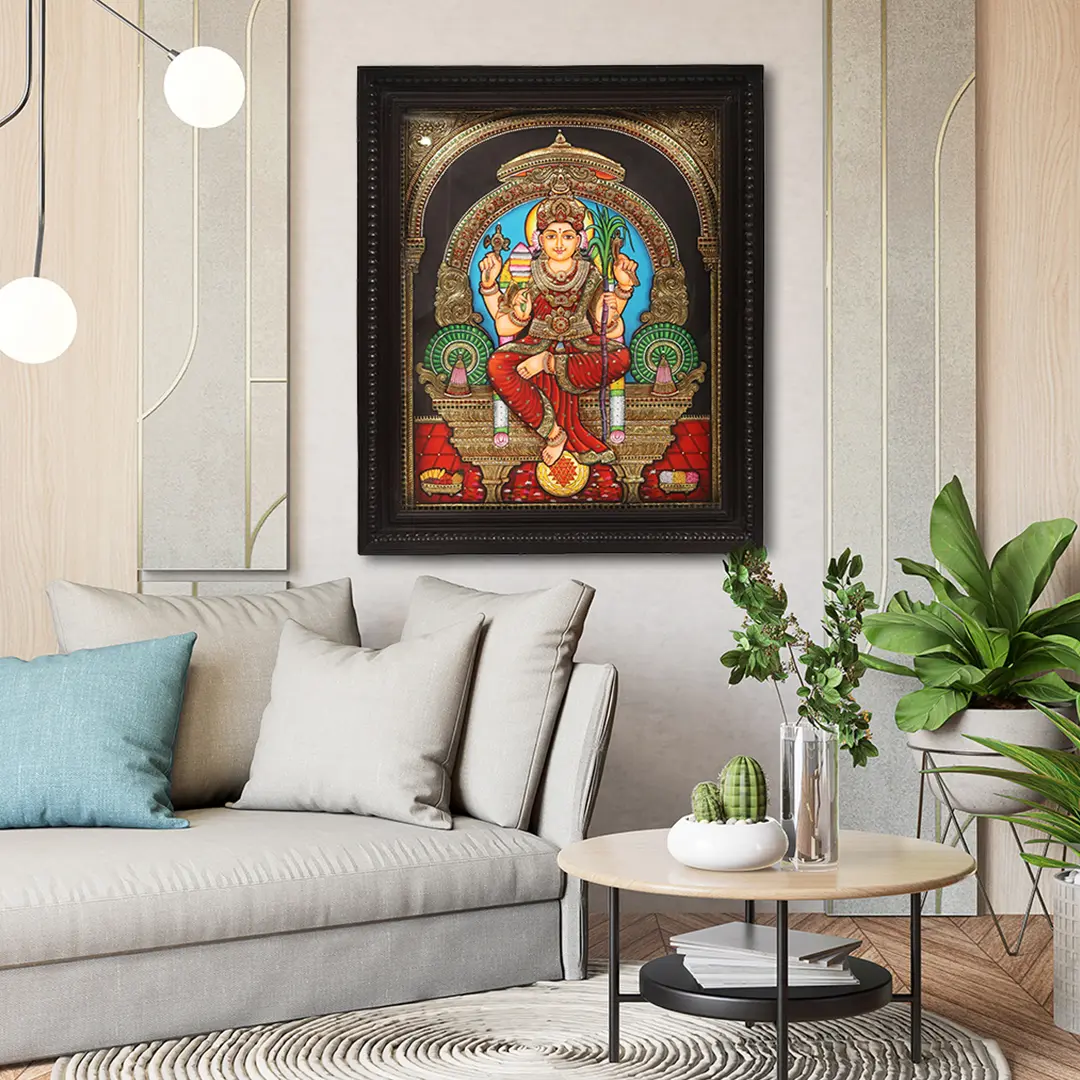 The hallmark golden embellishments of Tanjore's art perfectly reflect her persona as the deity who dwells in a jewel-encrusted city, symbolizing prosperity and beauty.