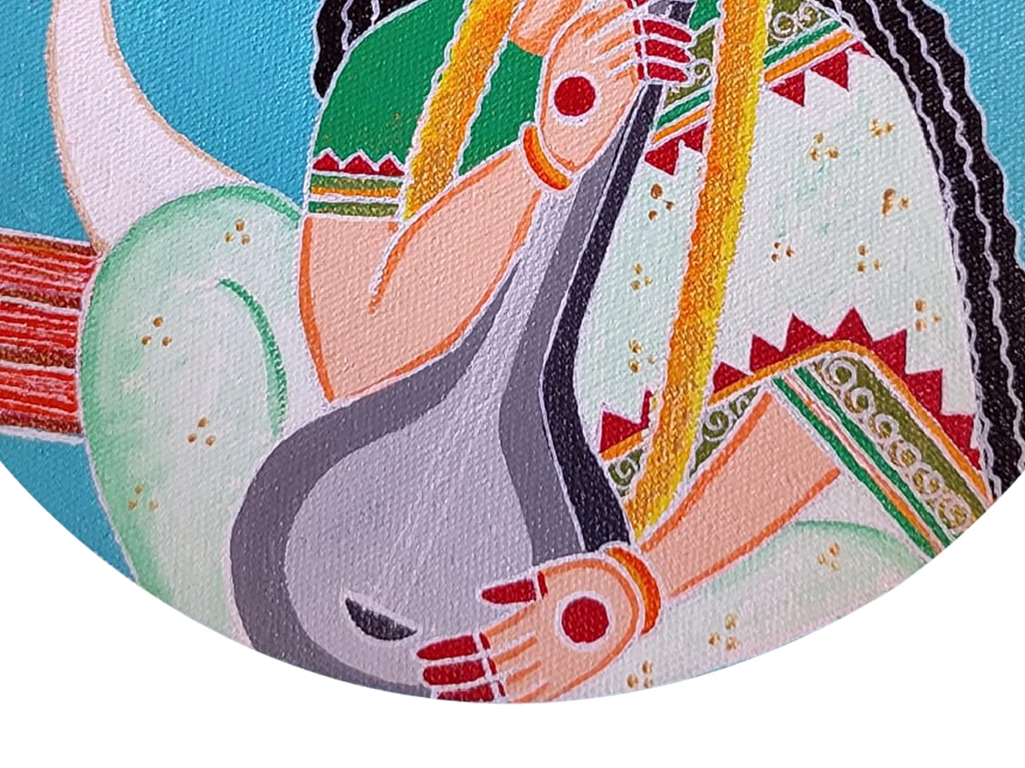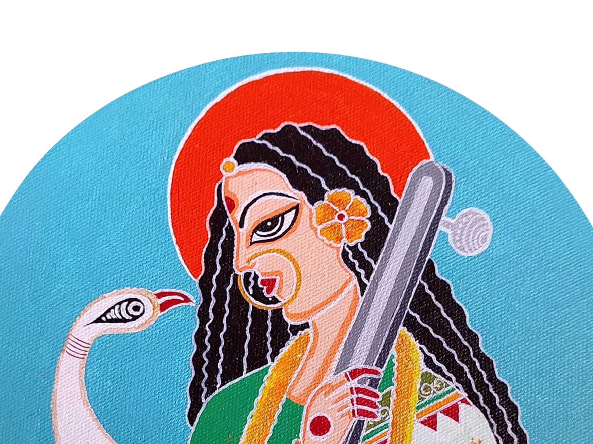 In this captivating masterpiece by Datta Jadhav, the Goddess of knowledge, music, and arts, Saraswati, graces the canvas, bedecked in ethereal beauty, cradling a sitar with serene grace, while a graceful swan glides nearby. Symbolising the harmonious blend of creativity and wisdom, this artwork speaks volumes about the pursuit of knowledge and artistic expression. It invites you to immerse yourself in the serene aura of Saraswati, drawing inspiration from her divine presence.