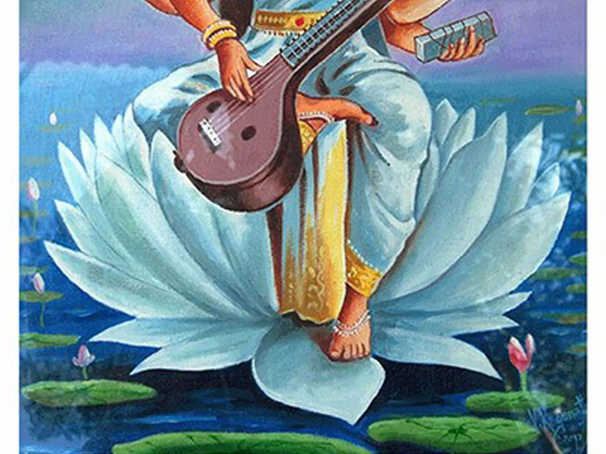 Goddess Saraswati is a captivating presence in oil on canvas, embodying wisdom and artistic expression. The oil strokes delicately portray the goddess of knowledge, music, and arts, inviting viewers to bask in the aura of enlightenment. The canvas becomes a sacred space where Saraswati's divine energy flows through the strokes, inspiring creativity and intellectual pursuits.
