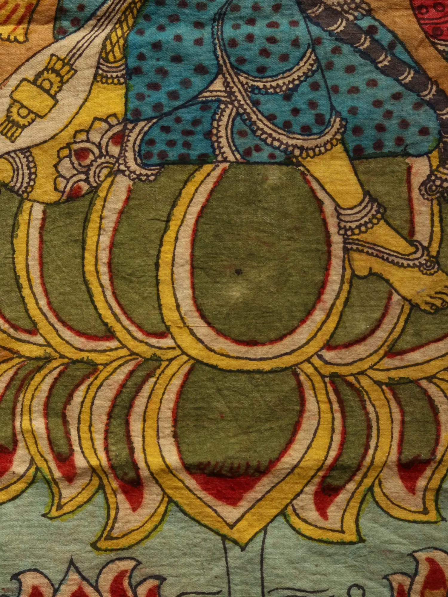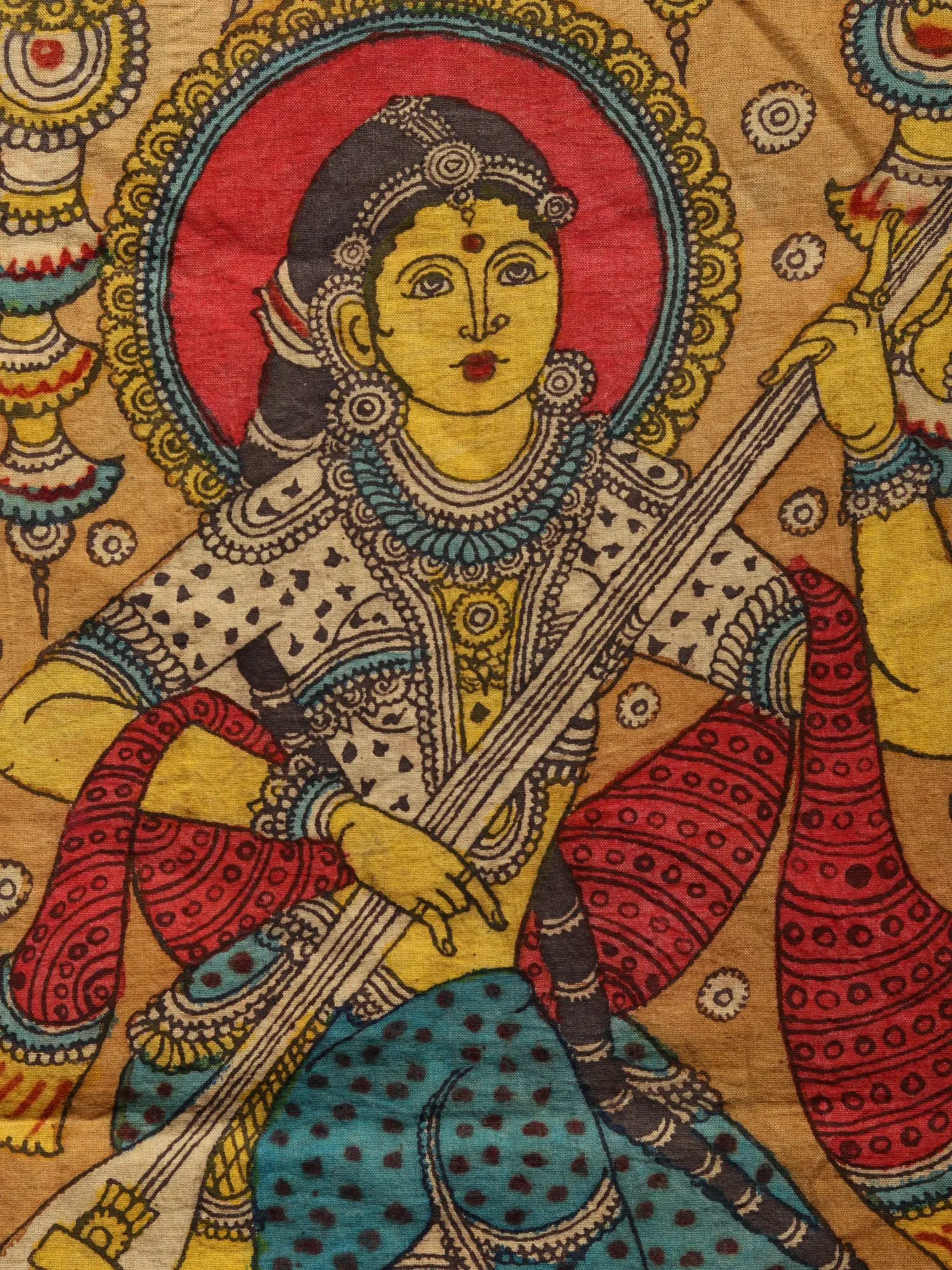 This masterpiece manifests Saraswati's celestial presence and also, through the harmonious composition, exalts the beauty of the goddess, turning the cotton canvas into a mesmerizing tapestry of divine elegance and artistic finesse.