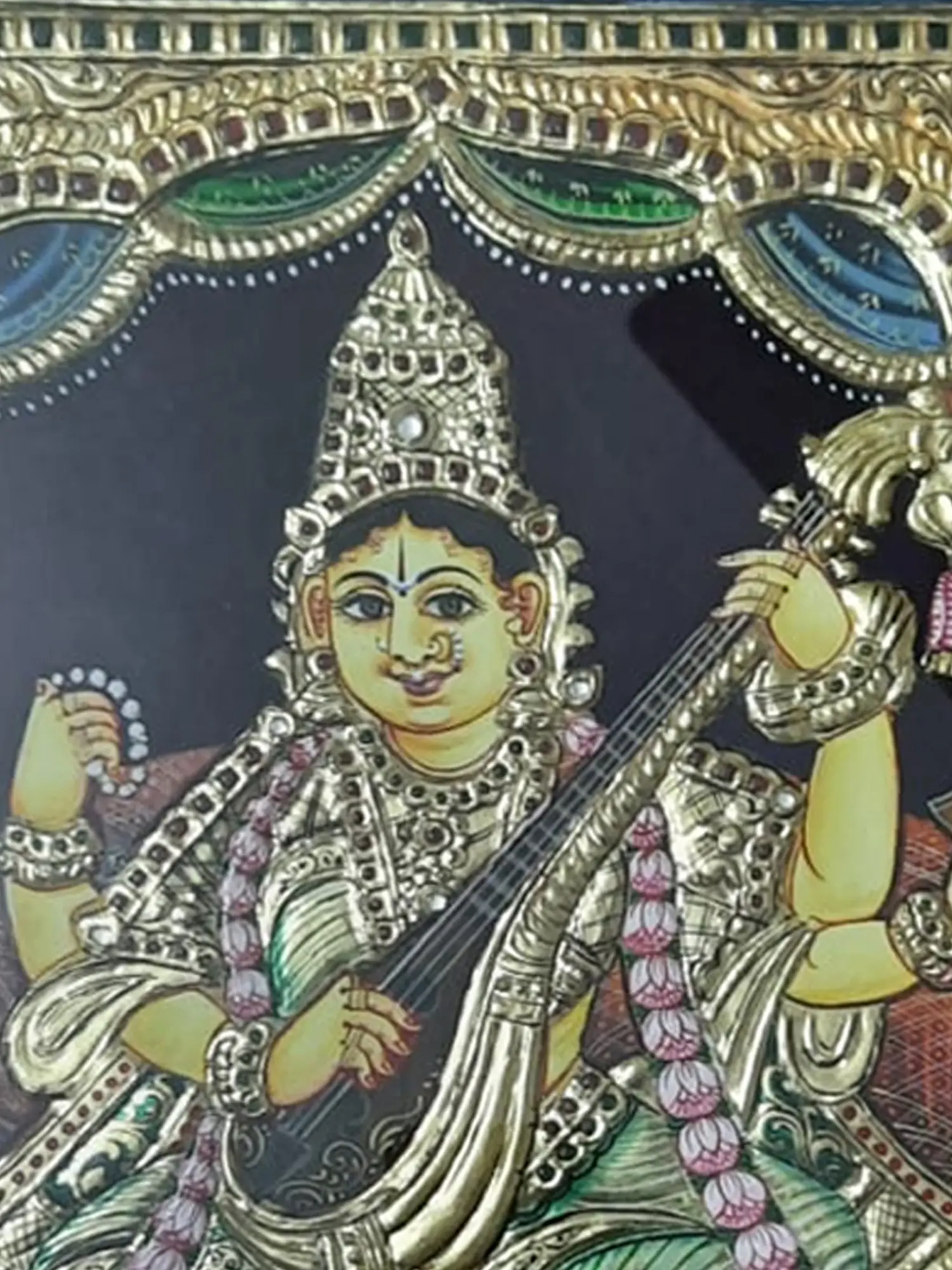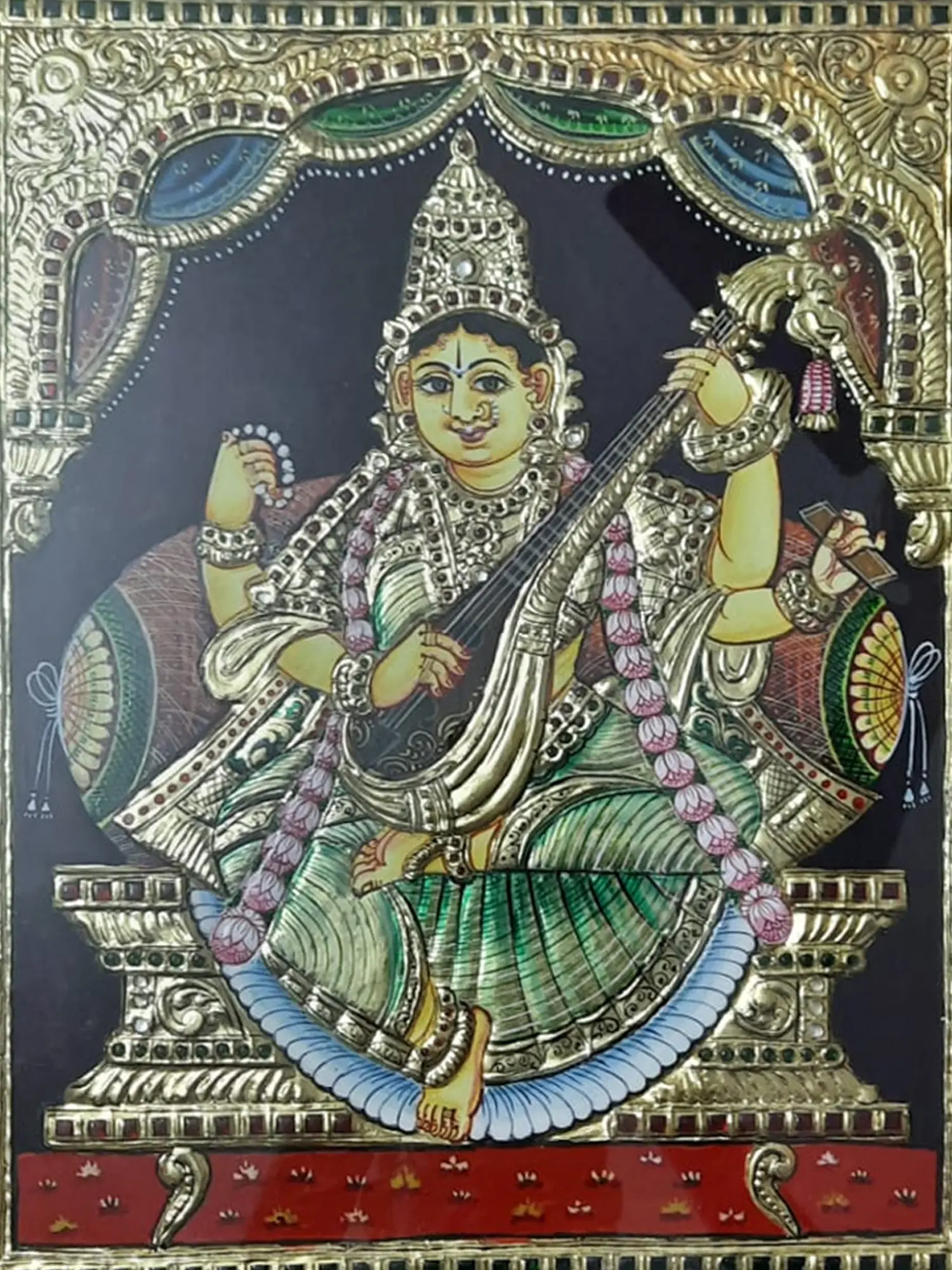 The smiling face of Devi Saraswati animates the Tanjore, giving it a divine aura that is enhanced by 22-karat gold work and complementing colors used in painting finer details.