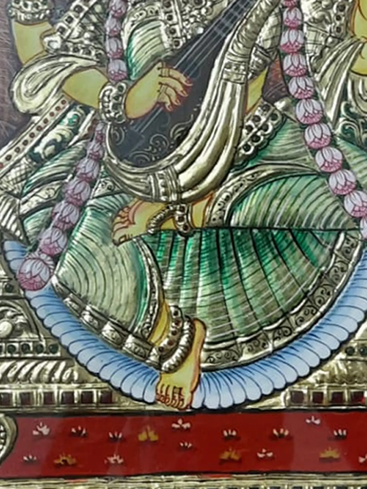 Painted in the traditional style of Tanjore art, this painting of goddess Saraswati depicts the Hindu goddess in a regal pose, seated on a throne with a large bolster, adorned with a golden saree, playing her Veena, representing a form revered as “Veenavadini”.