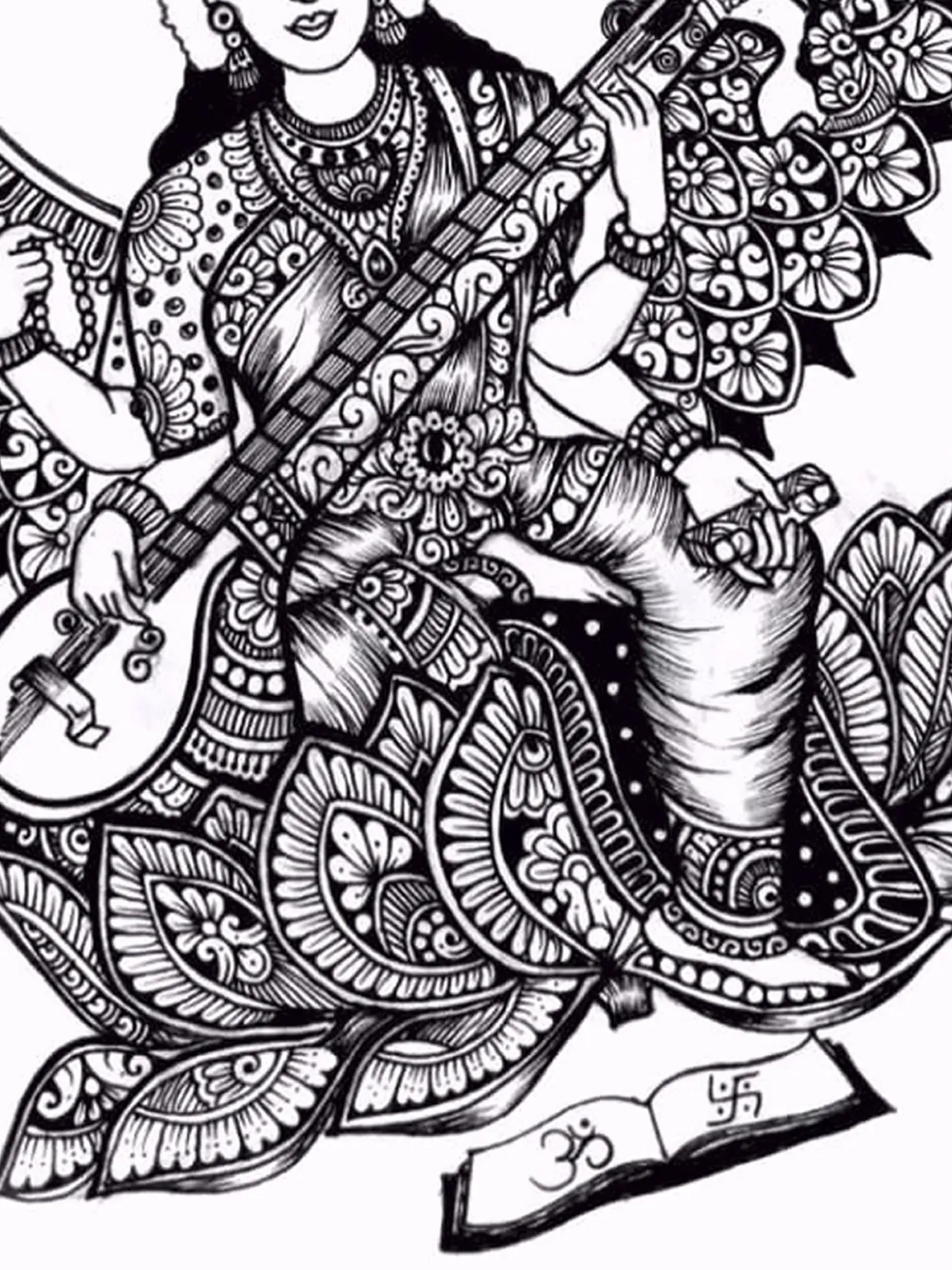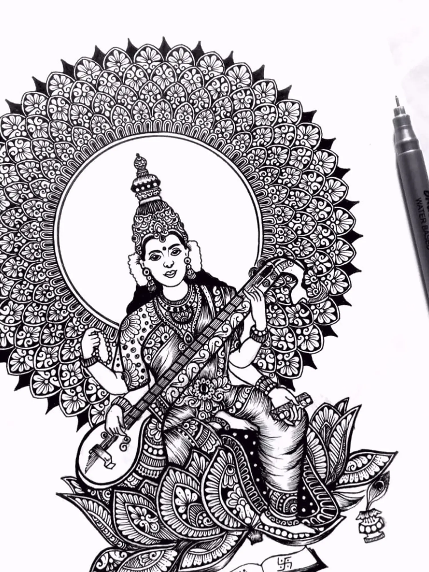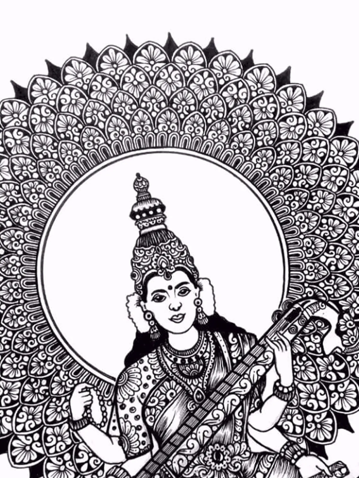 Experience divine grace with our Goddess Saraswati Seated on a Lotus painting. Enveloped in a mandala arch, the goddess of wisdom and creativity radiates serenity and power. Adorned with details, the lotus symbolises purity and enlightenment, while Saraswati's presence evokes inspiration and knowledge. Each brushstroke captures the essence of divine grace, inviting reverence and contemplation.
