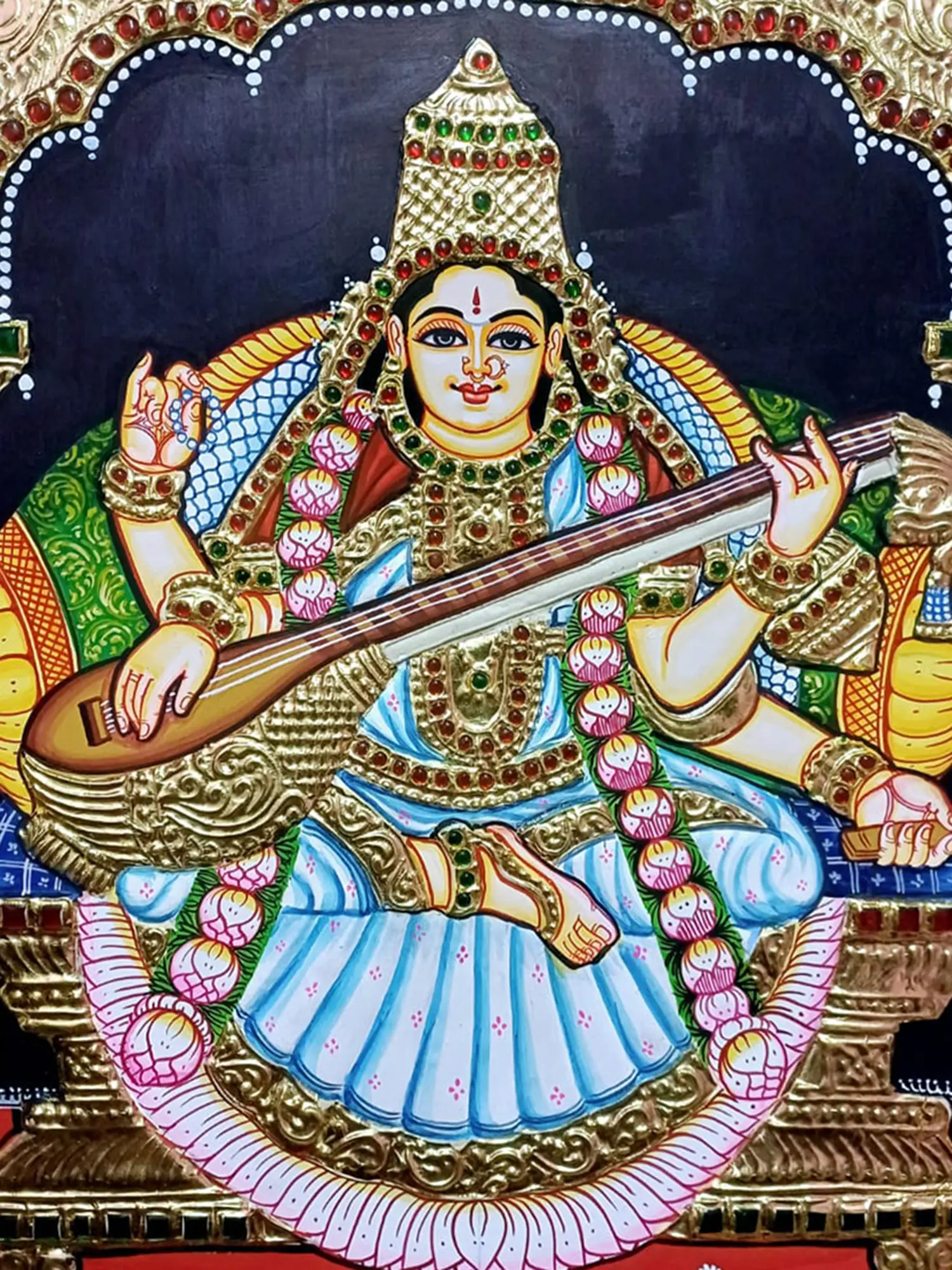 Veenapani- holding the Veena in her hands, is a classic imagery of the Hindu goddess of wisdom, Devi Saraswati, who appears as a divine queen in this glowing Tanjore painting.